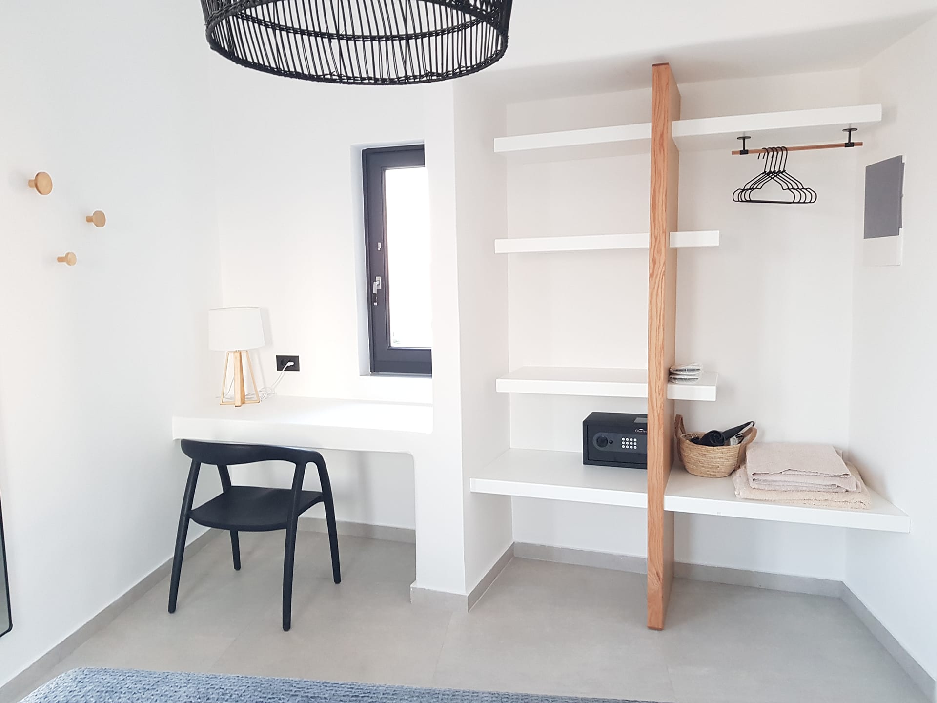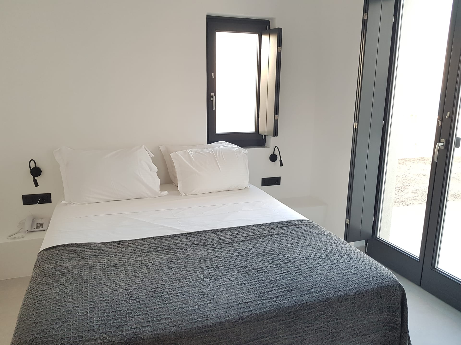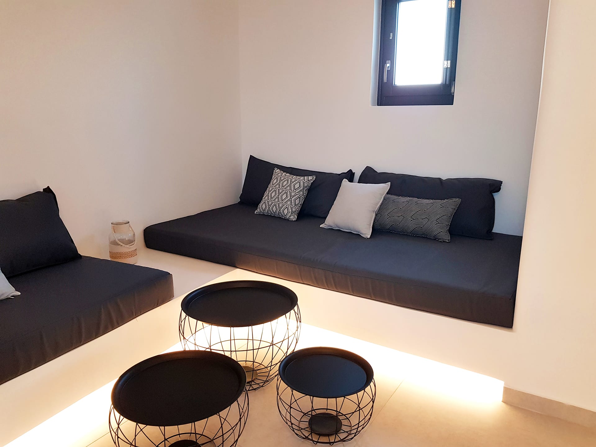 Lithos Deluxe Suites enjoy unique views of the pool and the Aegean Sea. Consisted of a bedroom with a double bed, a living room with 2 sofa beds and a private veranda capture the sense of cyclades. Elegantly furnished in a minimalist style, each can accommodate two adults or two adults and two children in comfort.