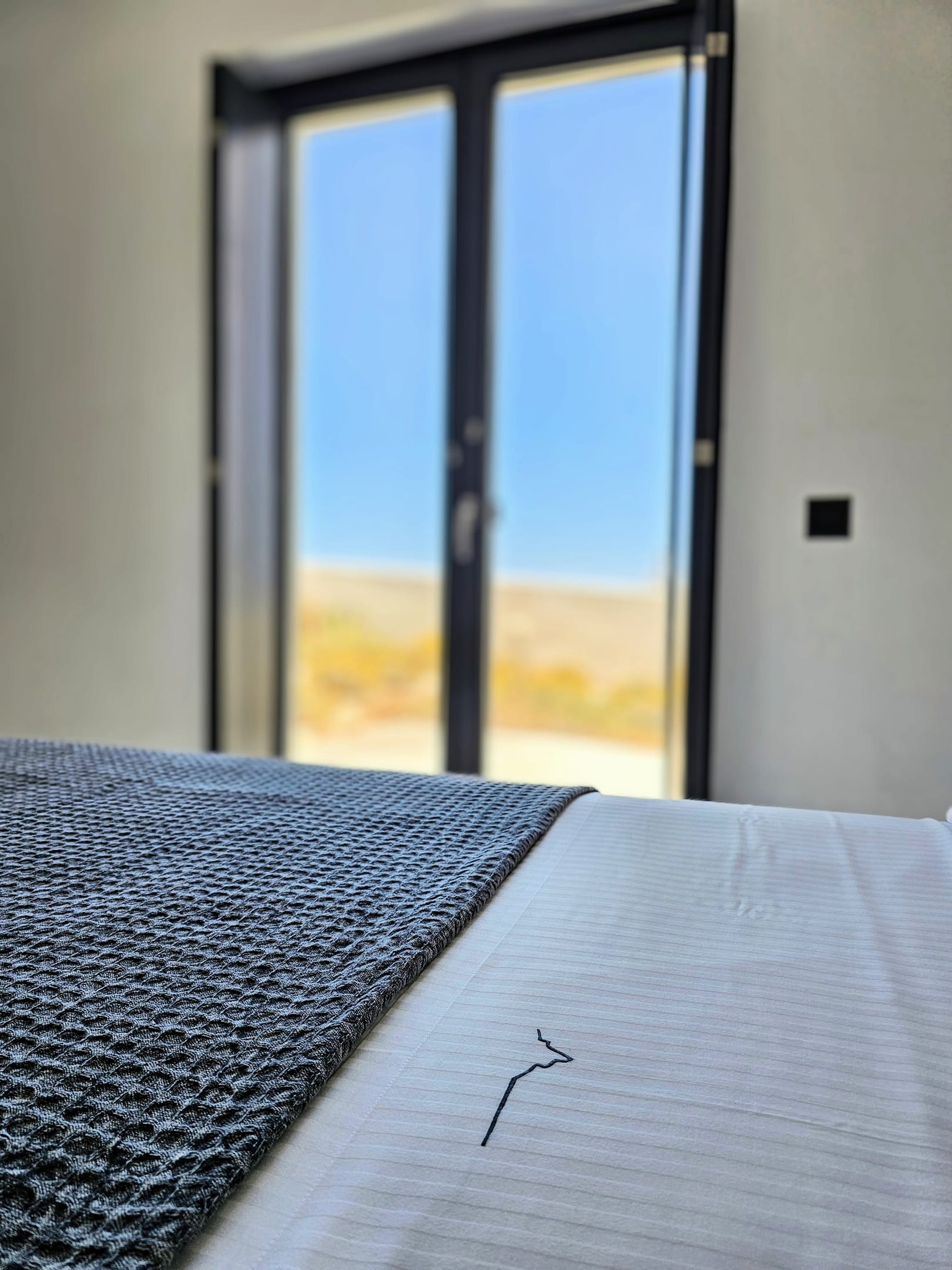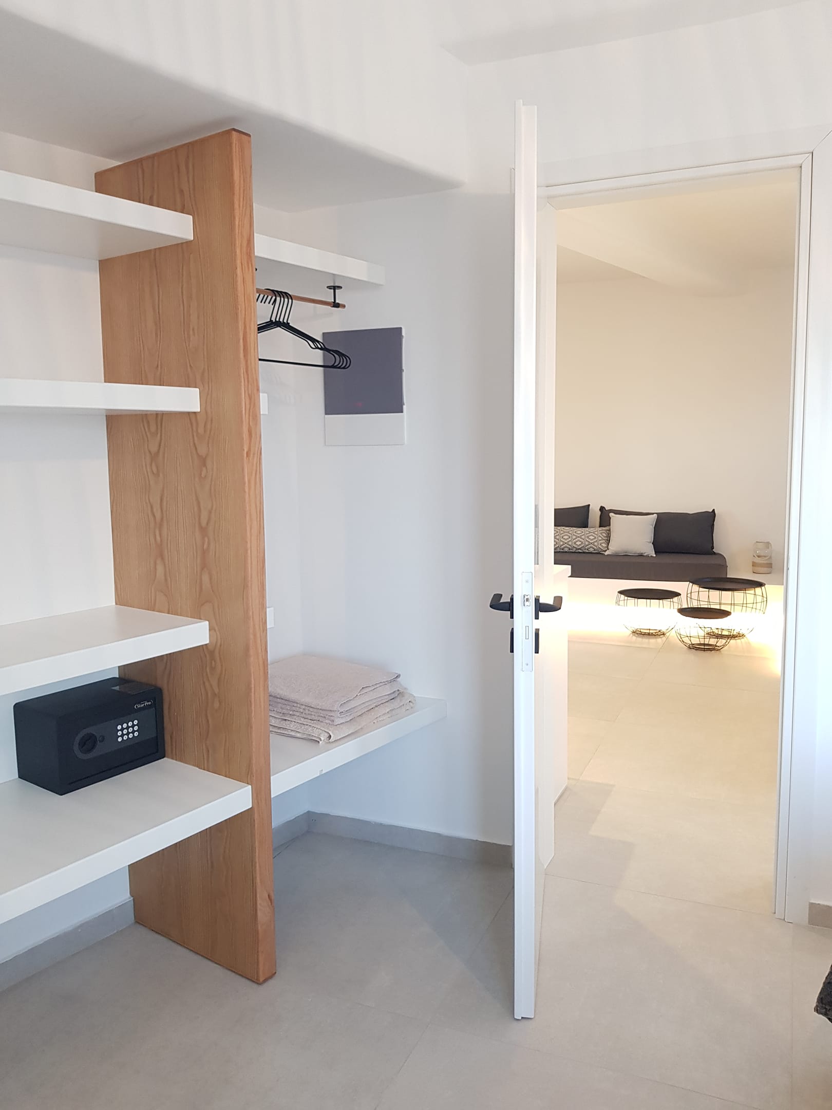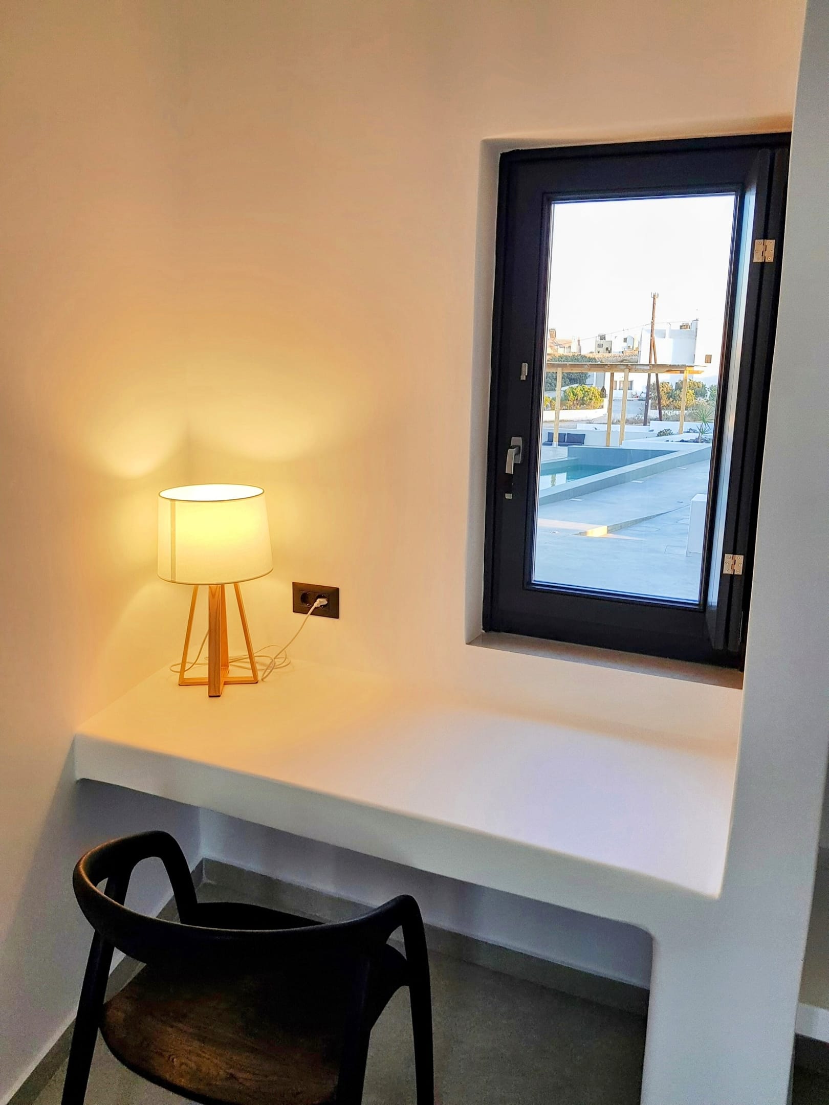 Lithos Deluxe Suites enjoy unique views of the pool and the Aegean Sea. Consisted of a bedroom with a double bed, a living room with 2 sofa beds and a private veranda capture the sense of cyclades. Elegantly furnished in a minimalist style, each can accommodate two adults or two adults and two children in comfort.