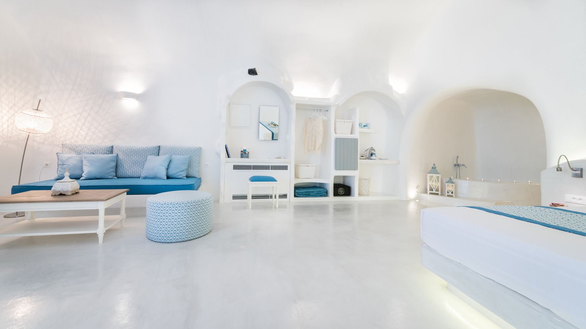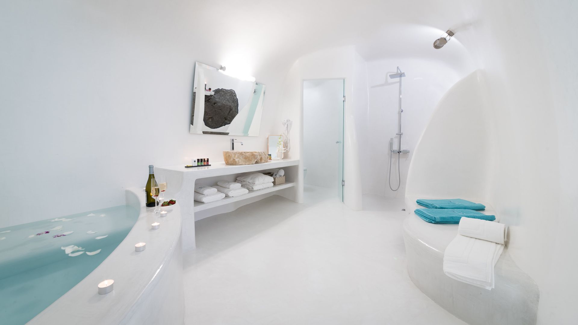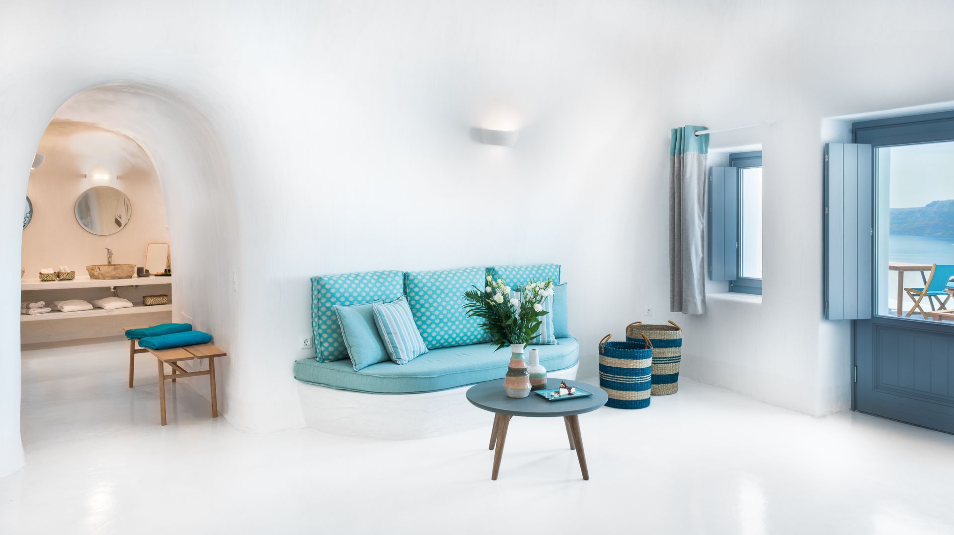 Our Deluxe Villa is a special escape of 50 square meters, with huge balconies and an outdoor area of extra 25 square meters. The outdoor heated plunge pool with jets, the comfy sun loungers and other furniture allow you to sunbathe and enjoy your cocktail, relishing the fabulous sunset views and the horizon. The pure sense of luxury in an inspiring ambience is what this villa is all about, with a plethora of special amenities .