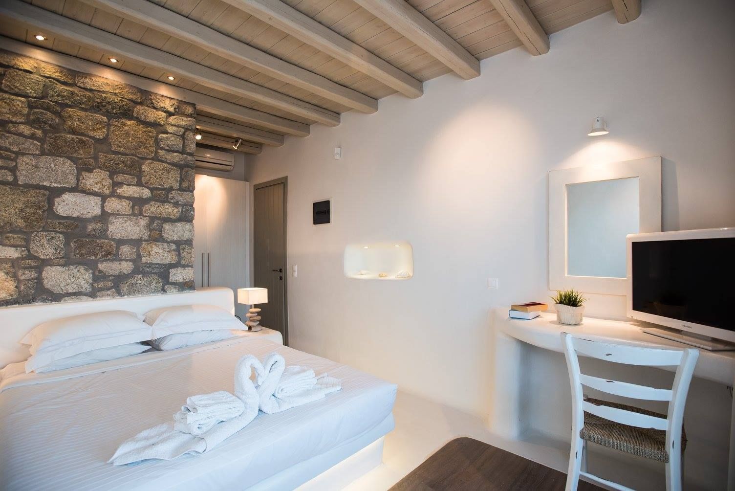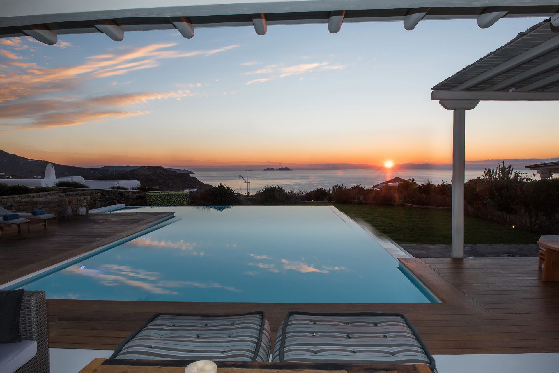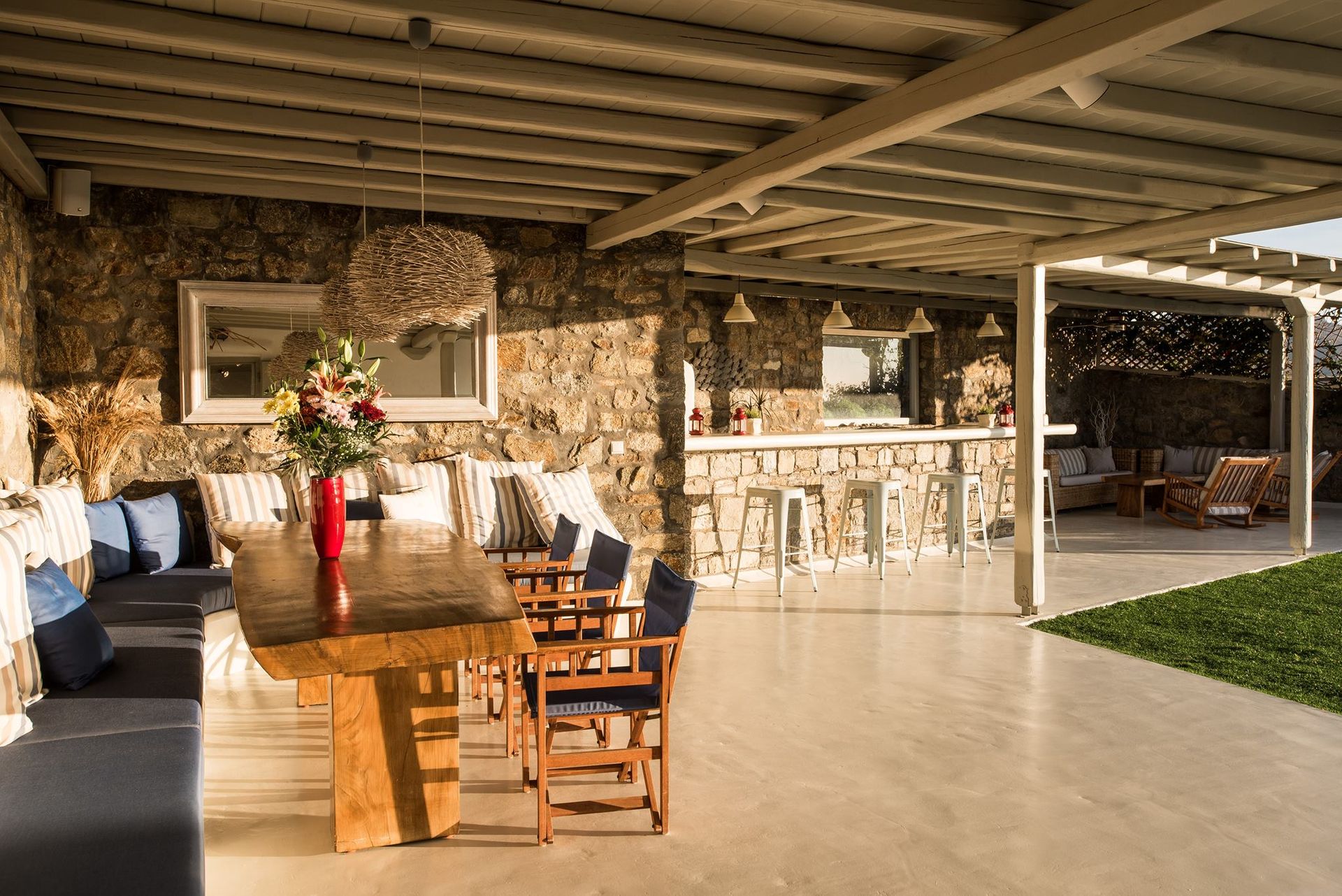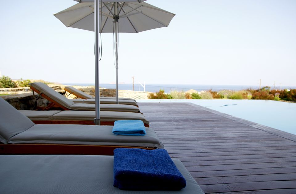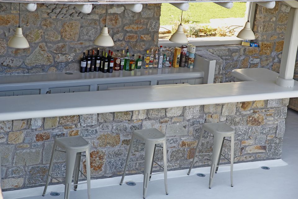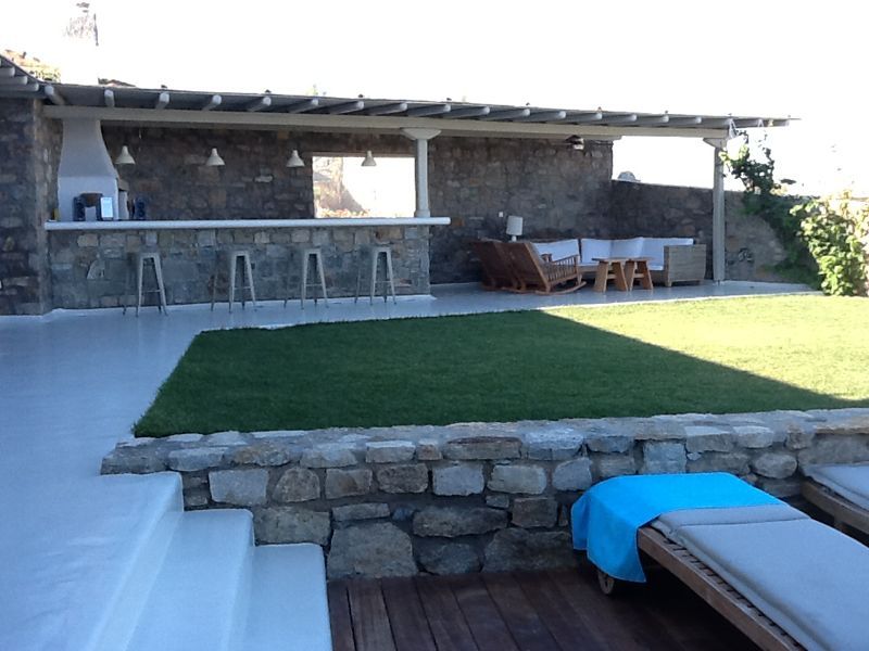 At Villa Azzurro you will be able to enjoy your time at the most beautiful organized beaches on the Greek Island of Mykonos, located a short stroll away, and at the new and sophisticated heated swimming pool, fitted with: A pampering Jacuzzi hot tub right next to the pool | A fully accessorized outdoor kitchen | A modern, gas fired barbeque | A large dining area for 12 | A fully stocked patio bar | Awnings and parasols | An outdoor shower | Prestigious and comfortable patio furniture | A surround sound audio system throughout the pool area | Wi-fi throughout villa and outdoor areas.