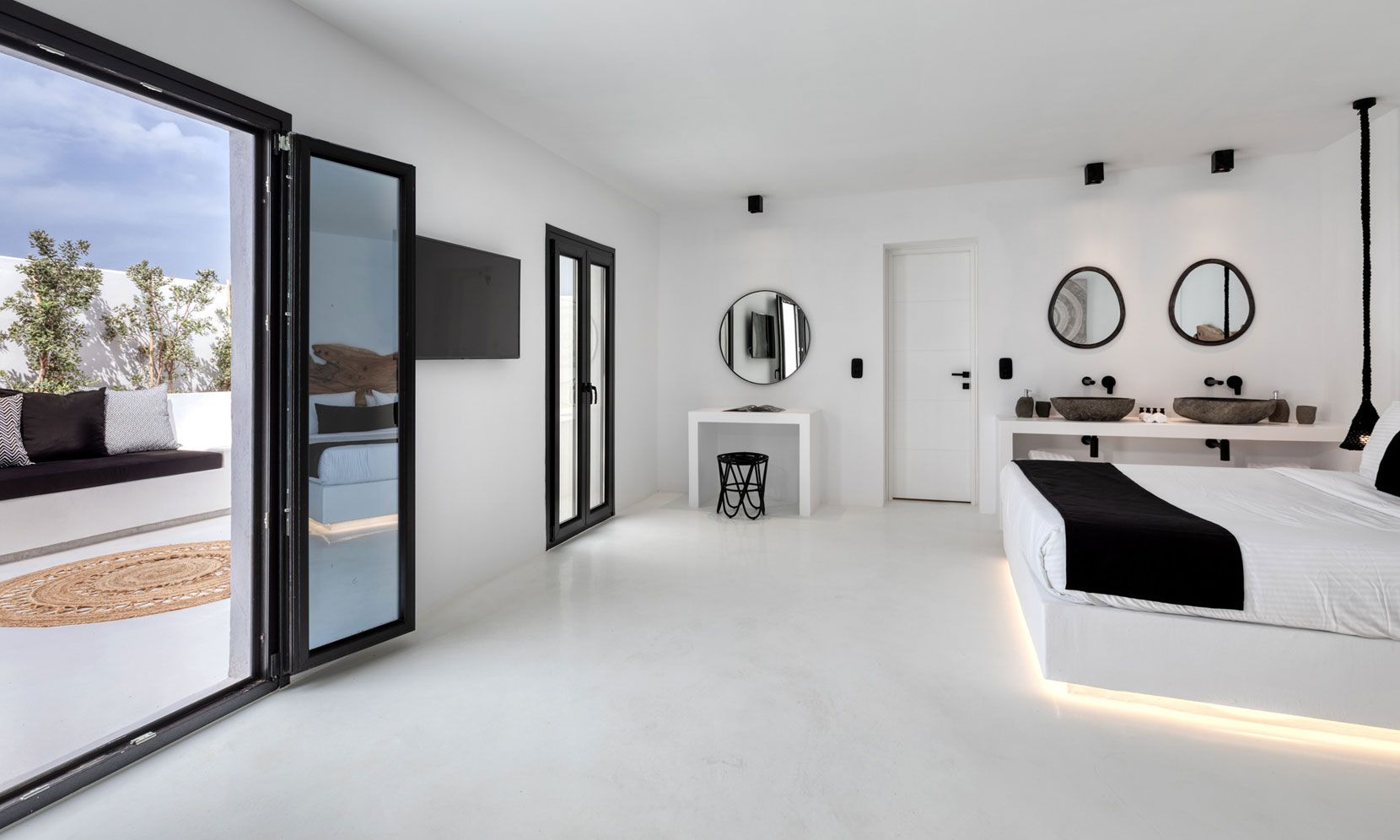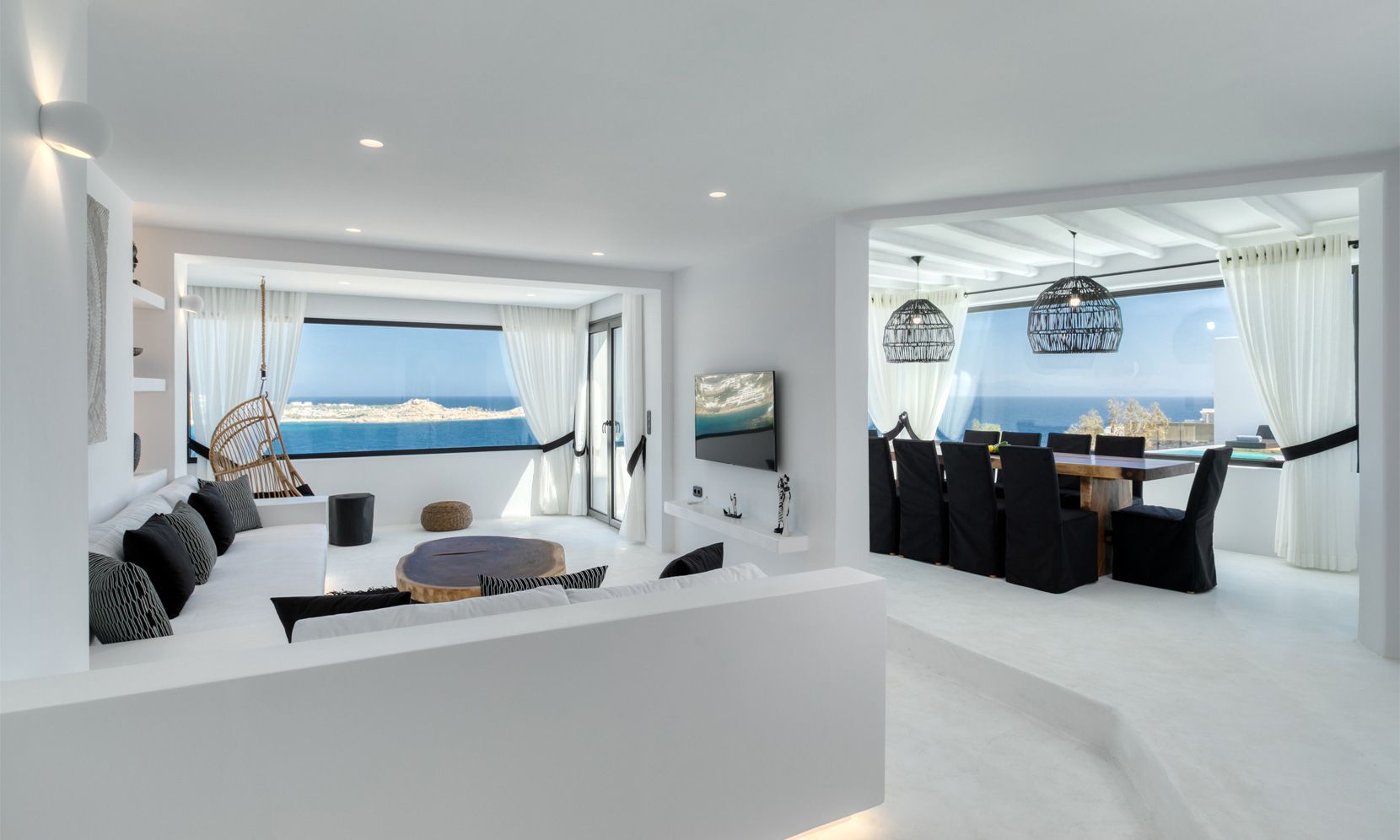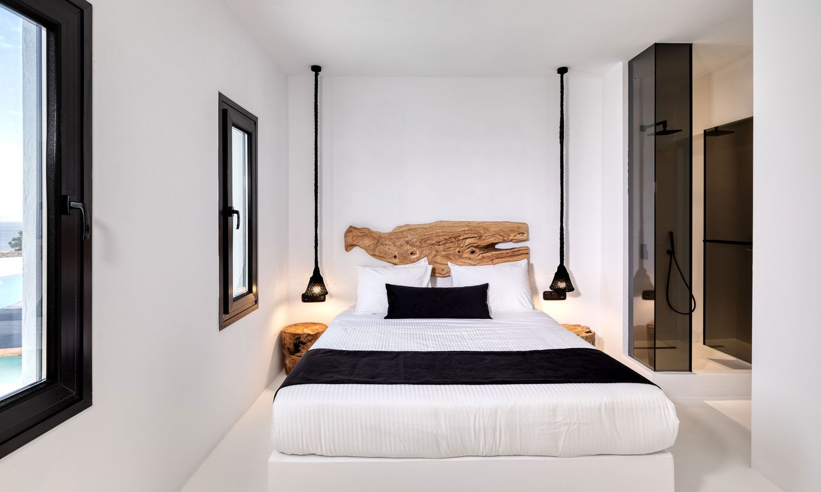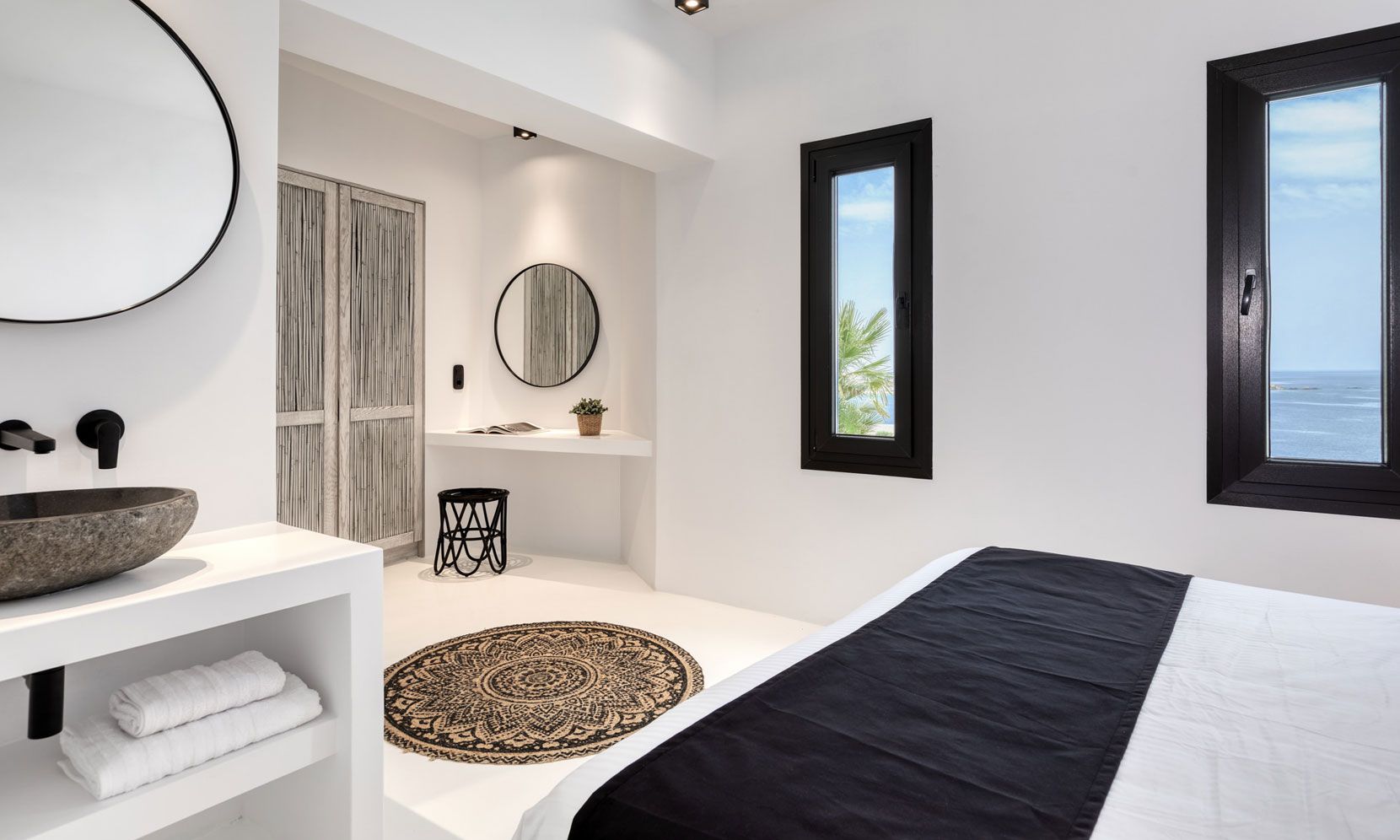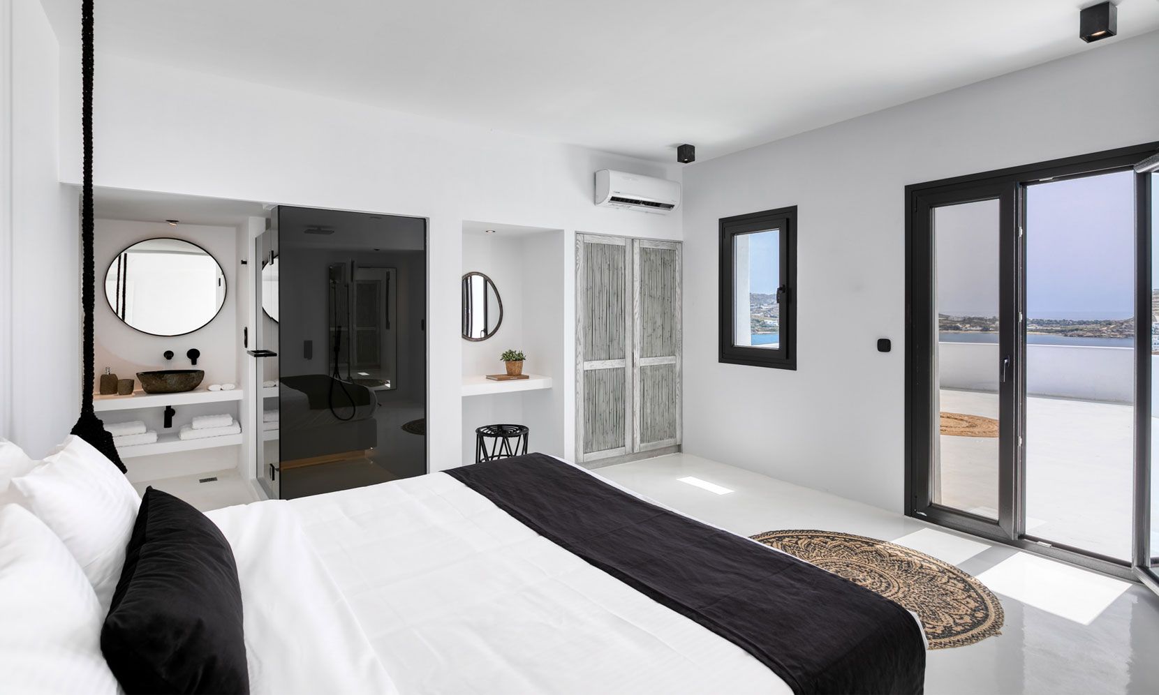 Dressed in black and white – and black and white only, Black Pearl’s common living areas are designed to create an easy flow between the interior and the exterior, with enormous windows overlooking Psarou Beach and French doors opening to the pool terrace. An expertly equipped kitchen leads to the living room and the dining area, that enjoys the same impeccable sea view and offers a large wooden table for 10. The 5 bedrooms are a luxury dream come true, all featuring king size beds and en-suite bathrooms, while 4 of them have access to private balconies for your just-the-two-of-us moments in the sun or under the starry sky.