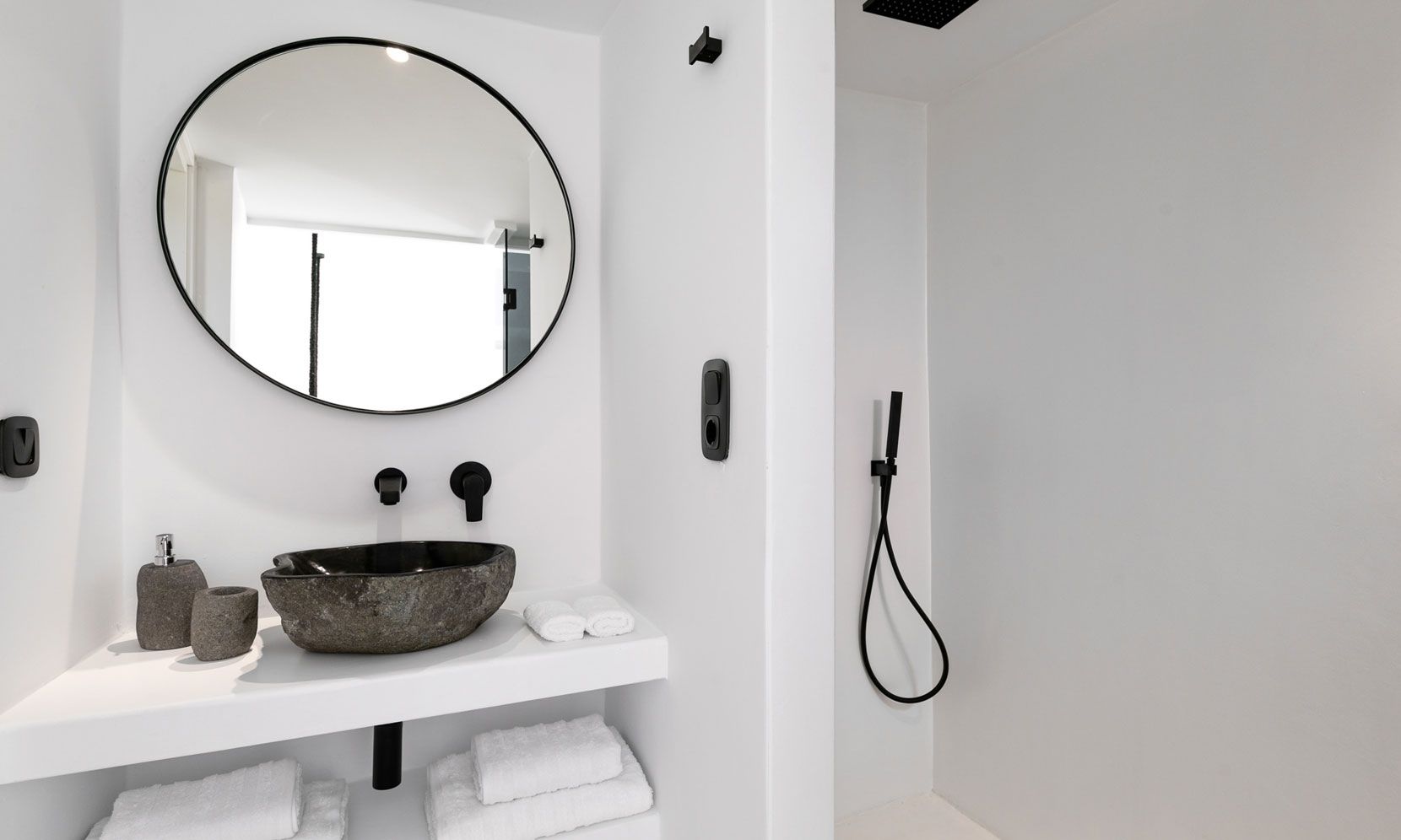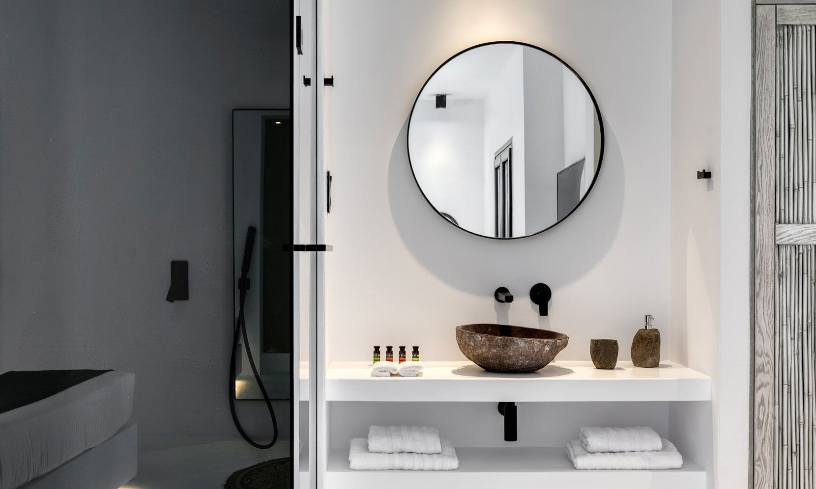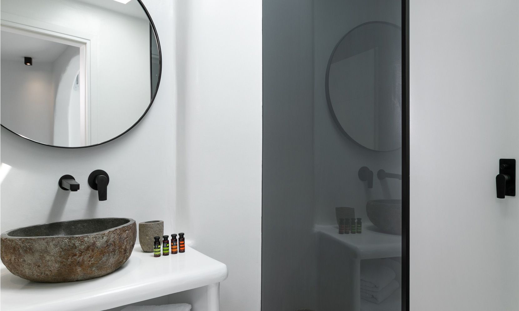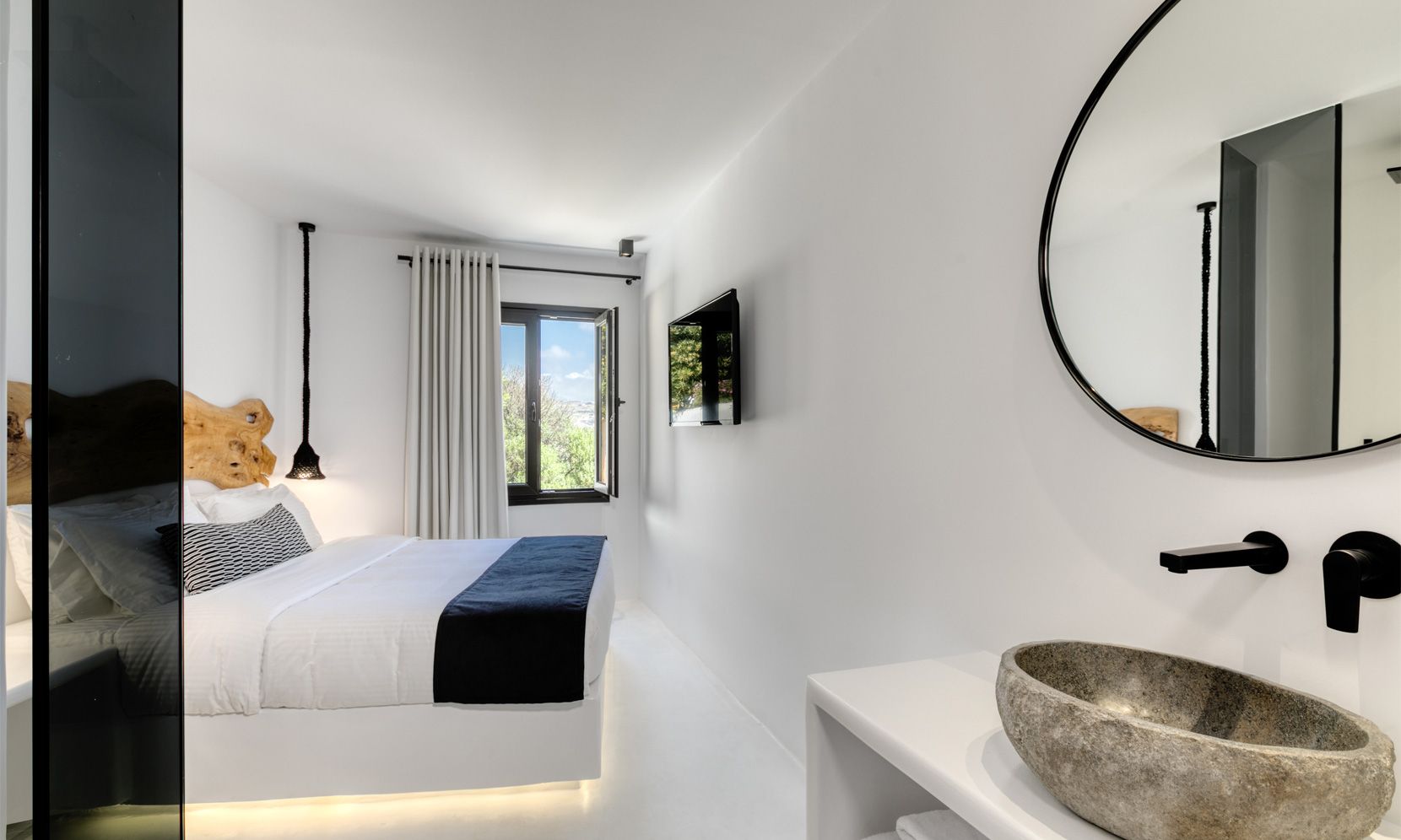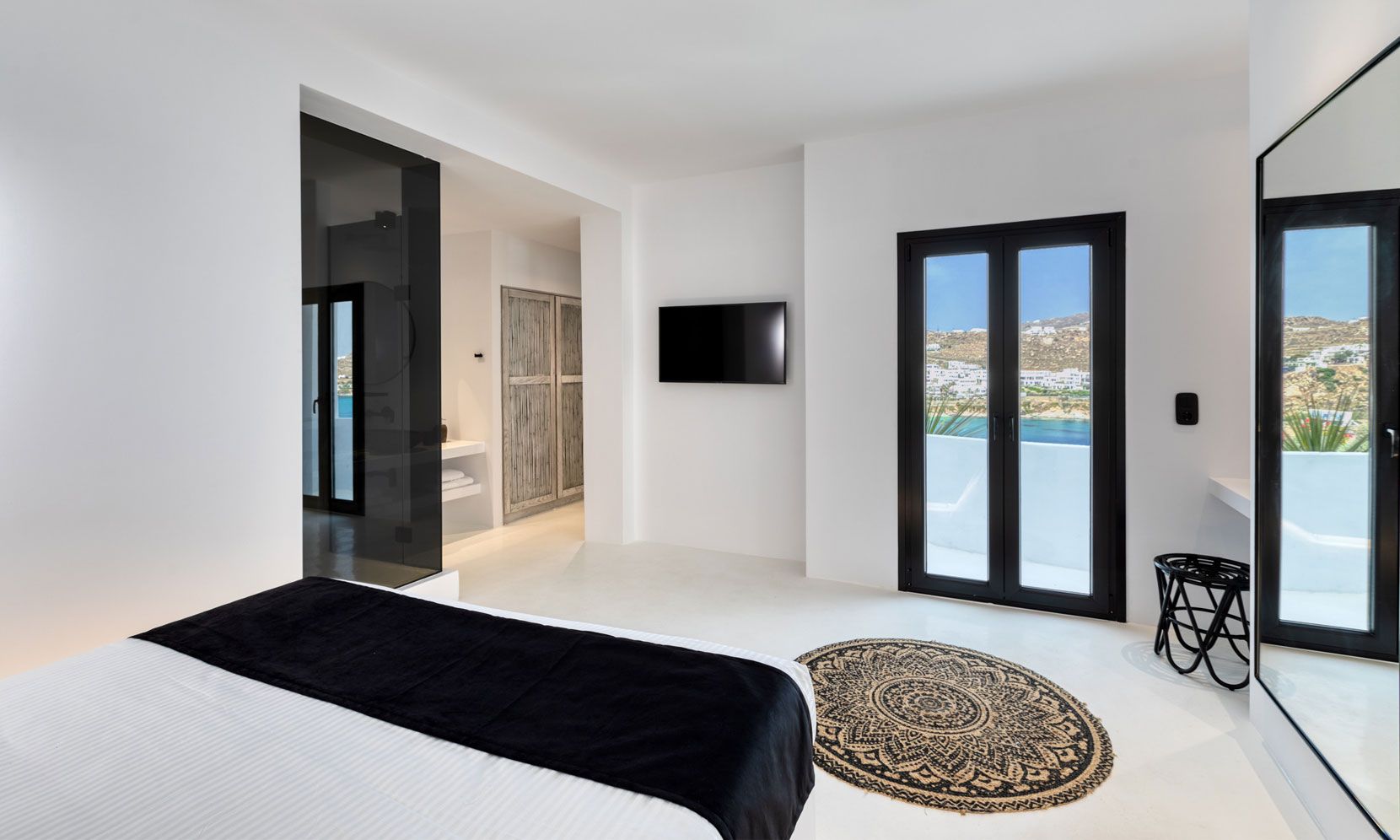 Dressed in black and white – and black and white only, Black Pearl’s common living areas are designed to create an easy flow between the interior and the exterior, with enormous windows overlooking Psarou Beach and French doors opening to the pool terrace. An expertly equipped kitchen leads to the living room and the dining area, that enjoys the same impeccable sea view and offers a large wooden table for 10. The 5 bedrooms are a luxury dream come true, all featuring king size beds and en-suite bathrooms, while 4 of them have access to private balconies for your just-the-two-of-us moments in the sun or under the starry sky.