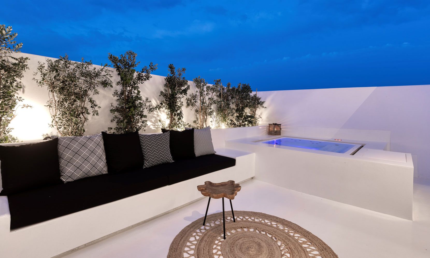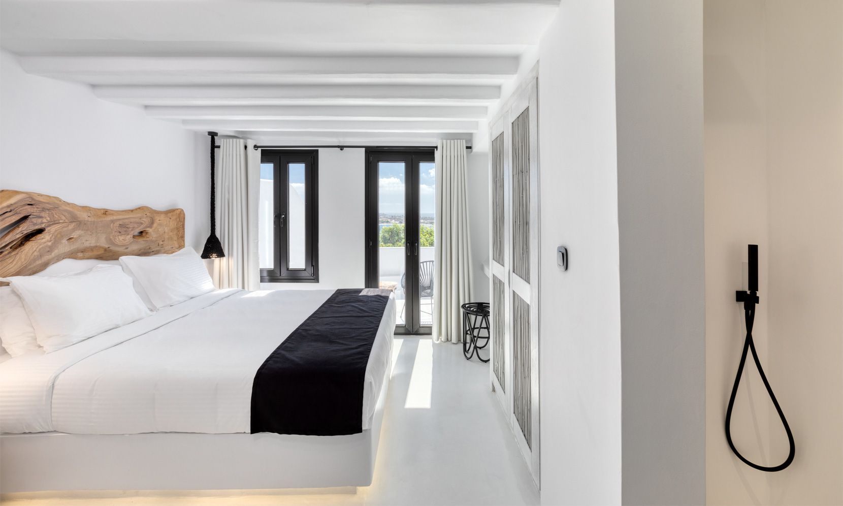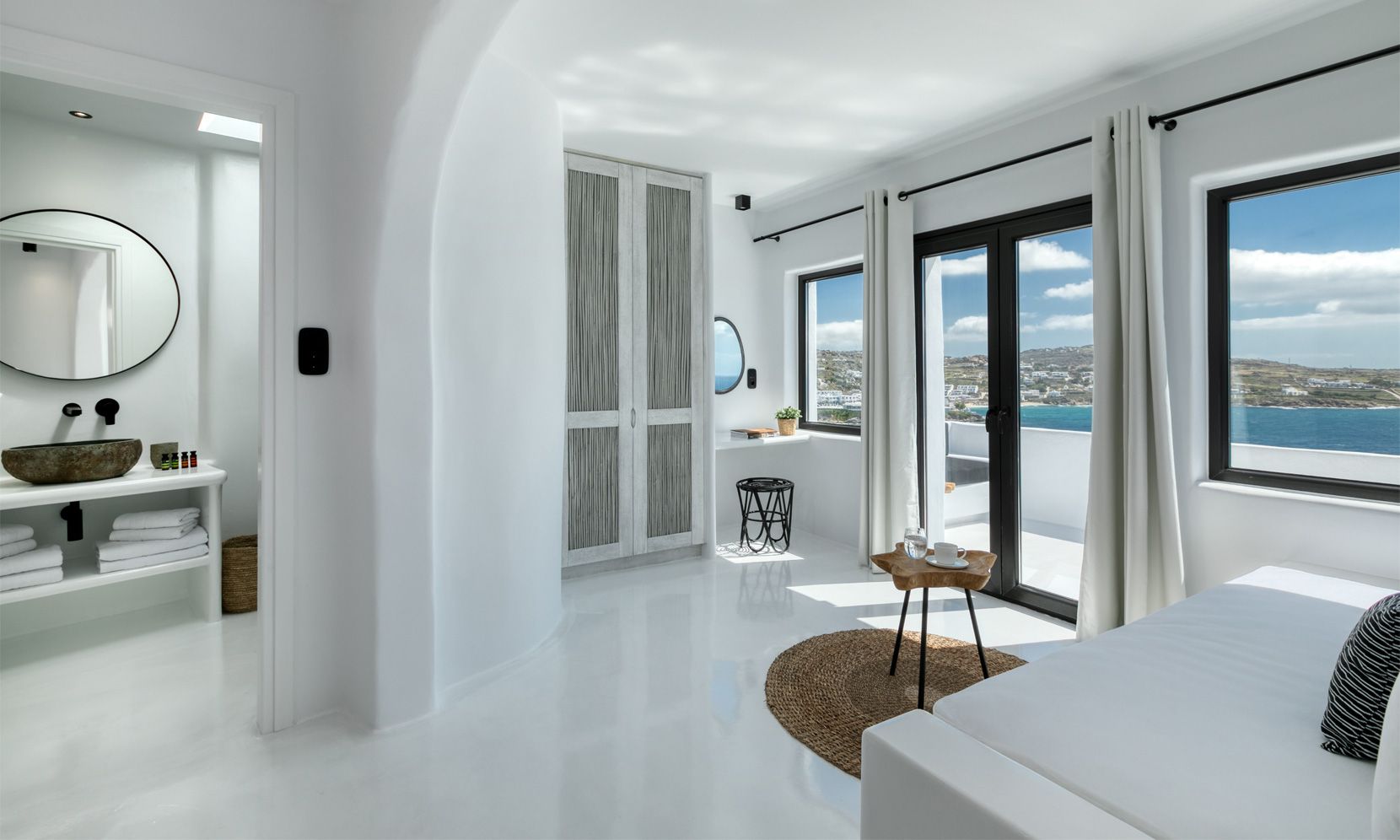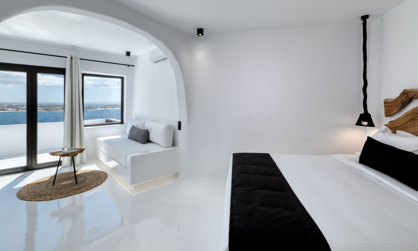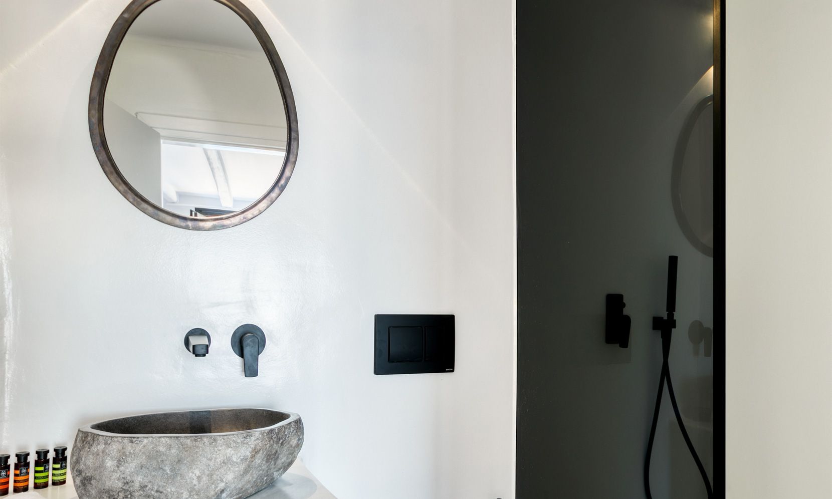 Dressed in black and white – and black and white only, Black Pearl’s common living areas are designed to create an easy flow between the interior and the exterior, with enormous windows overlooking Psarou Beach and French doors opening to the pool terrace. An expertly equipped kitchen leads to the living room and the dining area, that enjoys the same impeccable sea view and offers a large wooden table for 10. The 5 bedrooms are a luxury dream come true, all featuring king size beds and en-suite bathrooms, while 4 of them have access to private balconies for your just-the-two-of-us moments in the sun or under the starry sky.