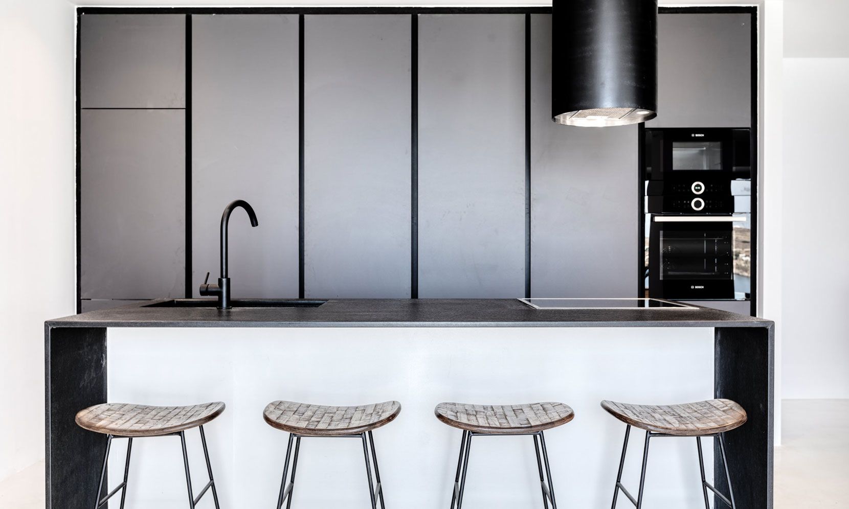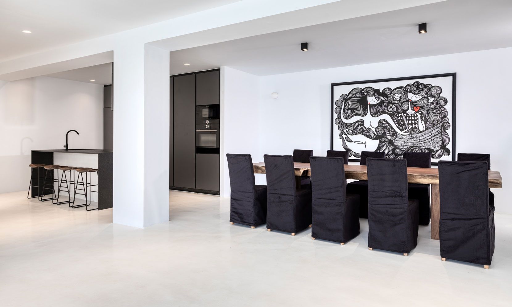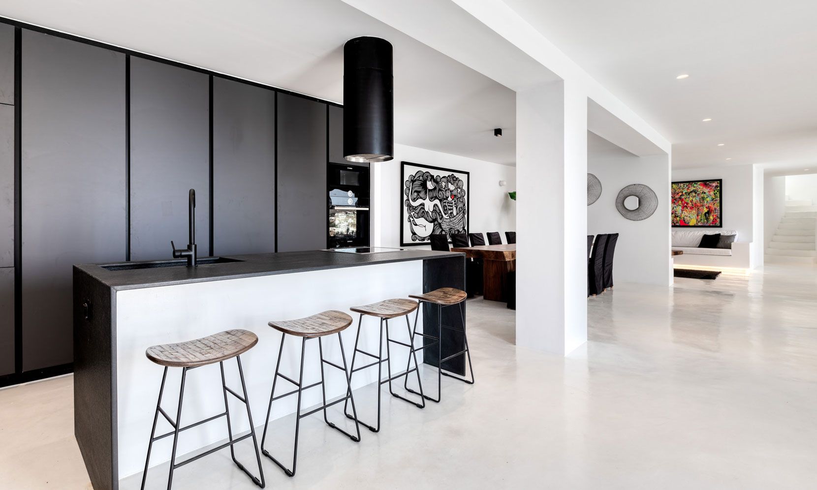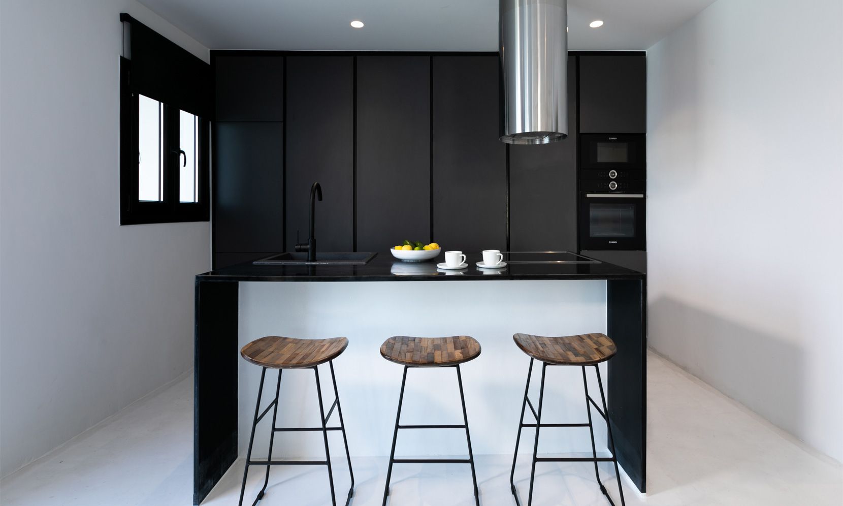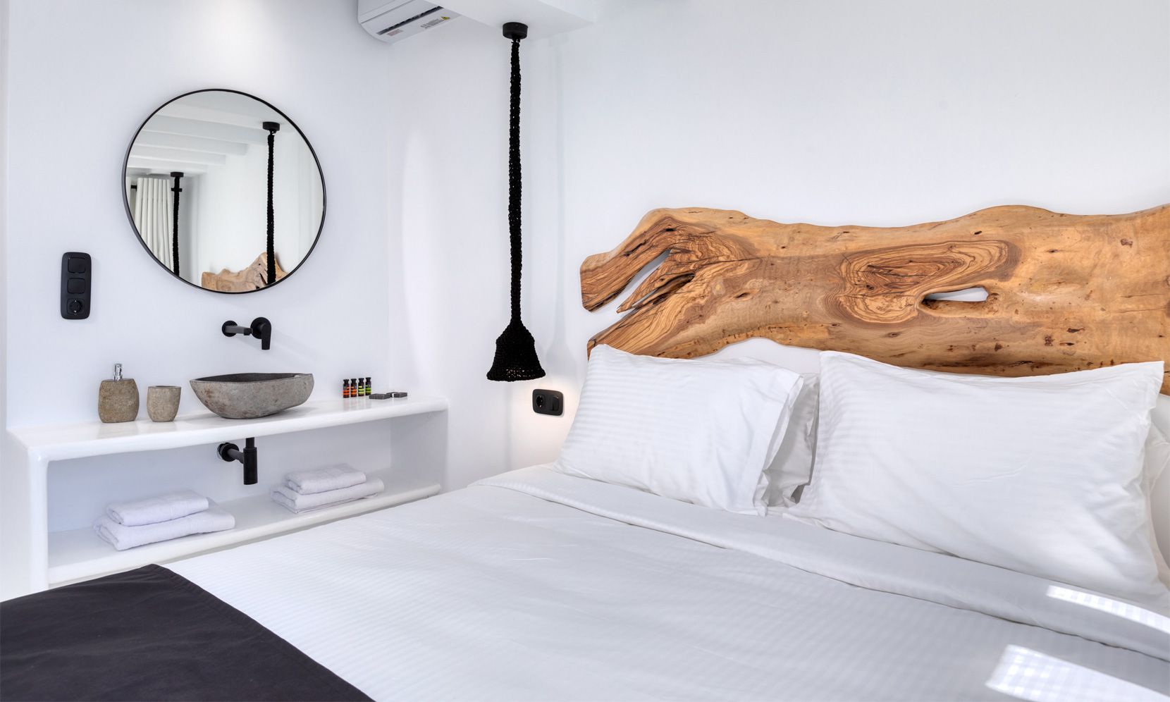 Dressed in black and white – and black and white only, Black Pearl’s common living areas are designed to create an easy flow between the interior and the exterior, with enormous windows overlooking Psarou Beach and French doors opening to the pool terrace. An expertly equipped kitchen leads to the living room and the dining area, that enjoys the same impeccable sea view and offers a large wooden table for 10. The 5 bedrooms are a luxury dream come true, all featuring king size beds and en-suite bathrooms, while 4 of them have access to private balconies for your just-the-two-of-us moments in the sun or under the starry sky.