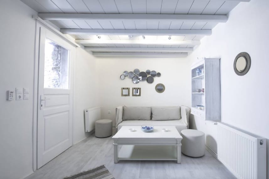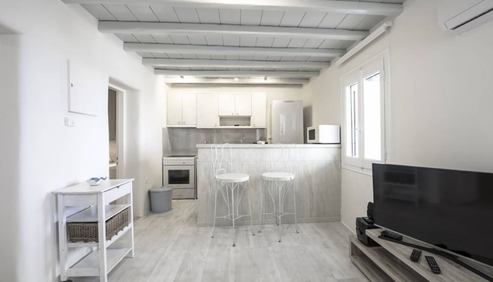The apartment 1B is a ground floor apartment with a private swimming pool, with its veranda totally protected from the wind. It features 2 cozy bedrooms -one of them being a master bedroom and the other one a double bed and a single bed, both with their own en suite bathrooms- that can accommodate up to 5 guests. The apartment 1B offers vast breathtaking views of the Aegean Sea and both the old and the new harbor of Mykonos. It has air conditioning and central heating systems and an electrical generator installed to be used in case of an emergency. Also provided are TV and Wi-Fi internet connection, a washing machine and all necessary kitchen equipment.