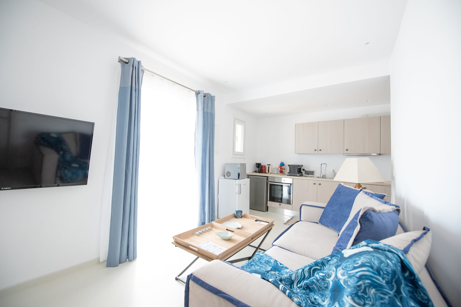The bungalow has 2 double bedrooms and en-suite bathrooms, a living room with sofa bed, and fully equipped kitchen. It features its own private swimming pool, veranda with sunbeds and dining area, and a reserved parking spot. The guests enjoy the stunning and unobstructed views of Mykonos Town, Little Venice and the signature deep blue waters of the Aegean Sea, thus making their stay as romantic as it gets.