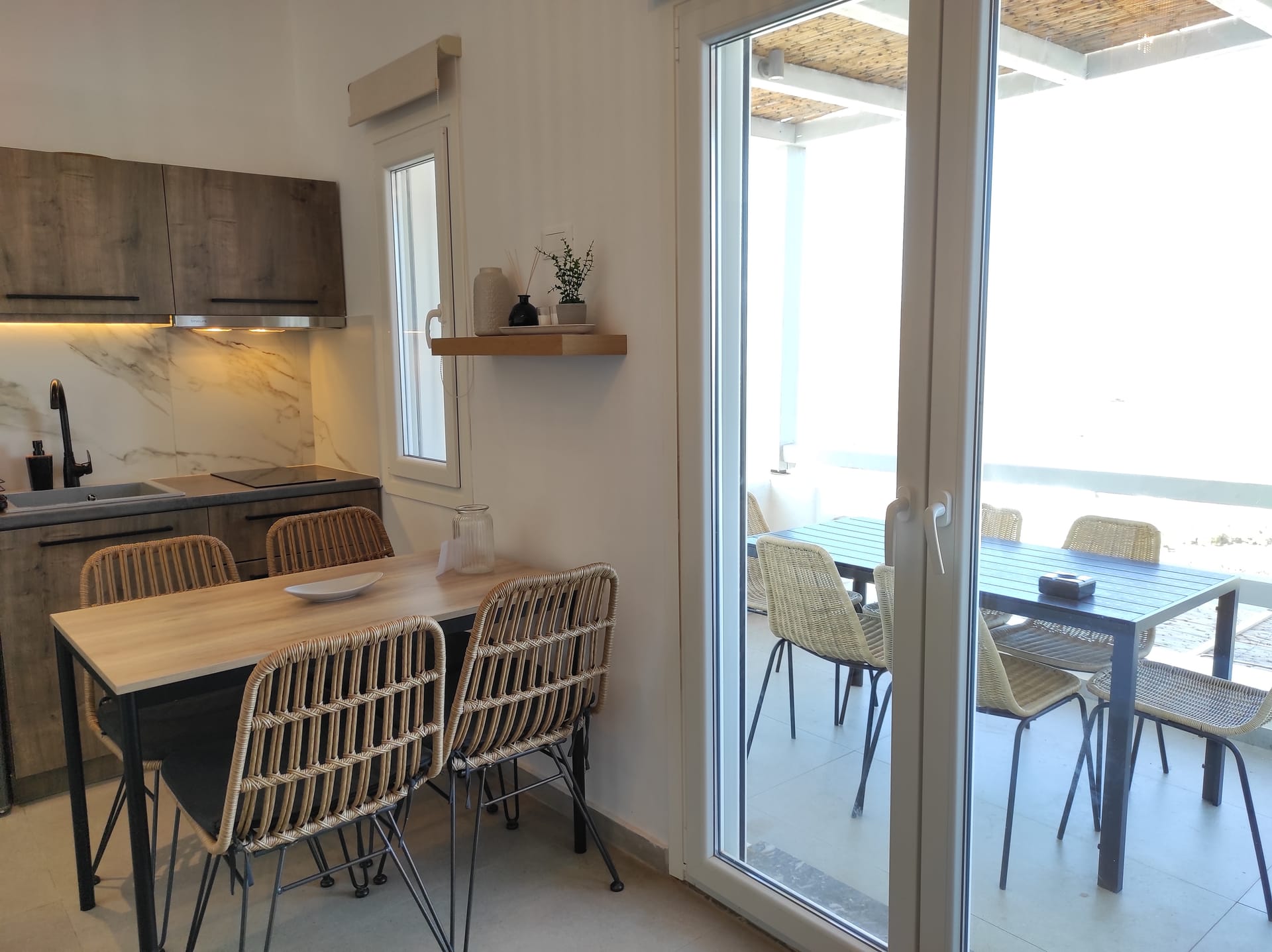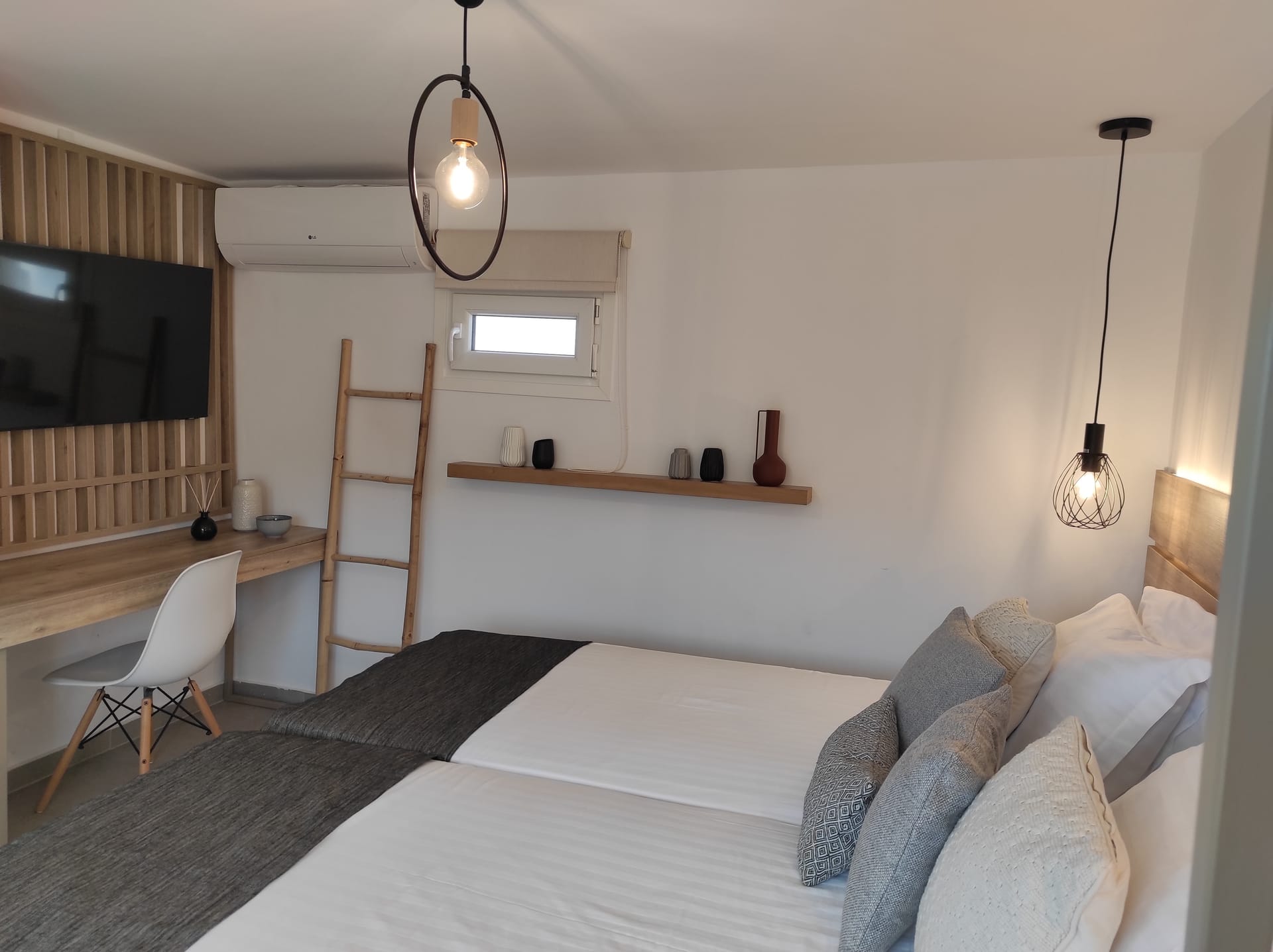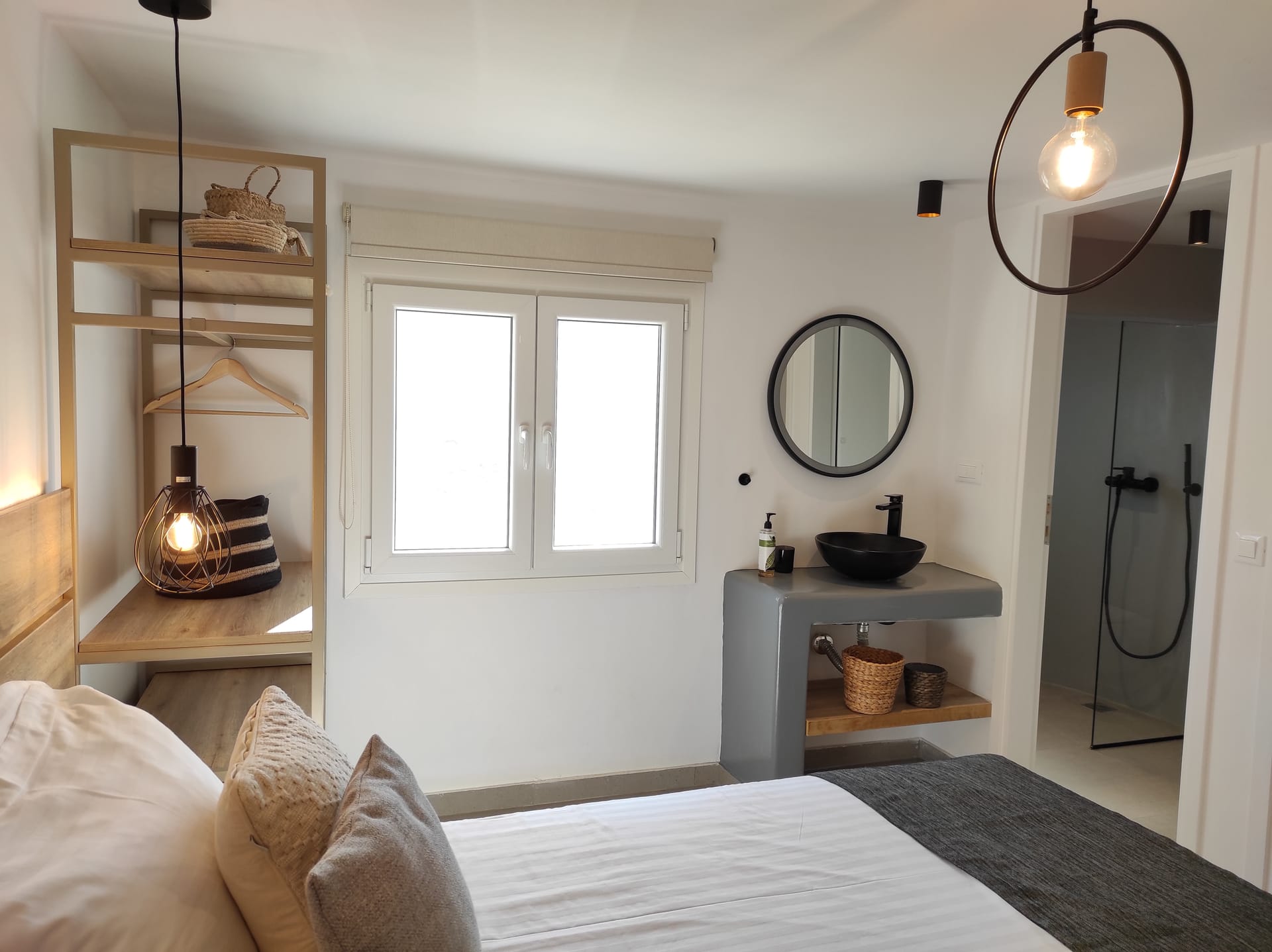 The residence combines minimal style with traditional cycladic architecture featuring elegantly designed spaces with state-of-the-art amenities.A deluxe maisonette, with amazing views and access to the Aegean sea. Full of the Mykonian light and air, all spaces are stylishly decorated at this boutique property. Each air-conditioned room is equipped with complimentary luxury bath amenities as well as a hairdryer and a flat-screen TV. Master bedroom opens to a furnished veranda with magnificent sea and surrounding views.