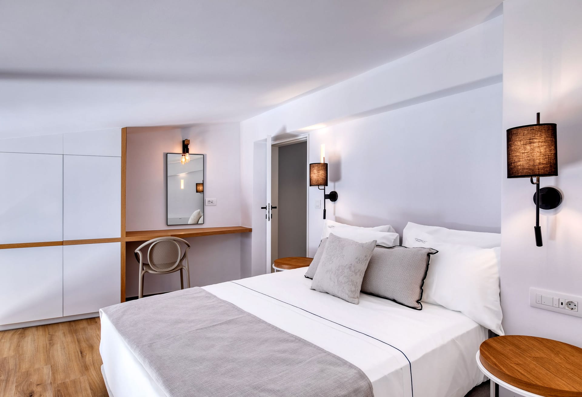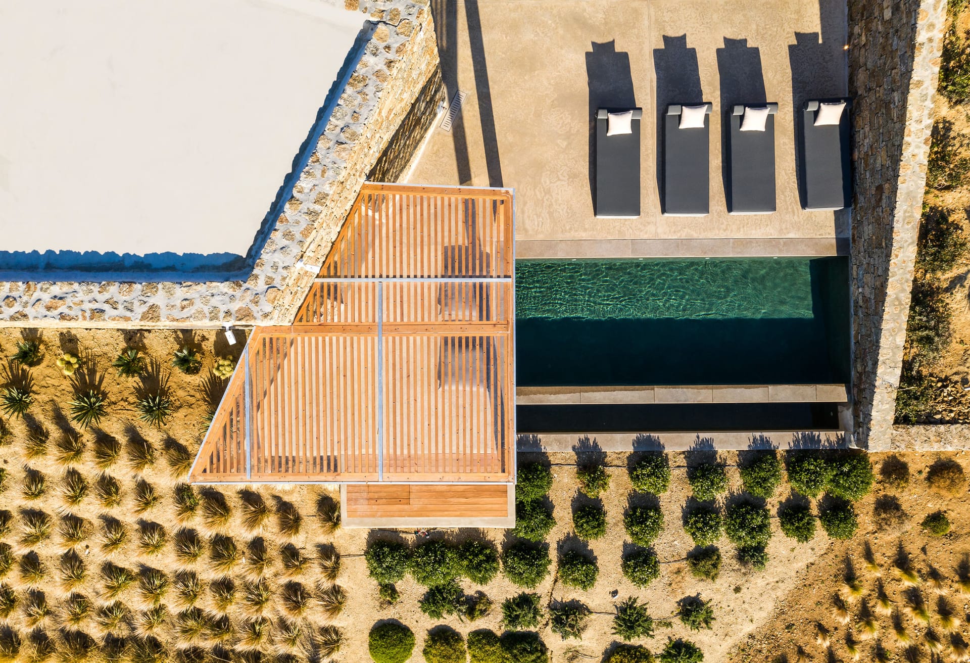 Panormos Bay Premium Suite envelopes the surrounding’s raw aesthetics, harmoniously transformed into a delicate backdrop of modern living. Natural materials, timber, and steel details combined with contemporary furnishing giving a refined raw edge.