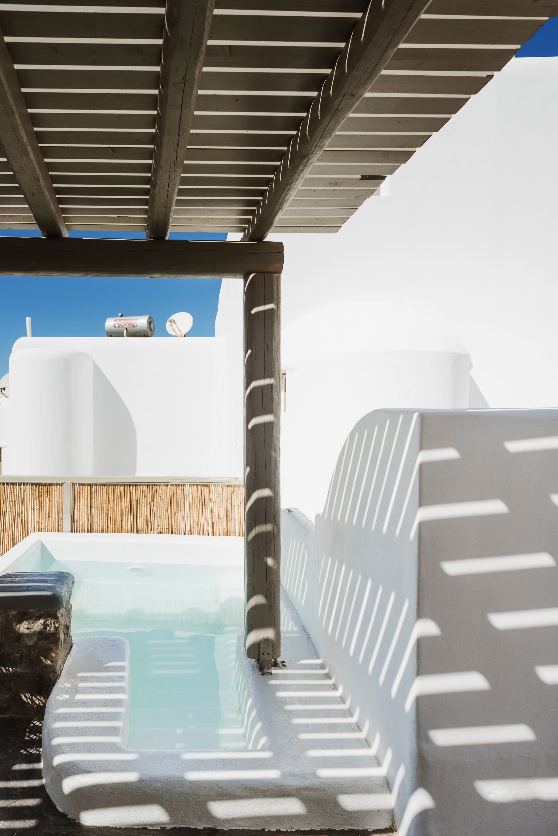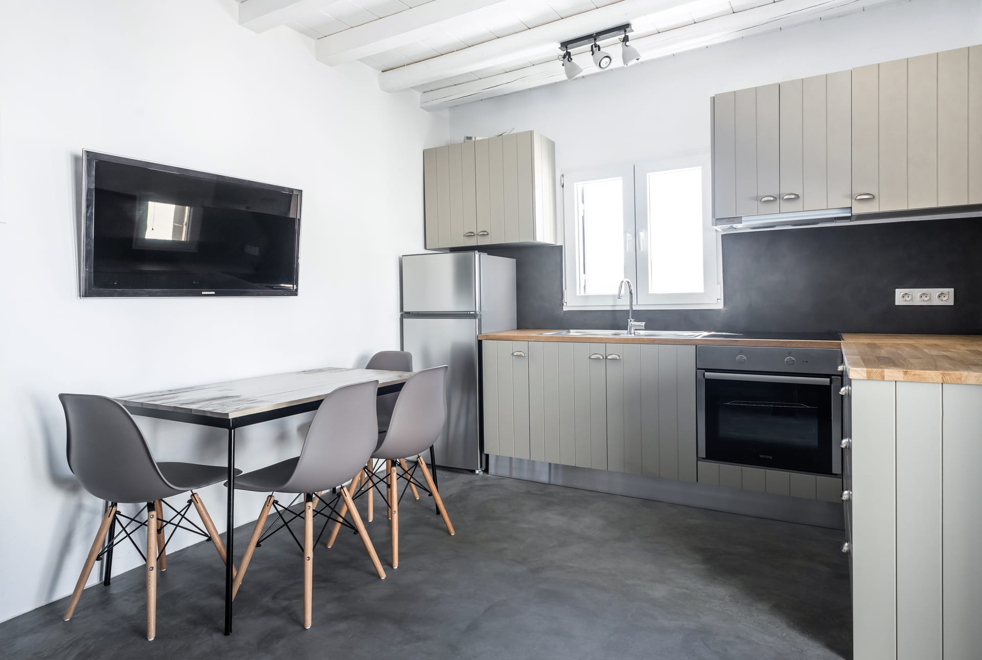 Grey residence consists of two bedrooms (one with double bed, one with two singles that can be arranged as double). Each bedroom has its own sat TV, WC, shower and large kitchen with dining table. There is also a refrigerator (fully equipped for preparation of light meals) and a large living room with sat tv and a couch. Finally it has an independent balcony with outdoor jacuzzi with an amazing sea view of Merchia beach.