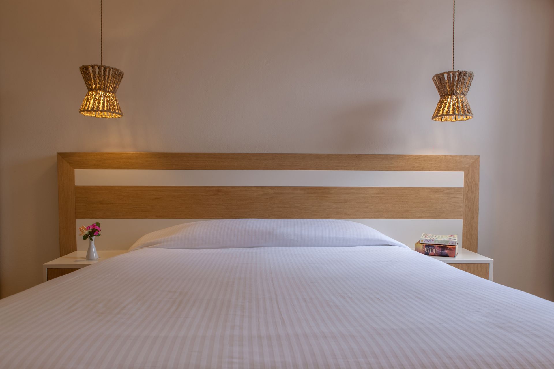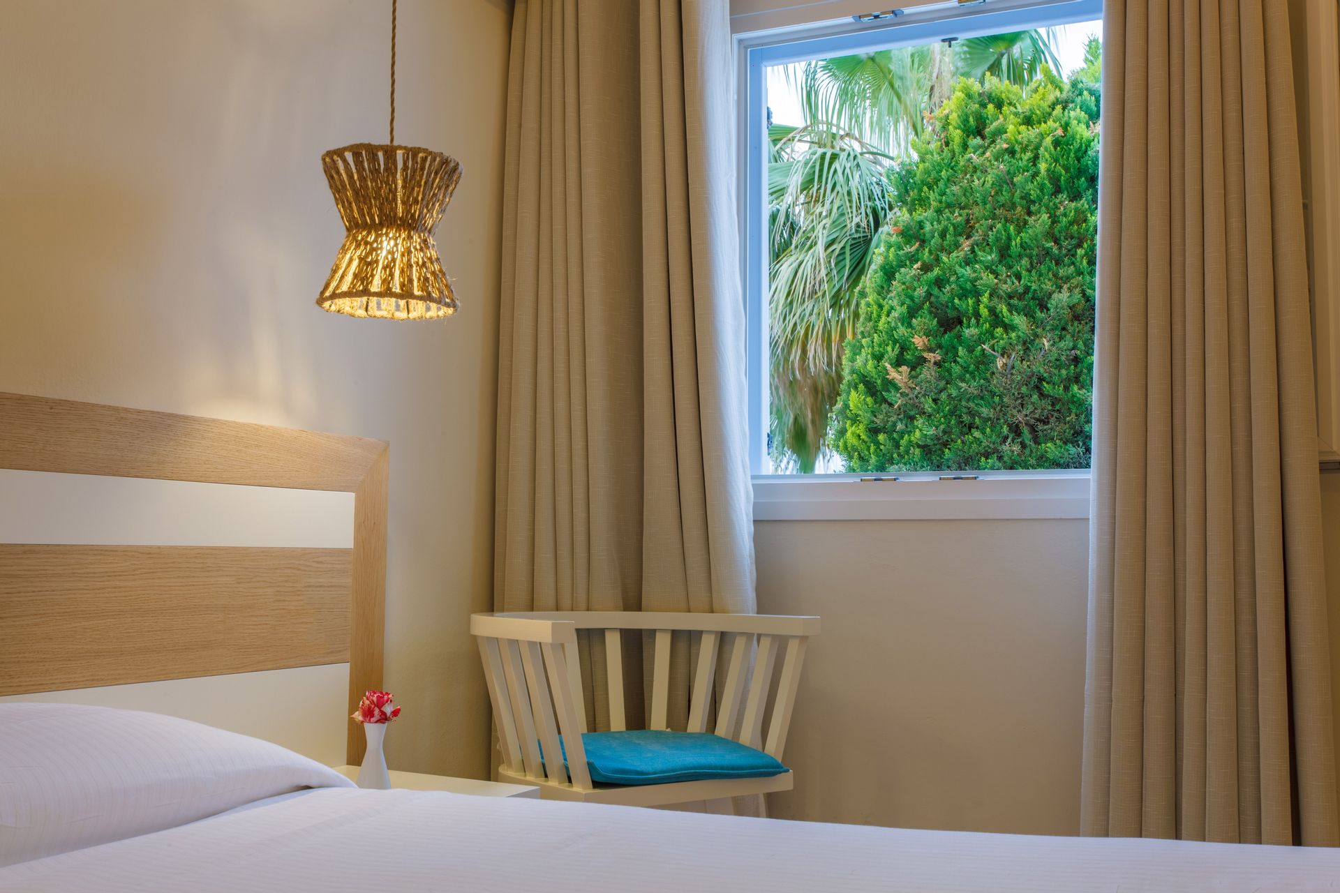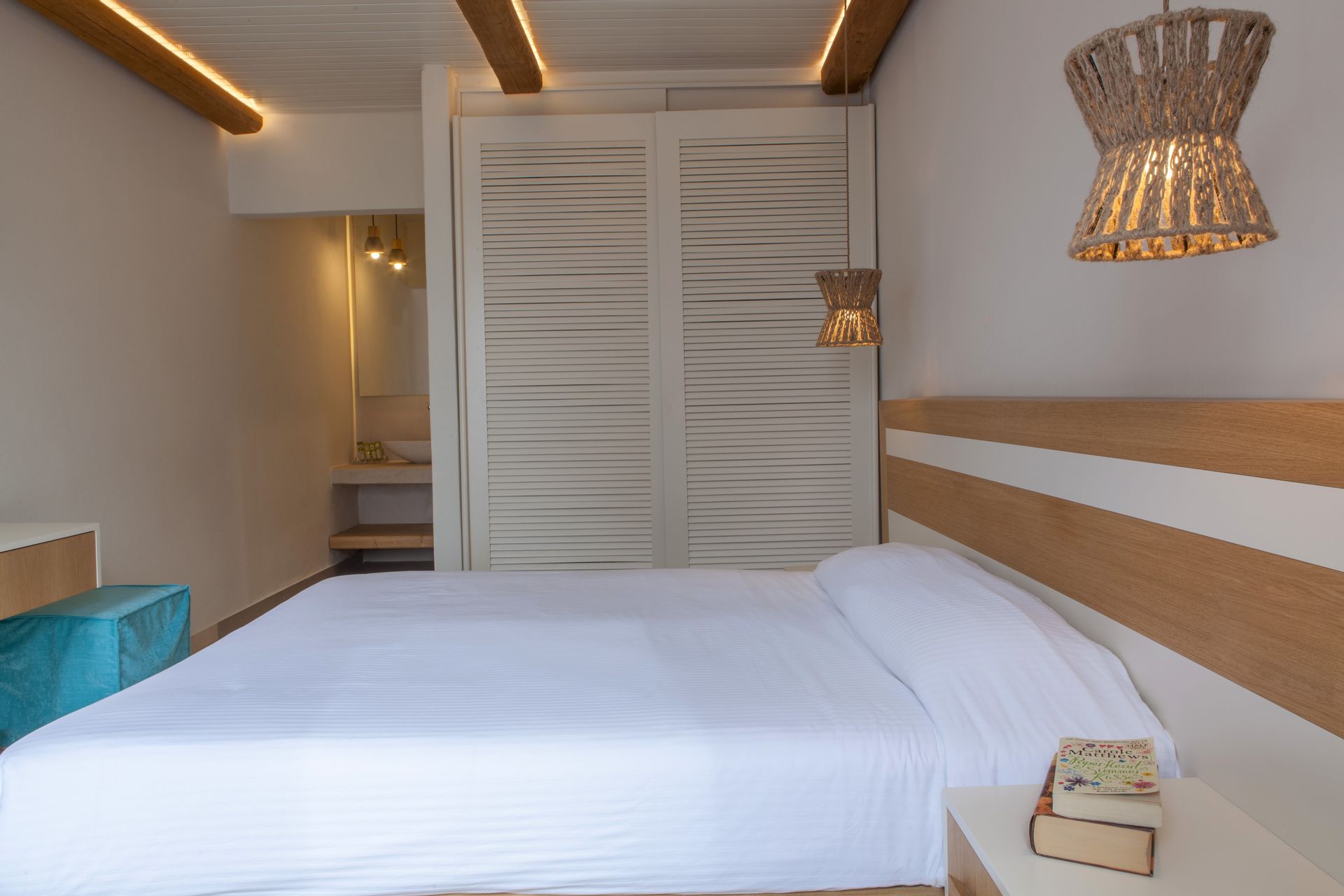 Sunny and cozy, with all the mod cons, refined décor and alternating soft, earthy hues of white, ochre and blue, Aeolos Resort’s carefully appointed recently renovated double rooms have a harmonious, relaxing feel. One of the best things about rooms in this class is their private balcony which overlooks the pool and the architectural Mykonian style building, allowing guests to unwind as they savor the hotel’s glorious grounds.