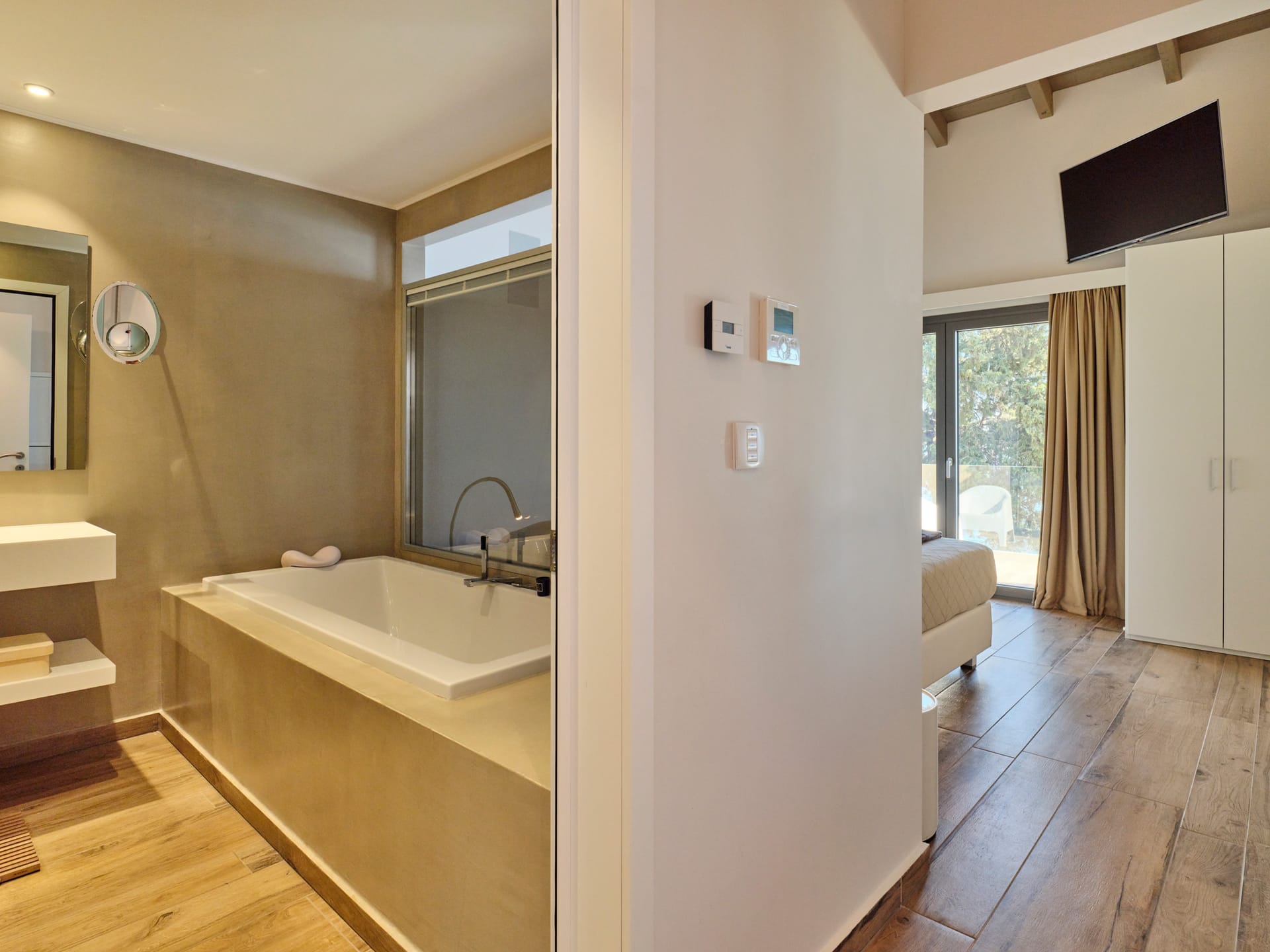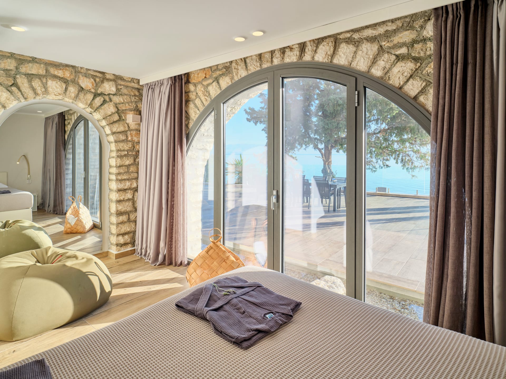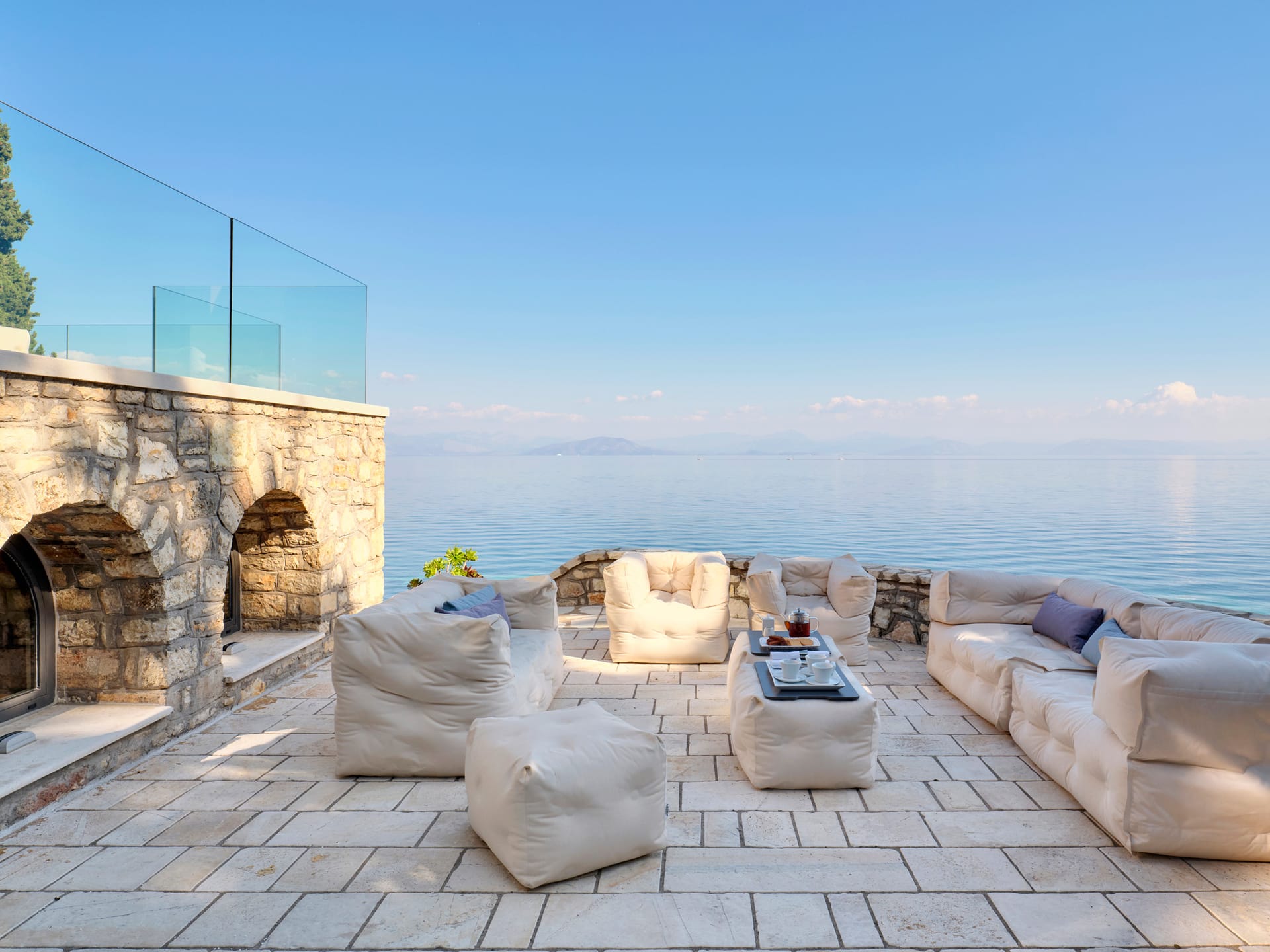 The outdoor area includes a stunning infinity swimming pool Whether enjoying cocktails by the swimming pool or dining alfresco admiring the beautiful landscape and the private beach, guests will indulge in a delightful travel experience in Corfu!