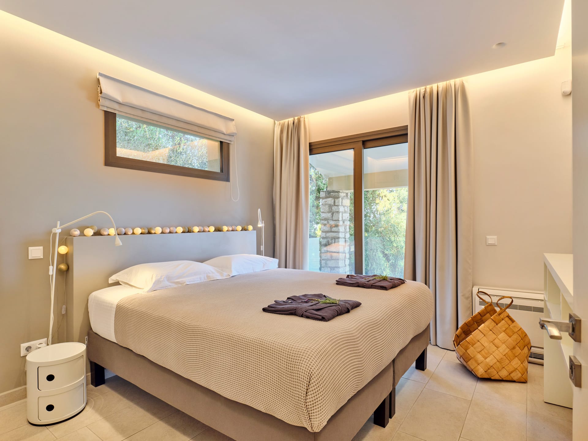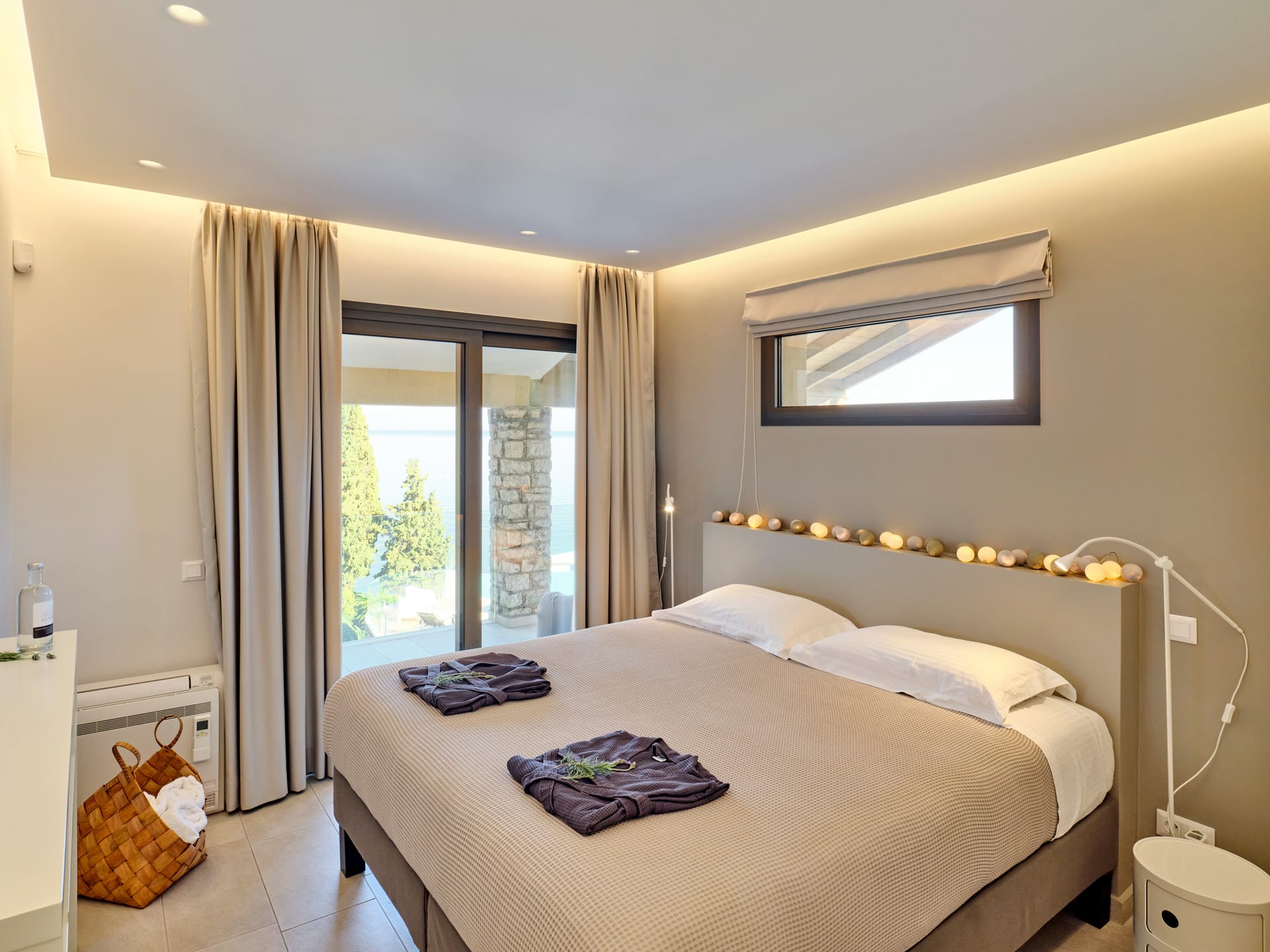 On the First Level, there is a spacious living room with an airy dining room and sea view, a wholly furnished modern kitchen and a guest WC. On the same level, there are 2 ensuite bedrooms, one has a bathtub and the other one has a walk-in closet and direct access to the swimming pool.