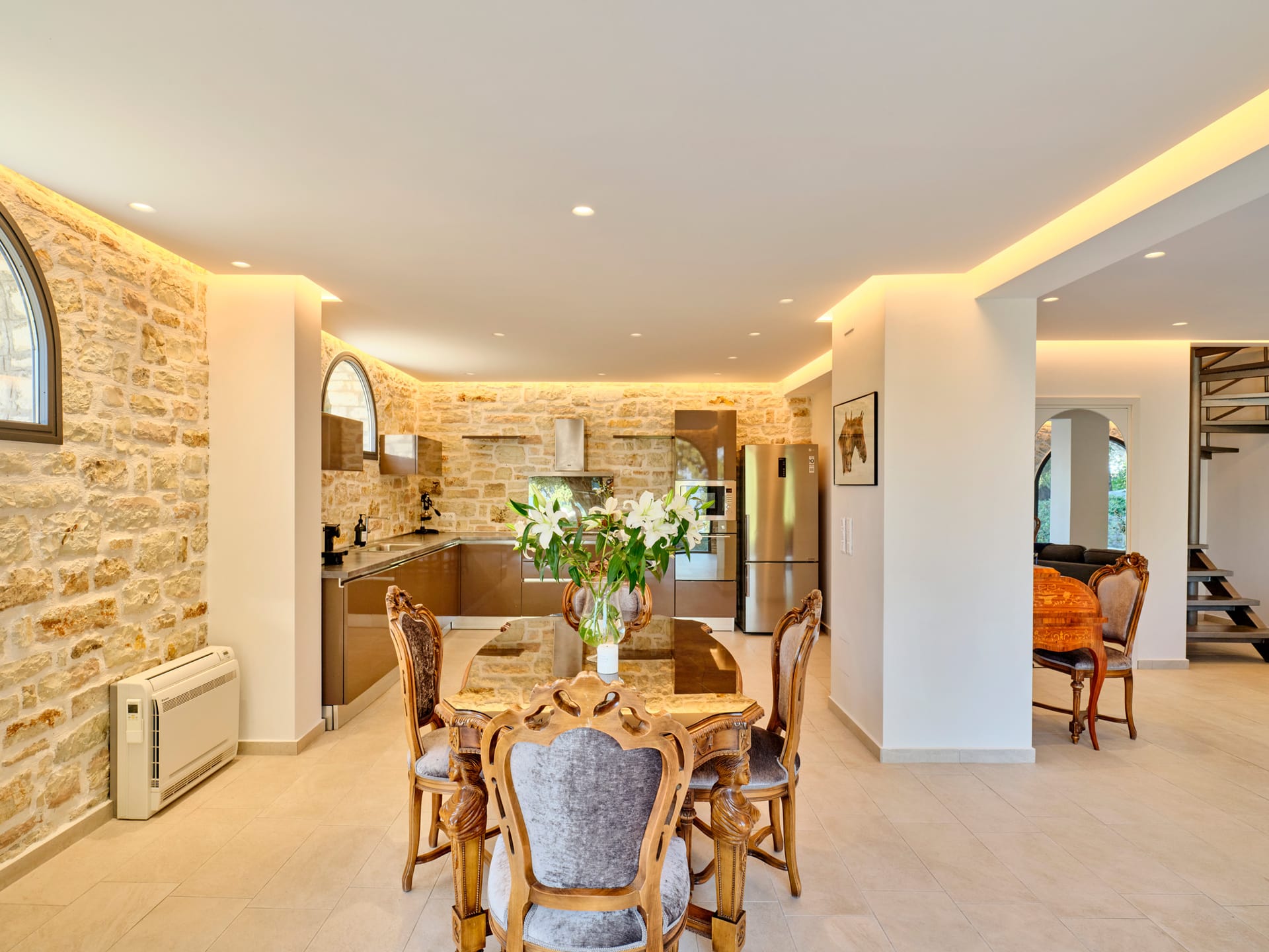 On the Ground Level, there is a large living room with dining area, a fully equipped modern kitchen and a Guest bathroom. The panoramic view extends over the garden, the pool, and the BBQ area too far over the sea.