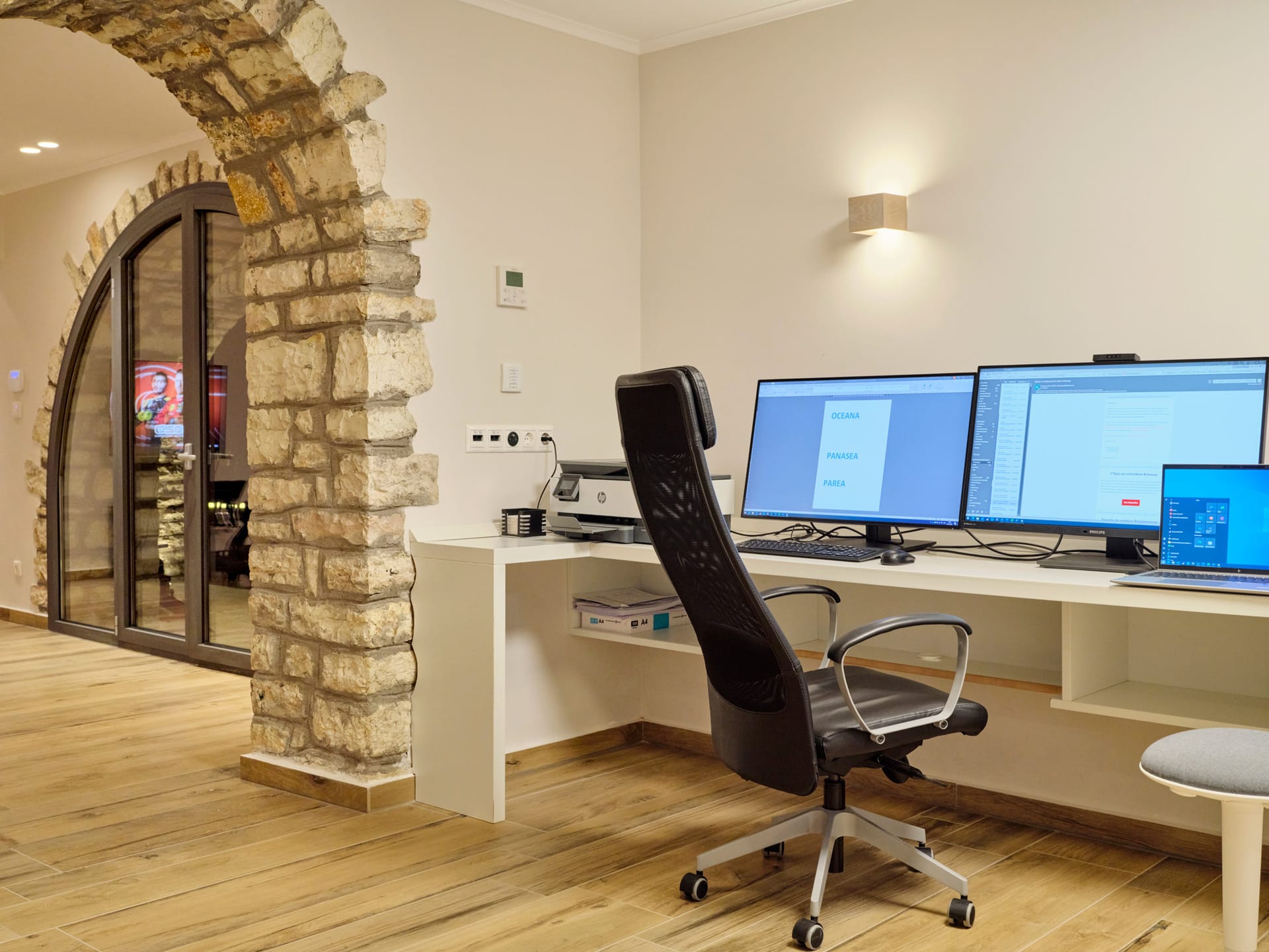 On the Ground Level, there are 2 ensuite bedrooms with direct access to the veranda. On the same floor is a fully equipped office with a kitchenette that offers to the guests the possibility to work during their vacation. There is also an F1 seater, a rowing machine, weights, yoga mats, and a portable massage bed are also available on this level so the guests can enjoy their vacation without missing their exercise program or relax with a PlayStation game.