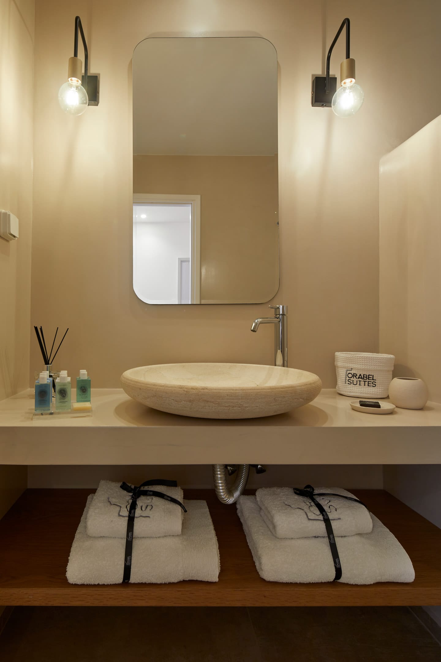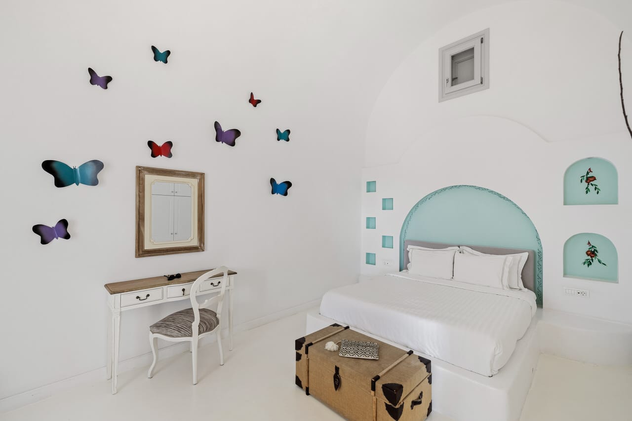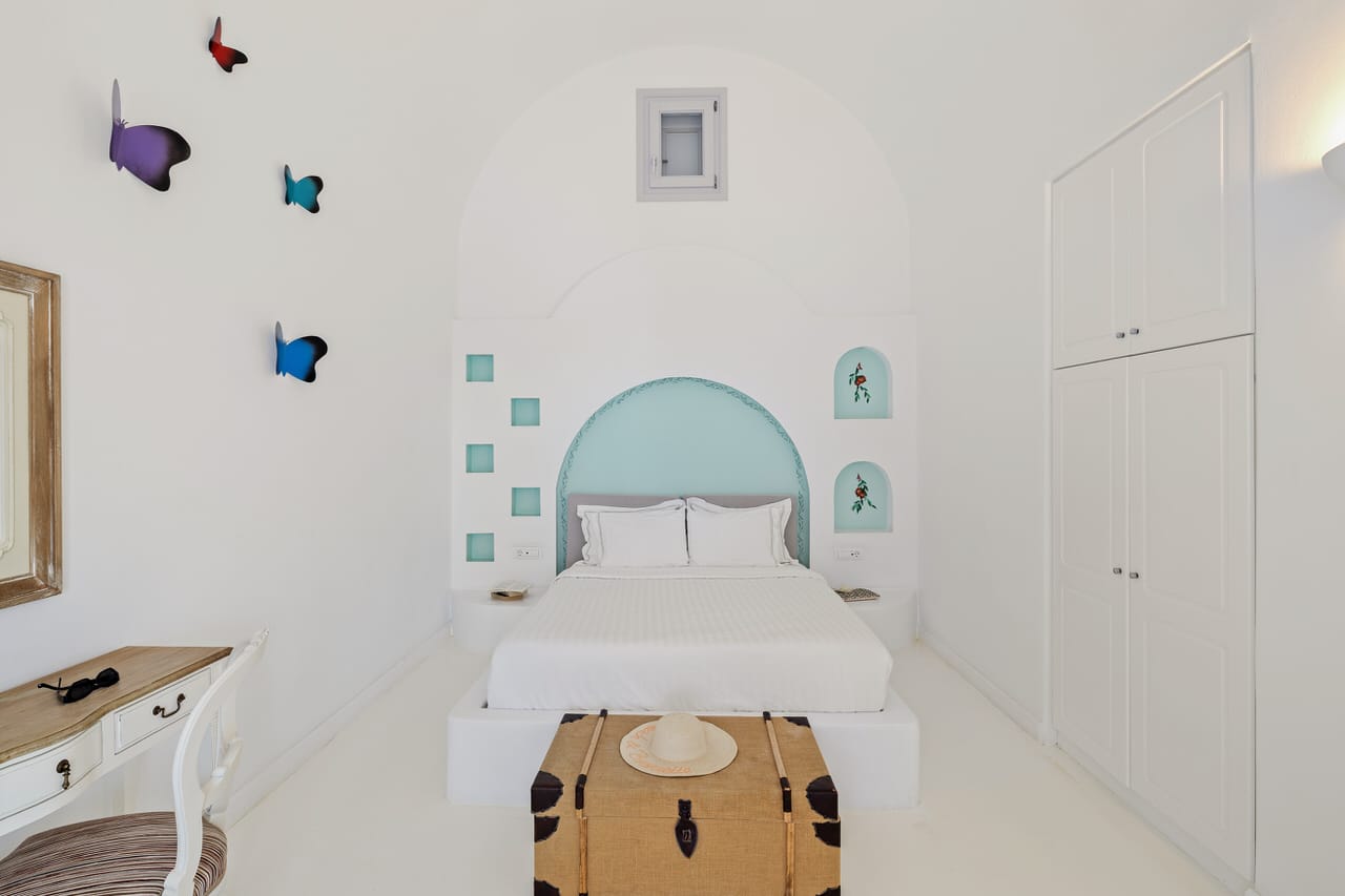 All the beauty, finesse and romance of Santorini island is concentrated at Orabel’s Superior Suites. Here, white tones again dominate, while being in perfect harmony with splashes of color in furniture, decorative elements and fabrics.