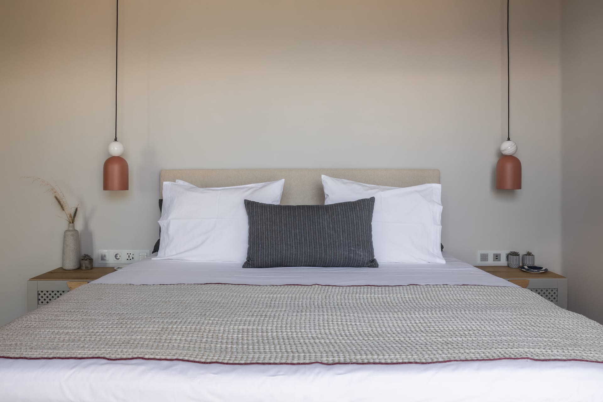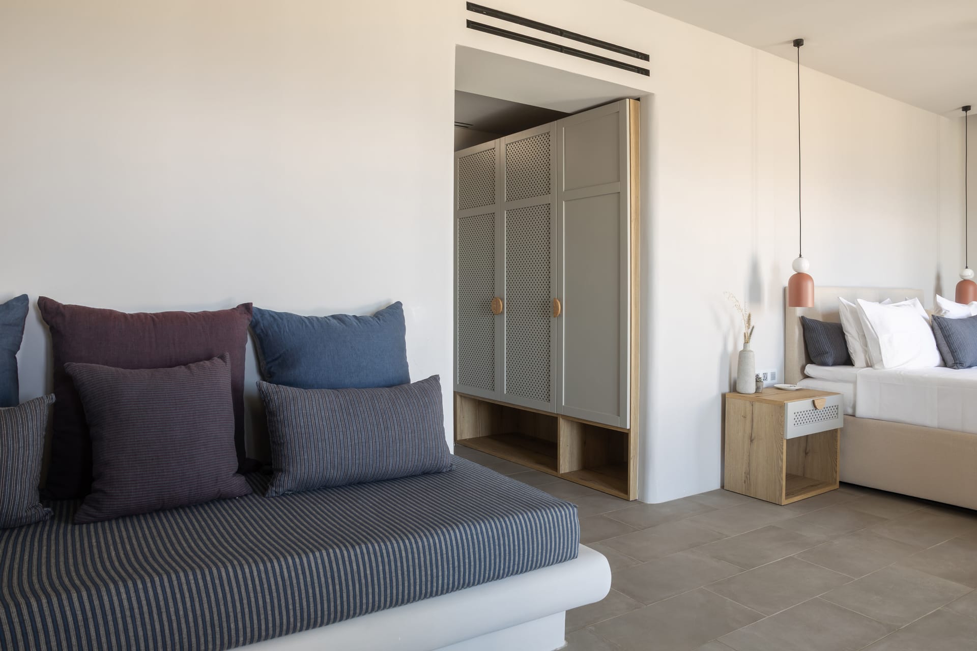 Discover 40 m² of refined indoor space featuring a luxurious king-size bed, a welcoming sitting area, and a modern bathroom with shower. Step outside to a large private veranda with sweeping views of the Aegean Sea, designed for relaxation and unforgettable moments. Complete the experience with your own private pool, offering the perfect blend of Cycladic charm and contemporary indulgence.