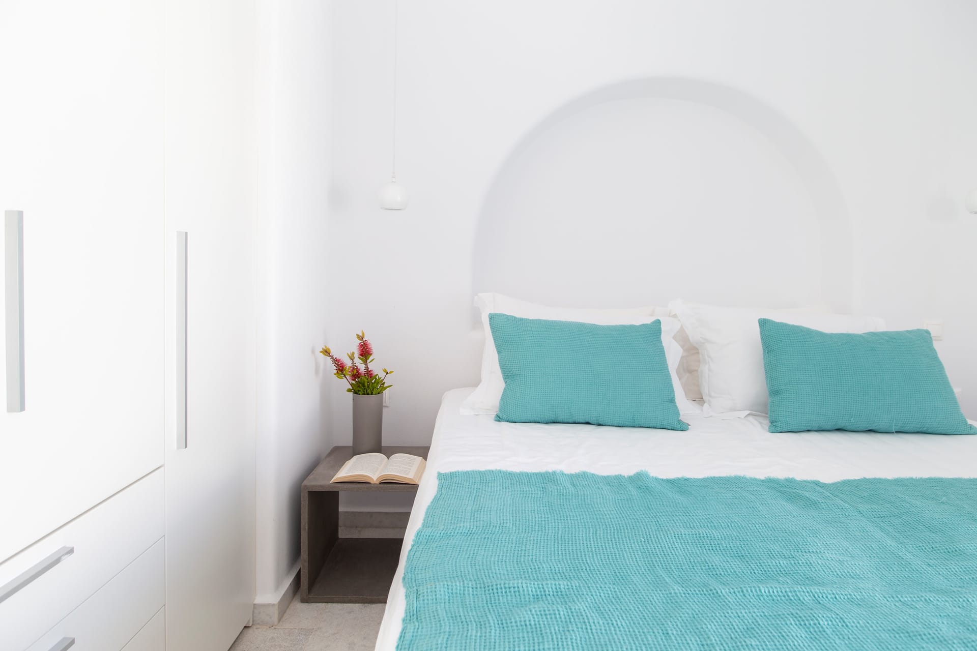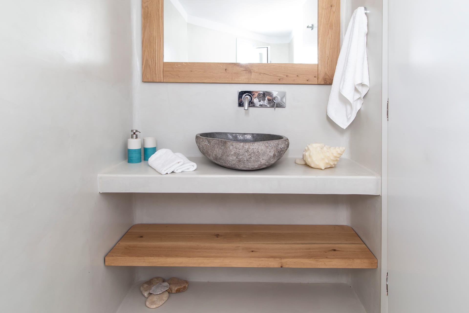 The villa features two beautifully appointed bedrooms, a large bathroom plus a guest WC, an open-plan living room, and a fully equipped kitchen with dining area. Floor-to-ceiling windows flood the interiors with natural light and open onto a large terrace where you can unwind with panoramic views of the Aegean Sea.