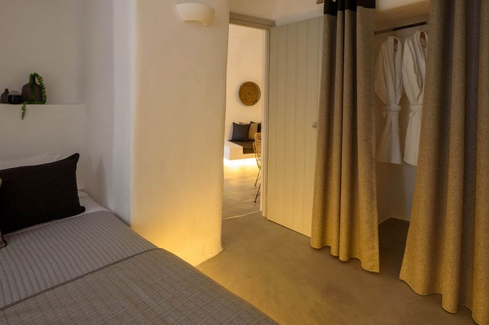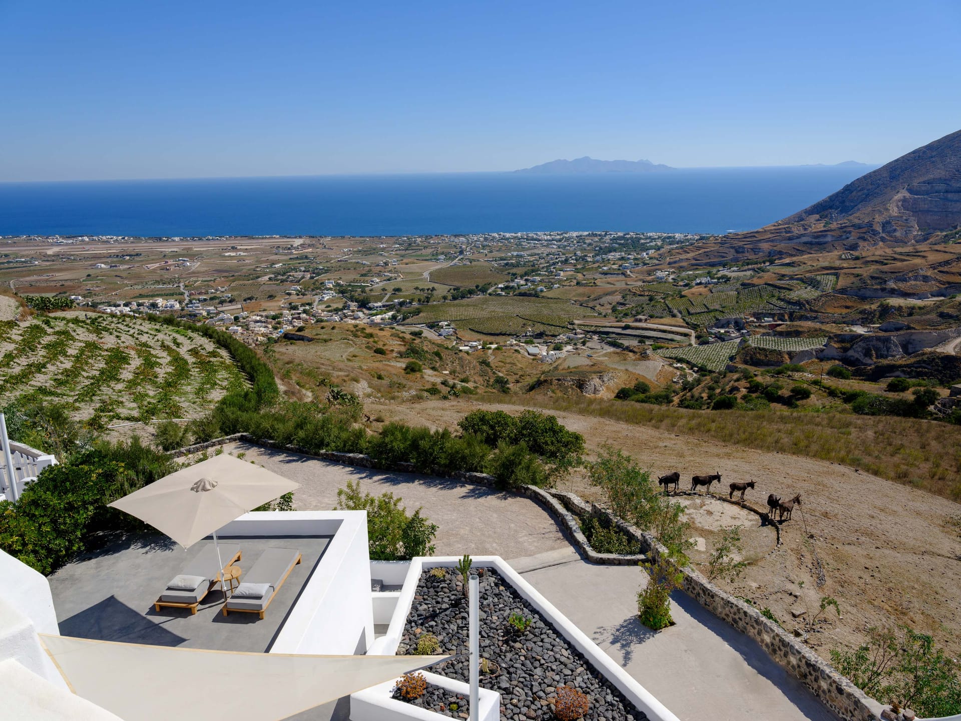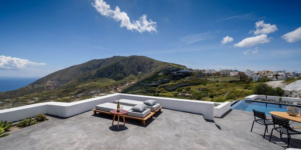 Spacious bedroom with king size bed, large living room with double sofa bed, bathroom with shower, wc, private large veranda with sitting area and pool, sunbeds and views to the sea and Kamari village.