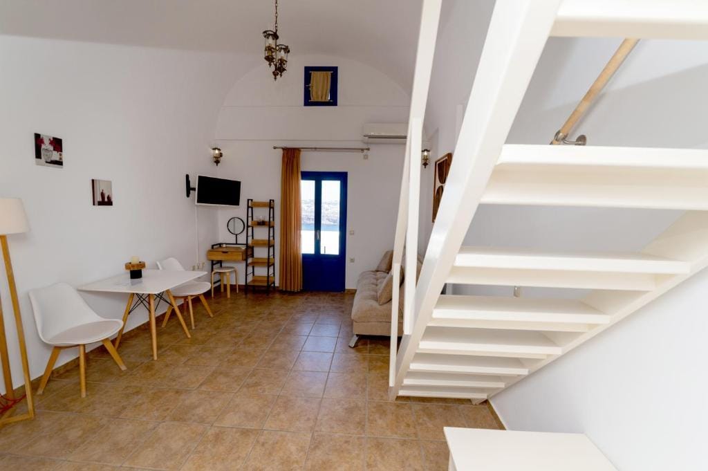 This Cycladic-style, split-level 28 sqm room, offers Caldera views. It features a spacious seating area with dining table. Please note that this room type can accommodate children over 12 years old.