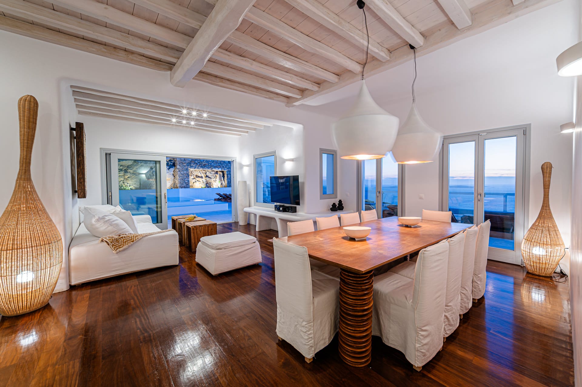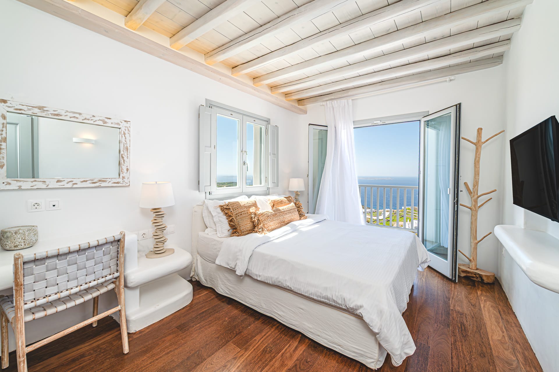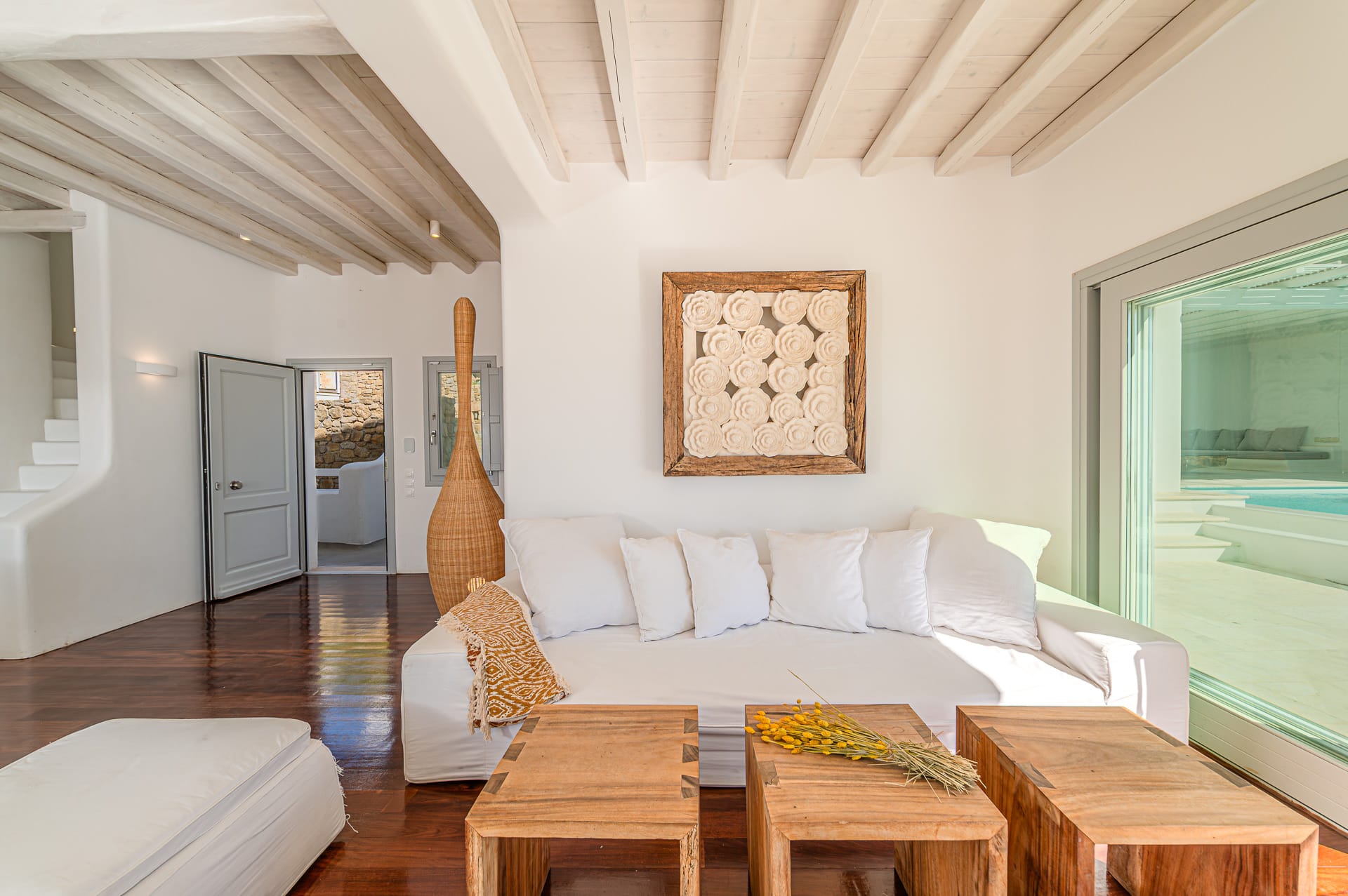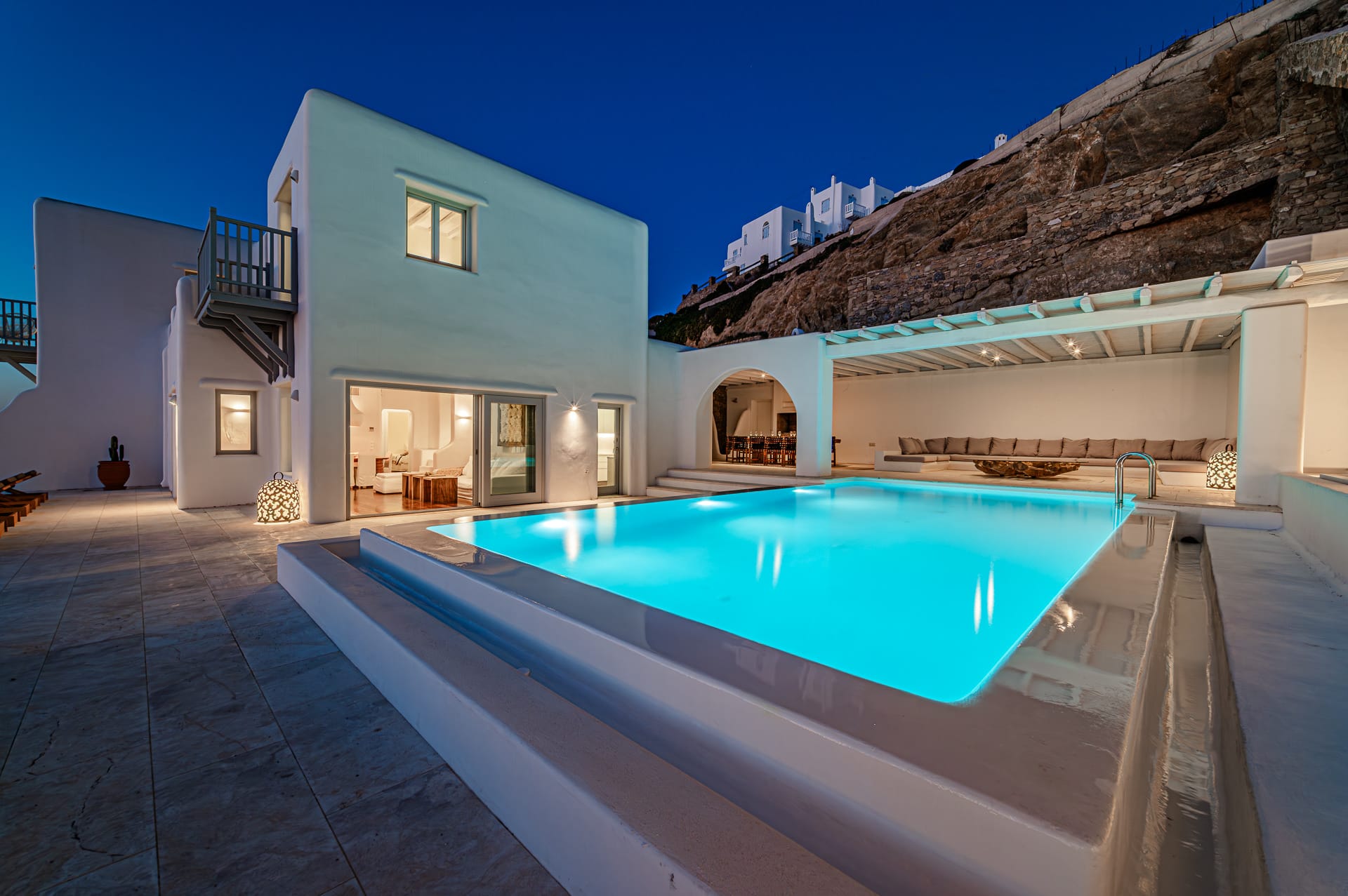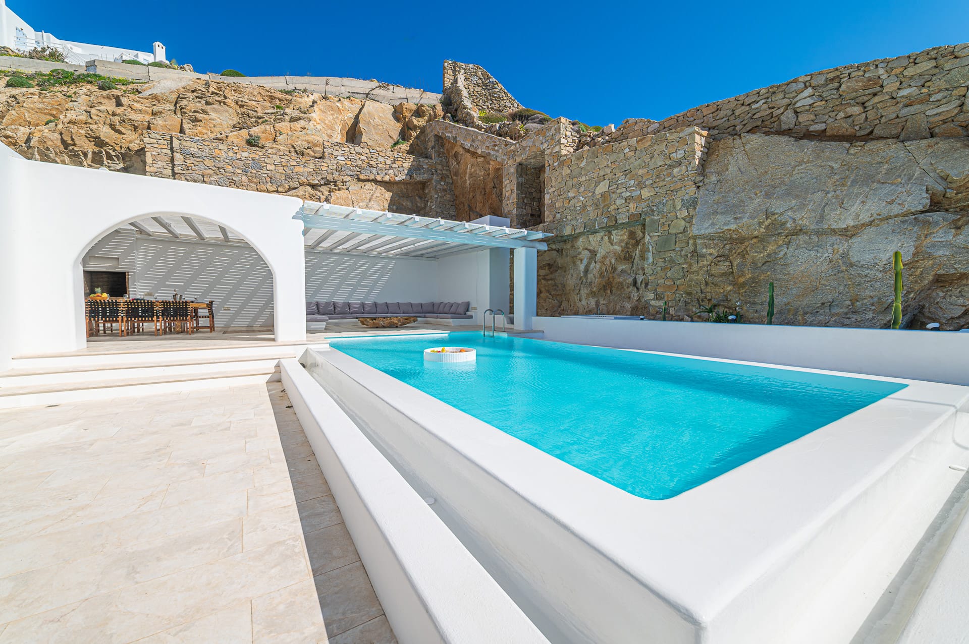 The Cycladic Mykonian architecture of this beautiful villa, in combination with the modern furniture, creates an elegant result as well as an impressive atmosphere.