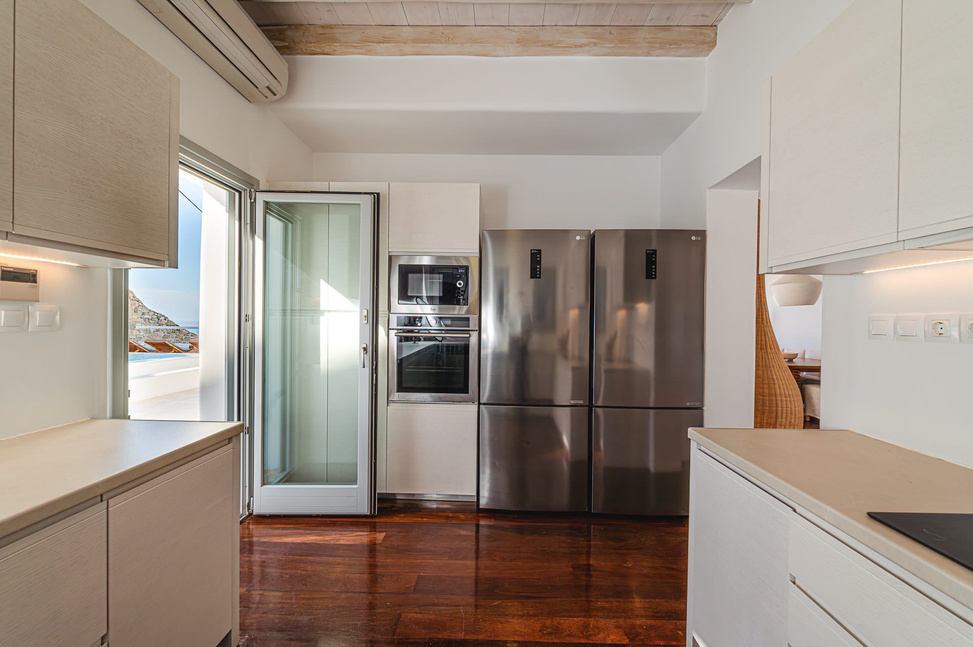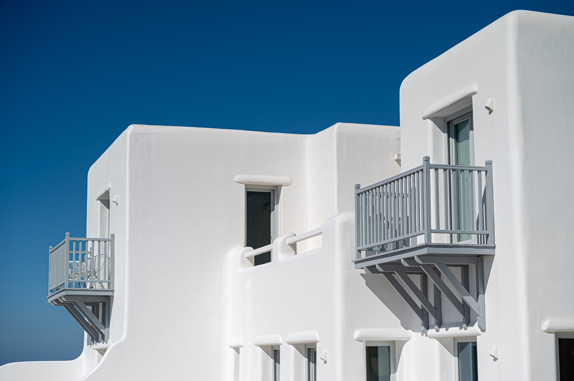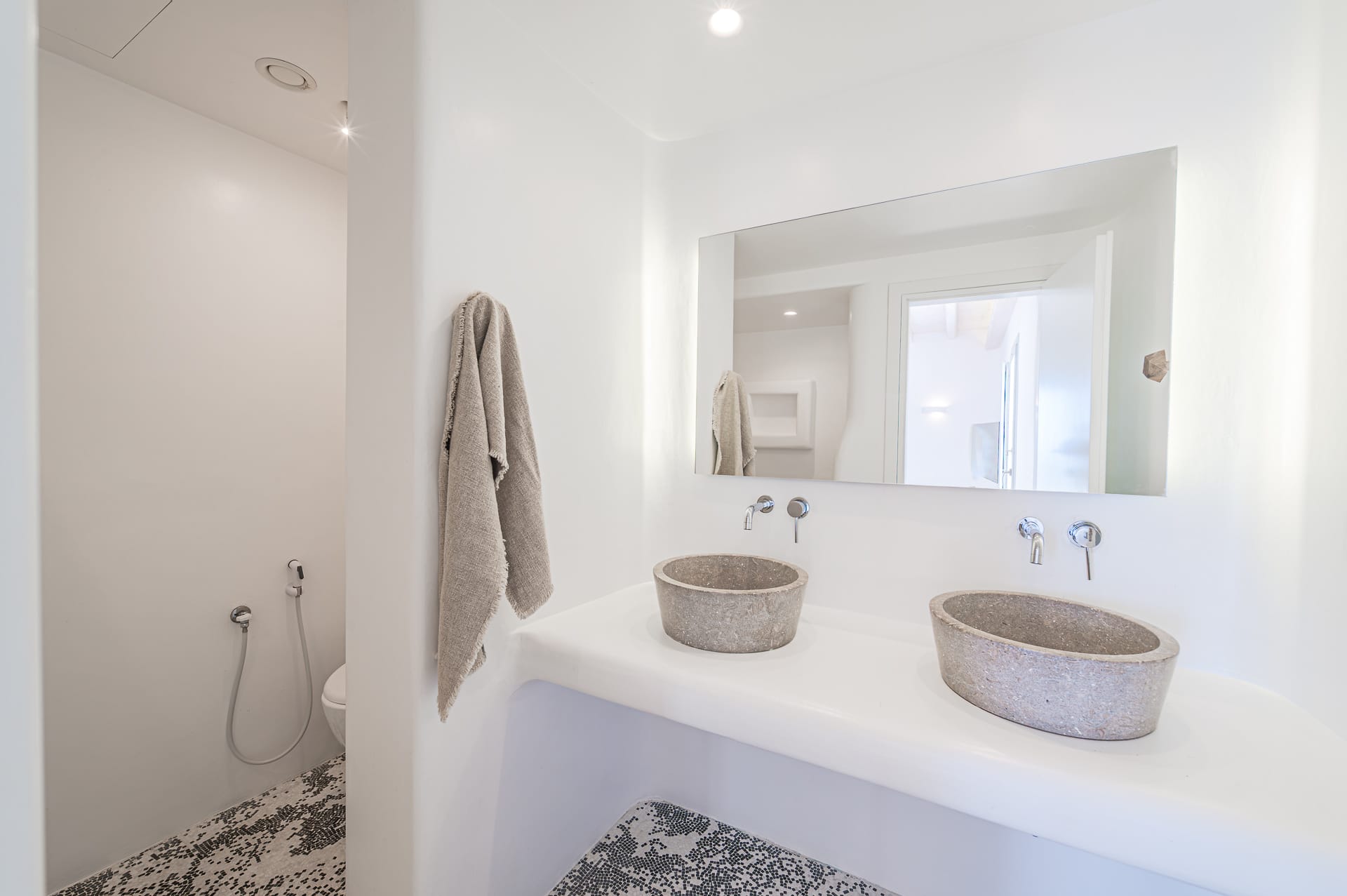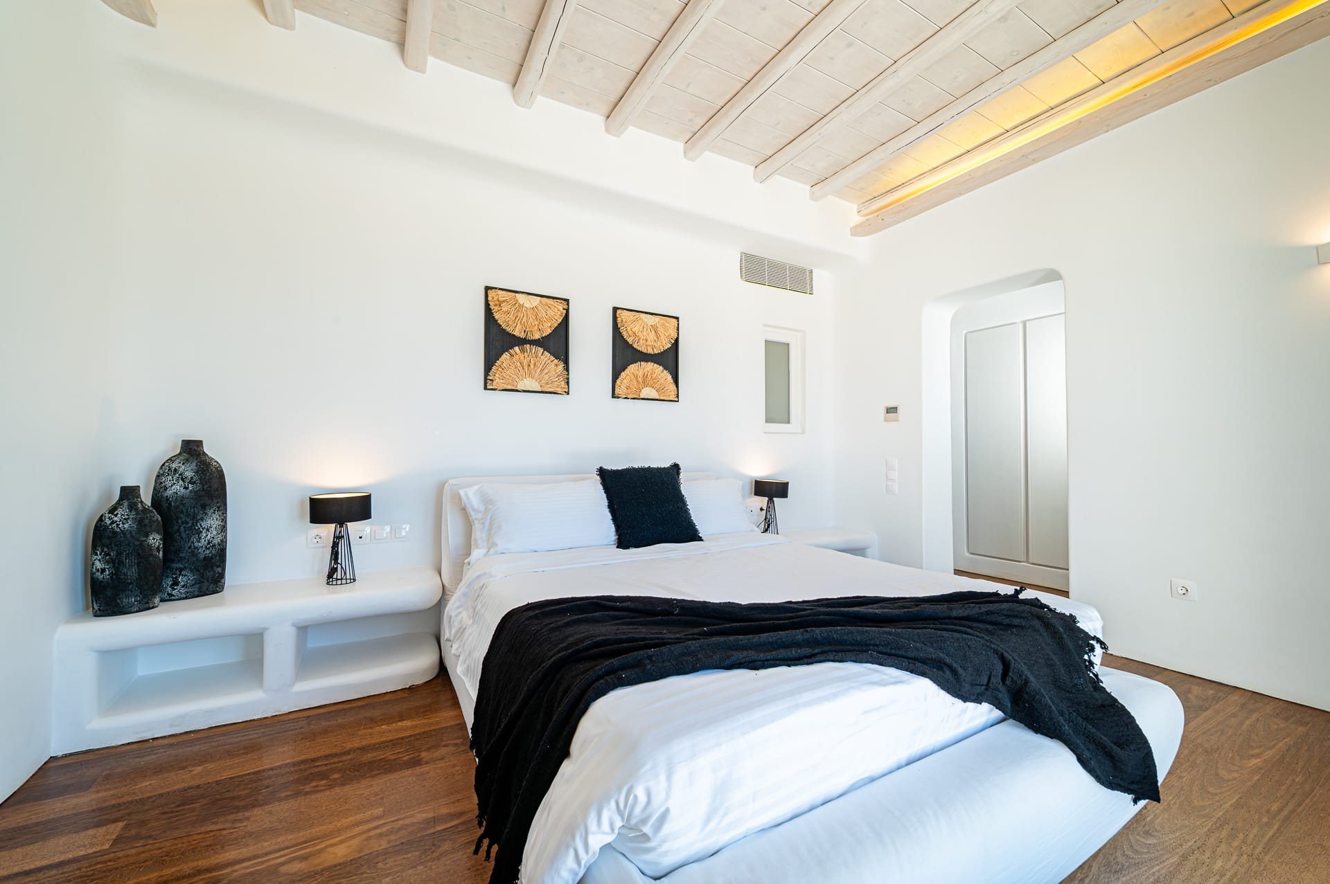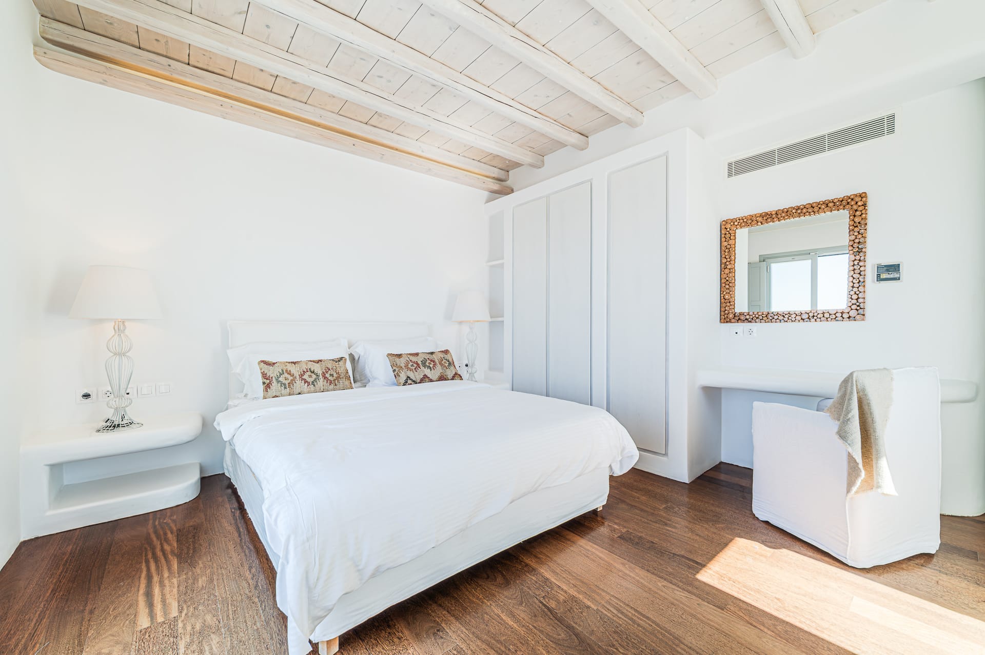 The Cycladic Mykonian architecture of this beautiful villa, in combination with the modern furniture, creates an elegant result as well as an impressive atmosphere.