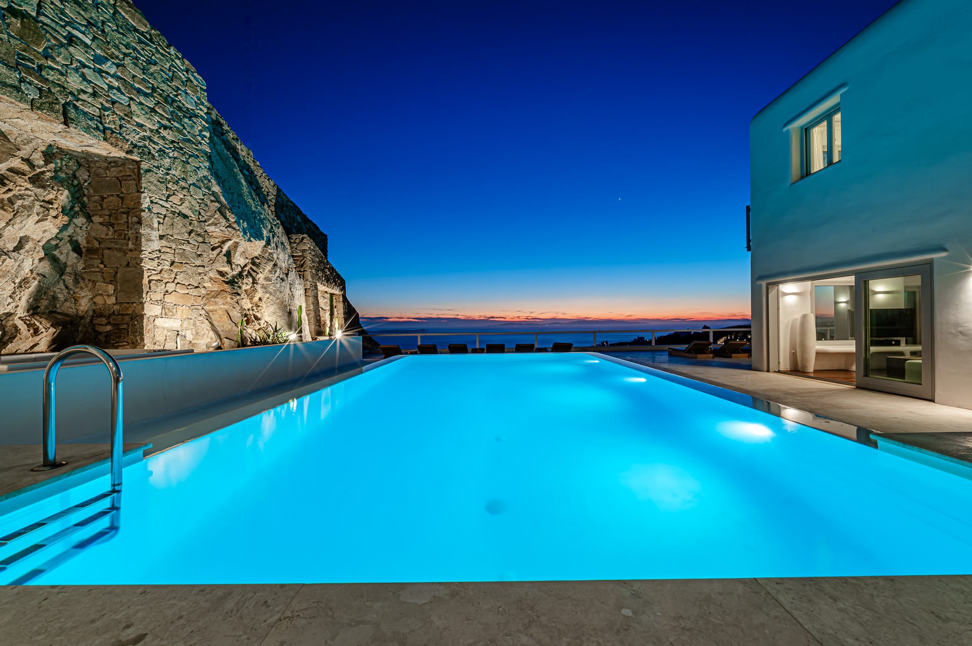 The 50 sq. meter infinity pool, offering breathtaking sunset views of the Aegean Sea, is the centerpiece of the villa's grounds. Complementing the pool is a spacious dining area with seating for 12, along with multiple shaded lounge spaces beneath beautiful pergolas. These areas are perfect for relaxation during the day or hosting romantic dinners and cocktail events in the evening. Surrounded by natural rocky landscapes, the villa's outdoor design creates a serene and luxurious environment, blending seamlessly with nature to deliver a unique experience.
