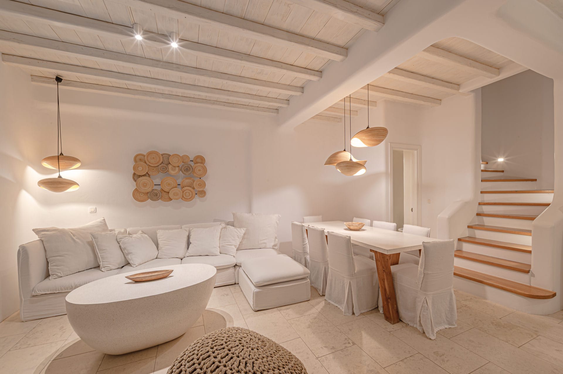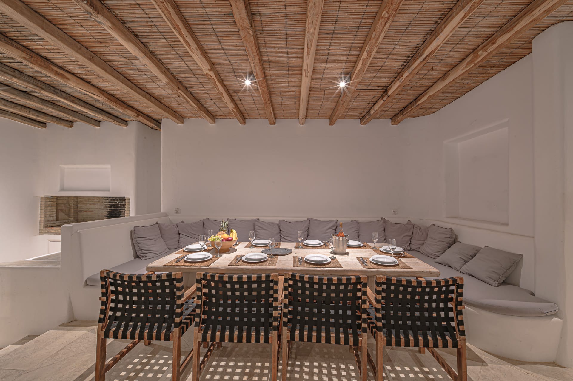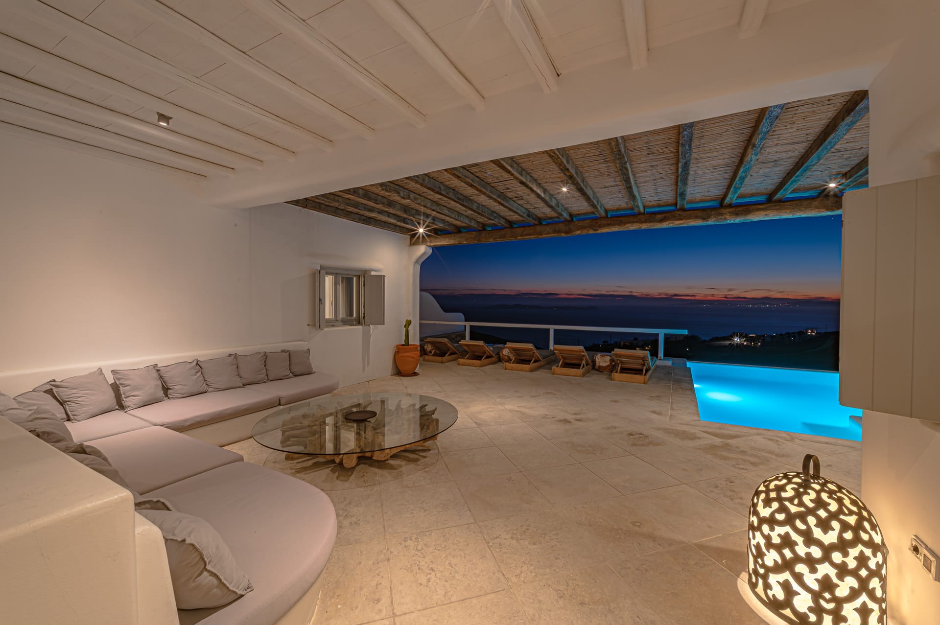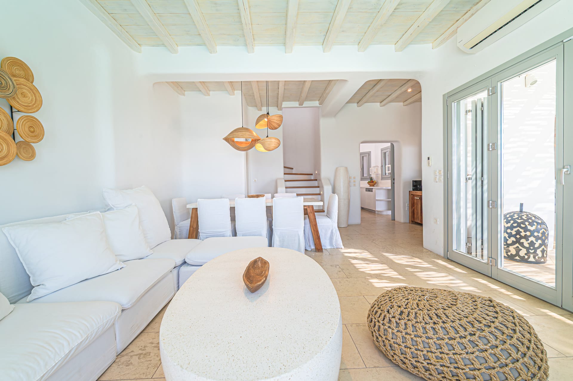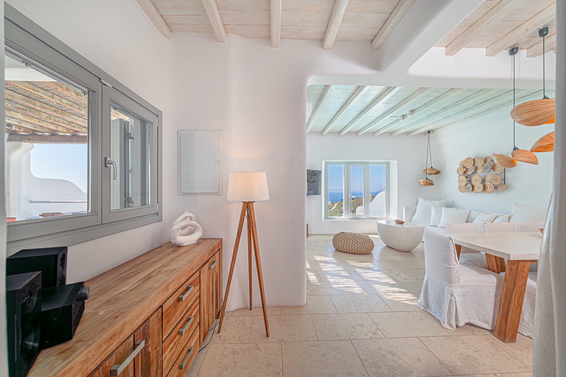 The Cycladic Mykonian architecture of this beautiful villa, in combination with the modern furniture, creates an elegant result as well as an impressive atmosphere.