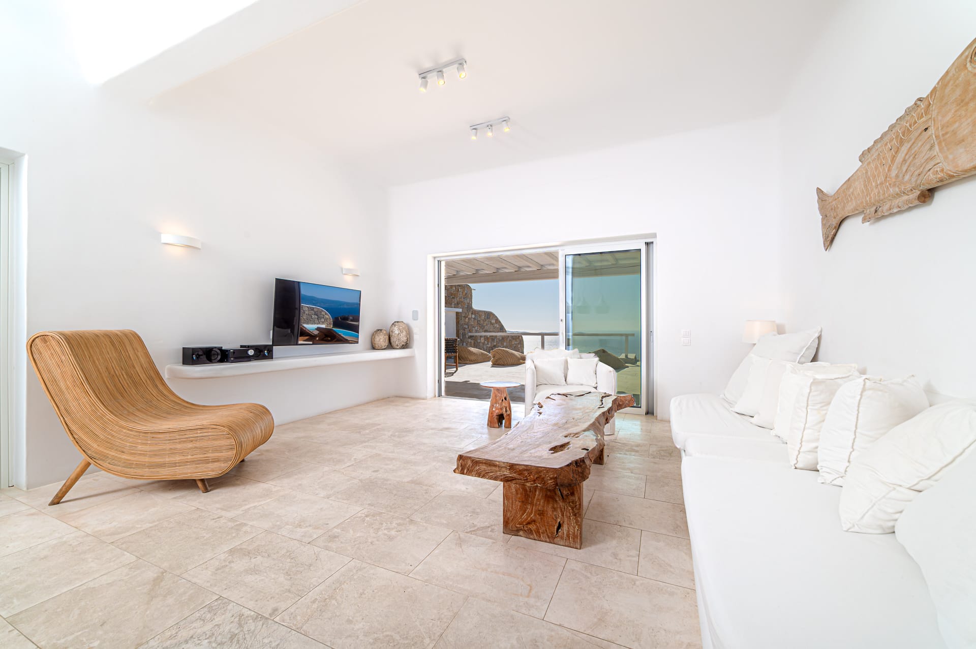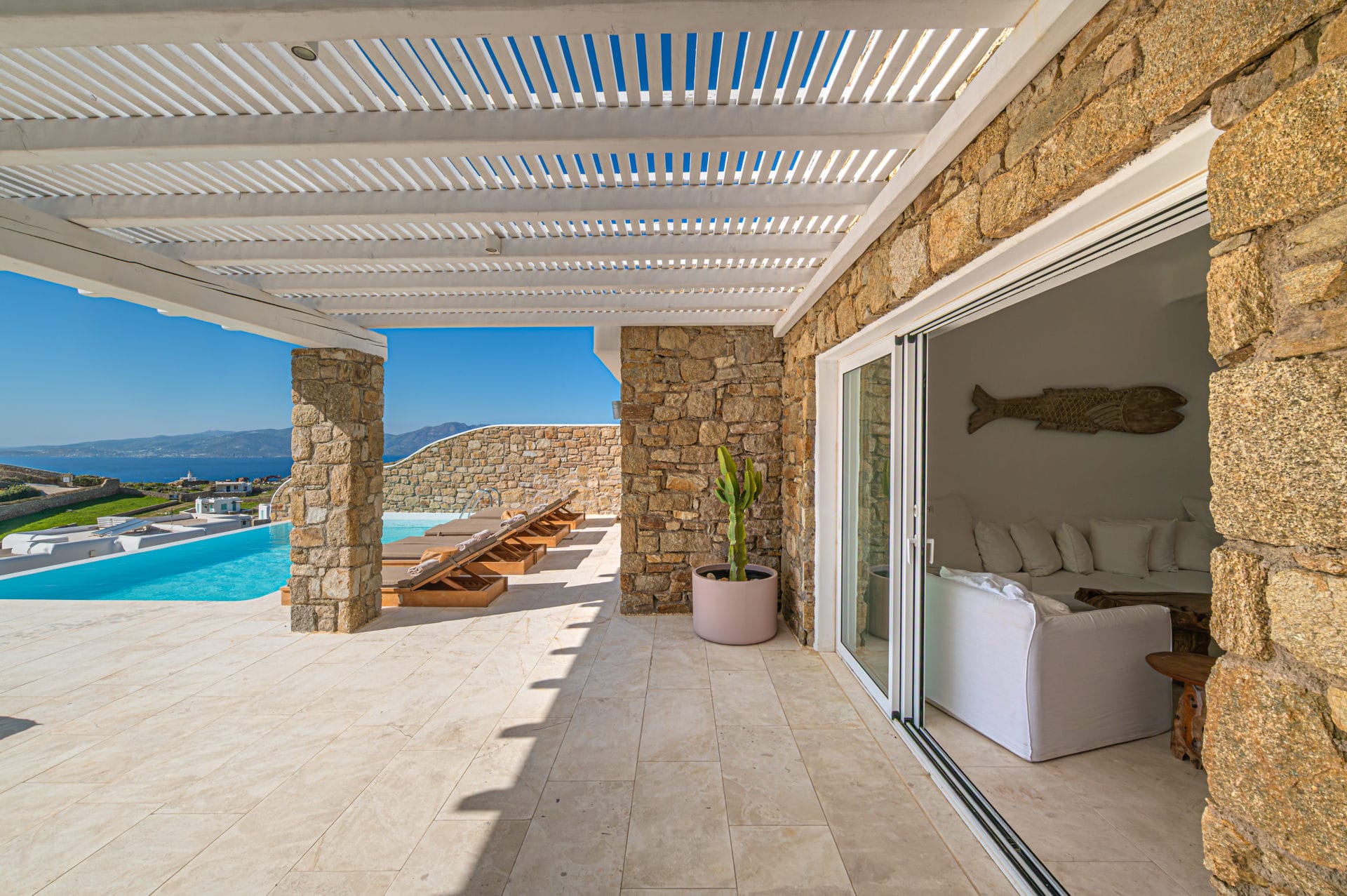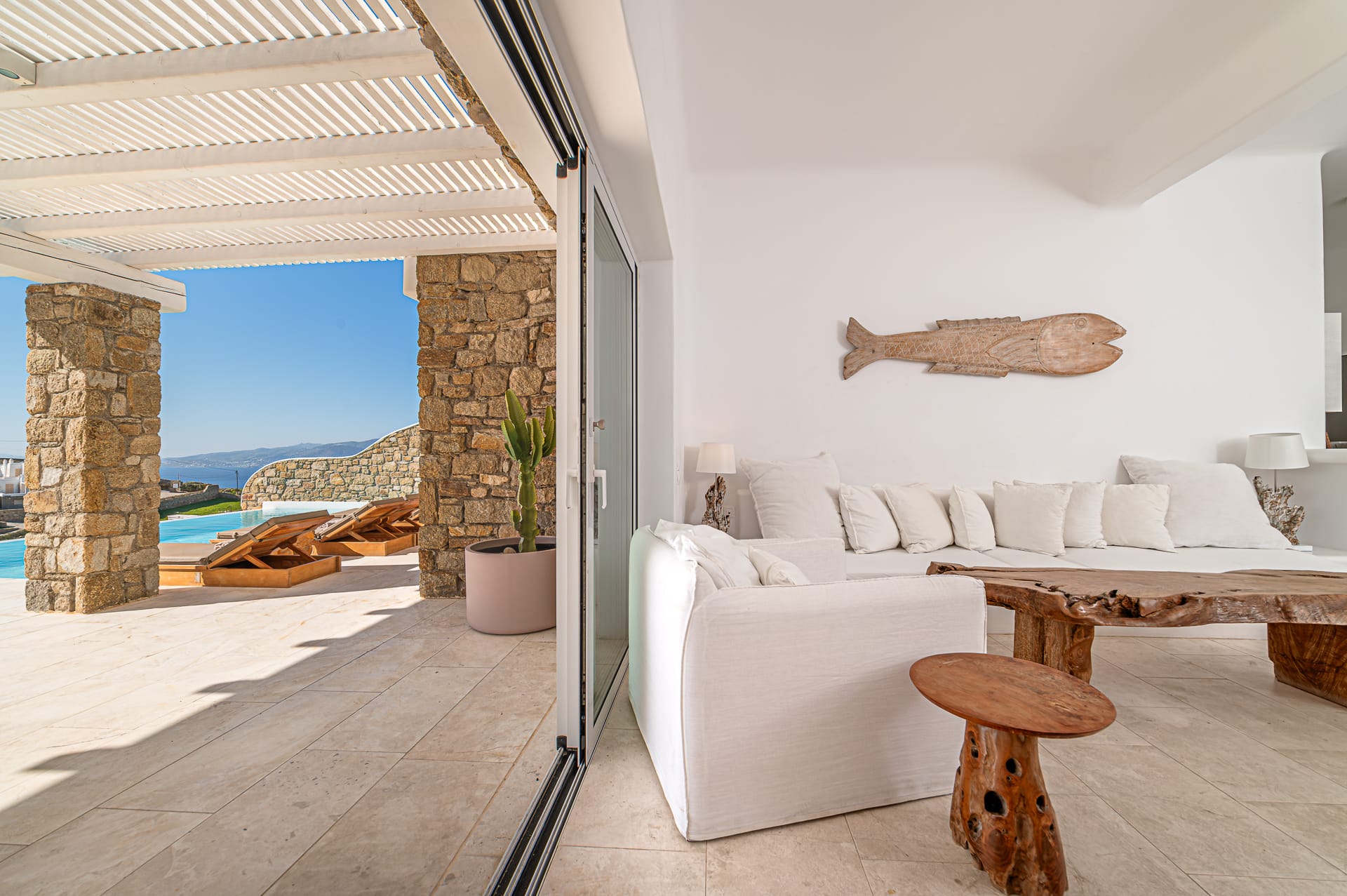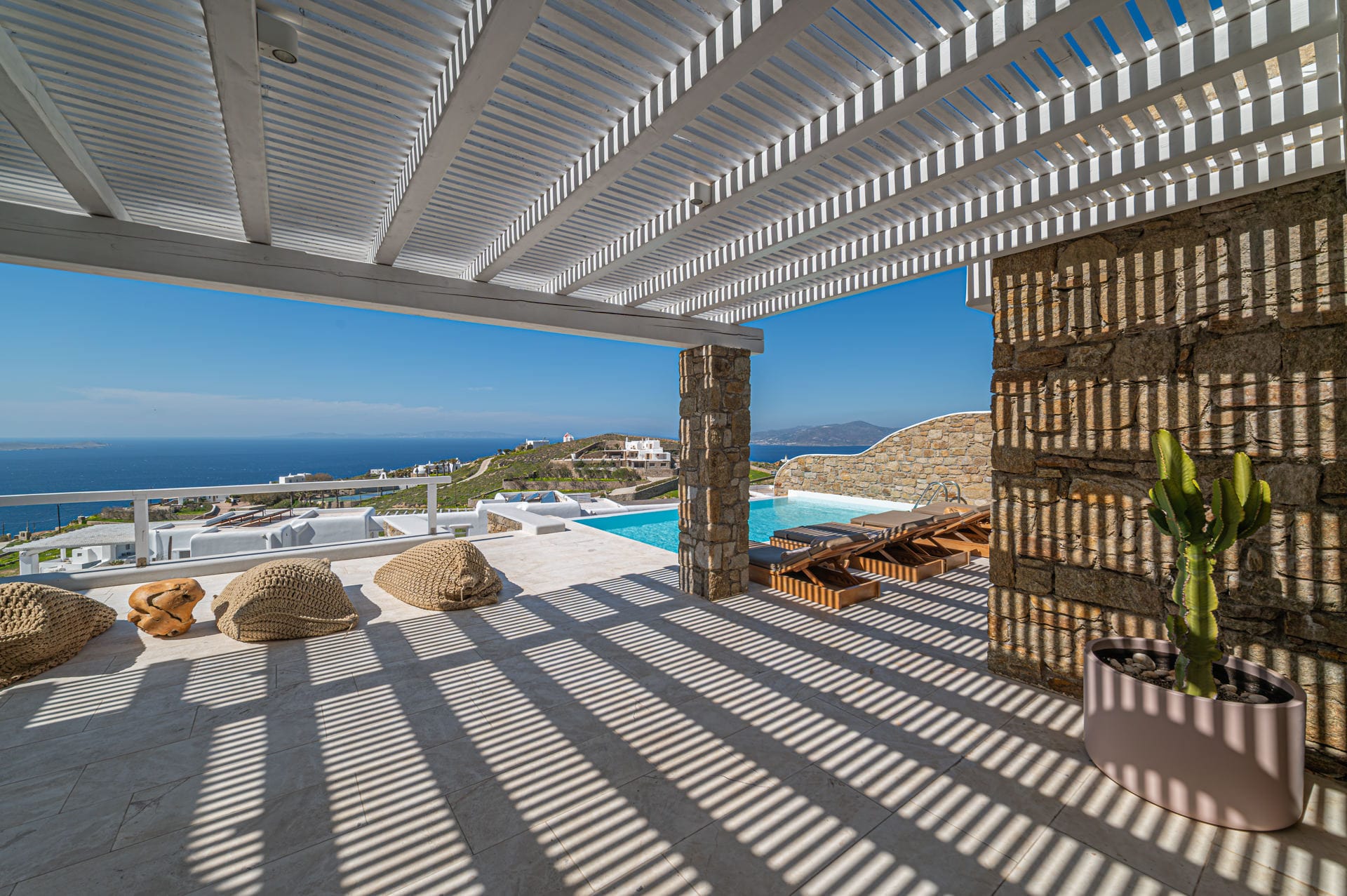 The Cycladic Mykonian architecture of this beautiful villa, in combination with the modern furniture, creates an elegant result as well as an impressive atmosphere.
