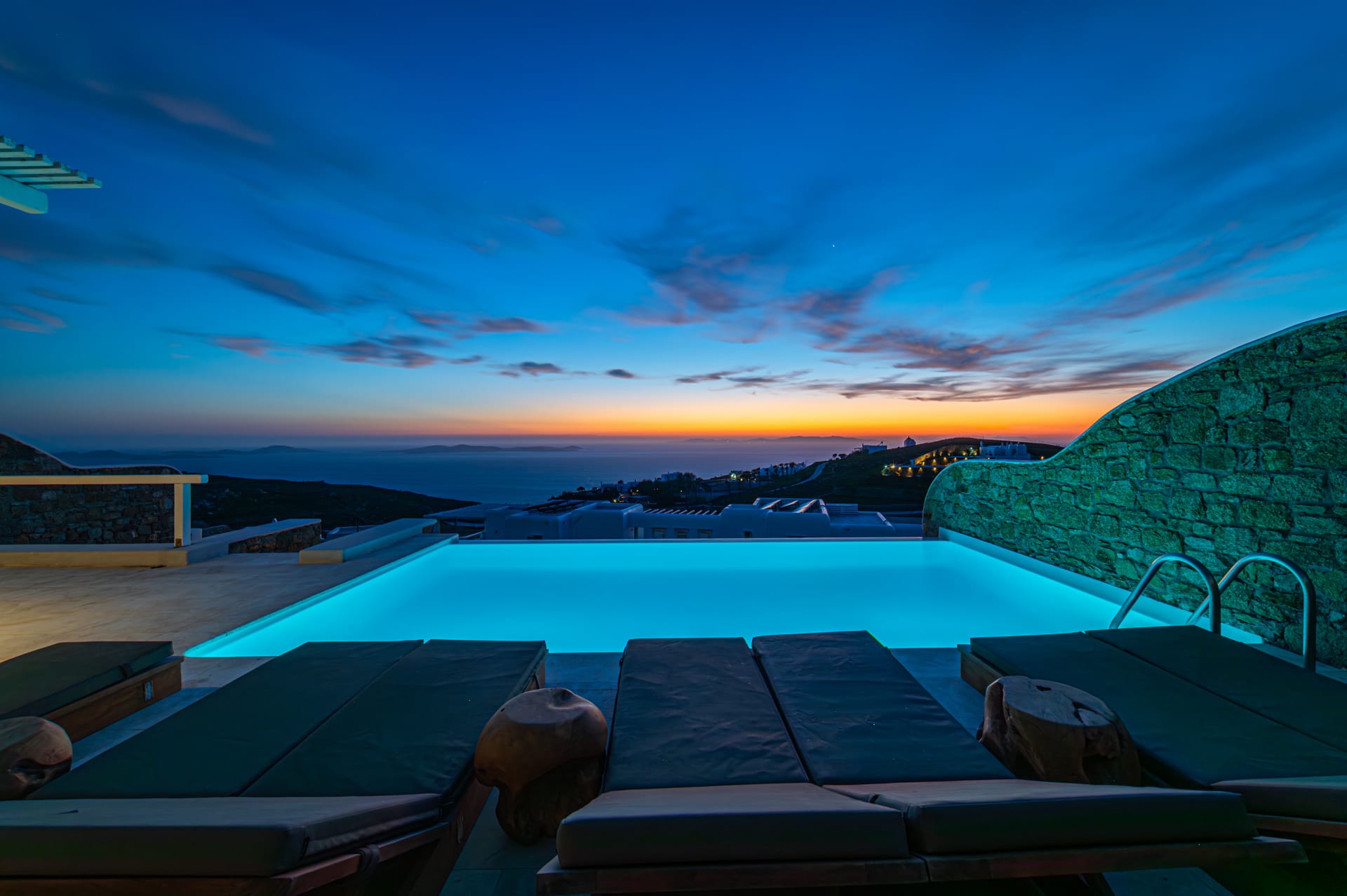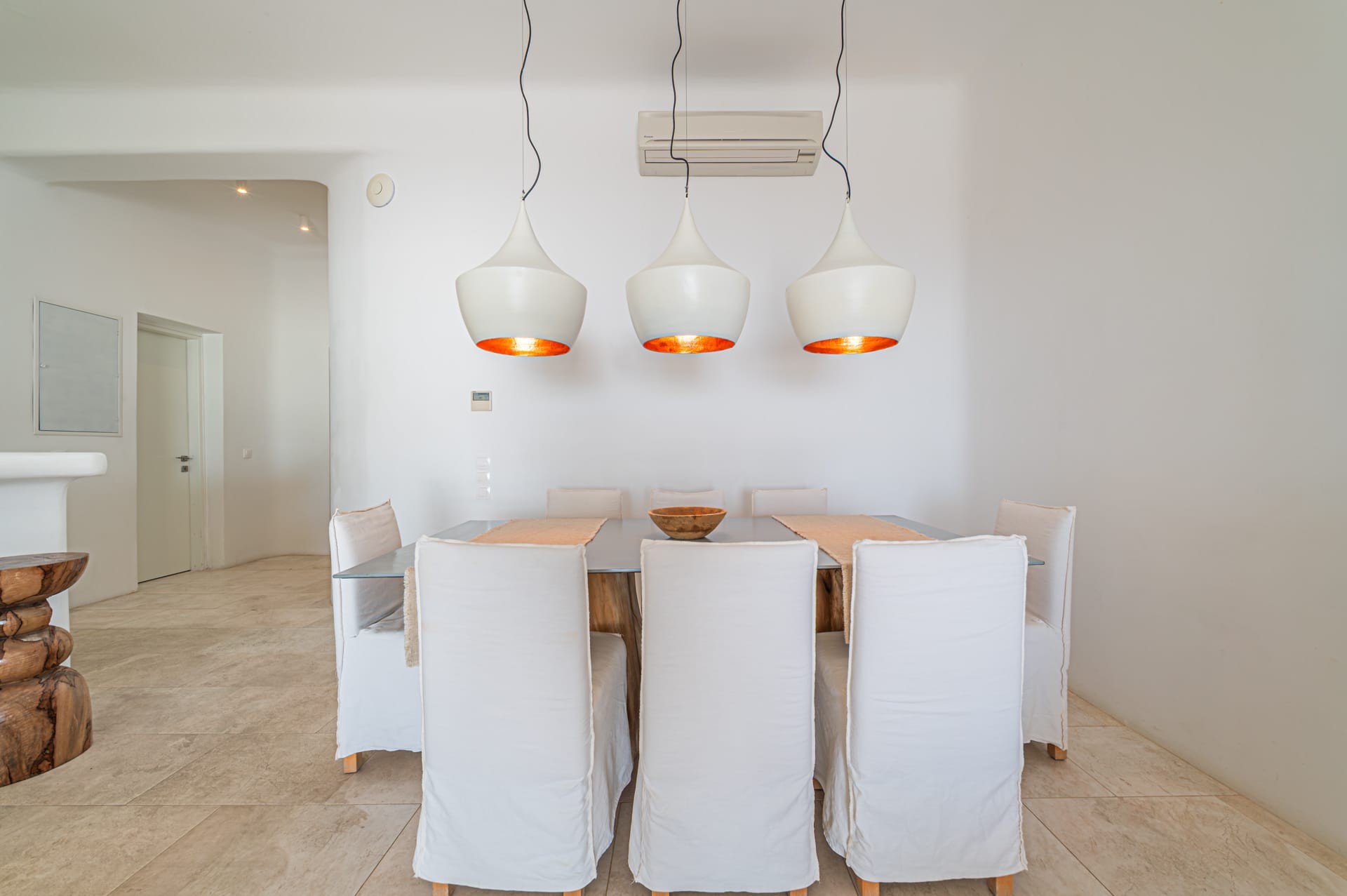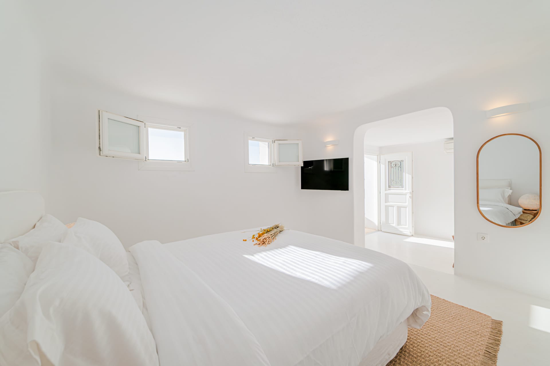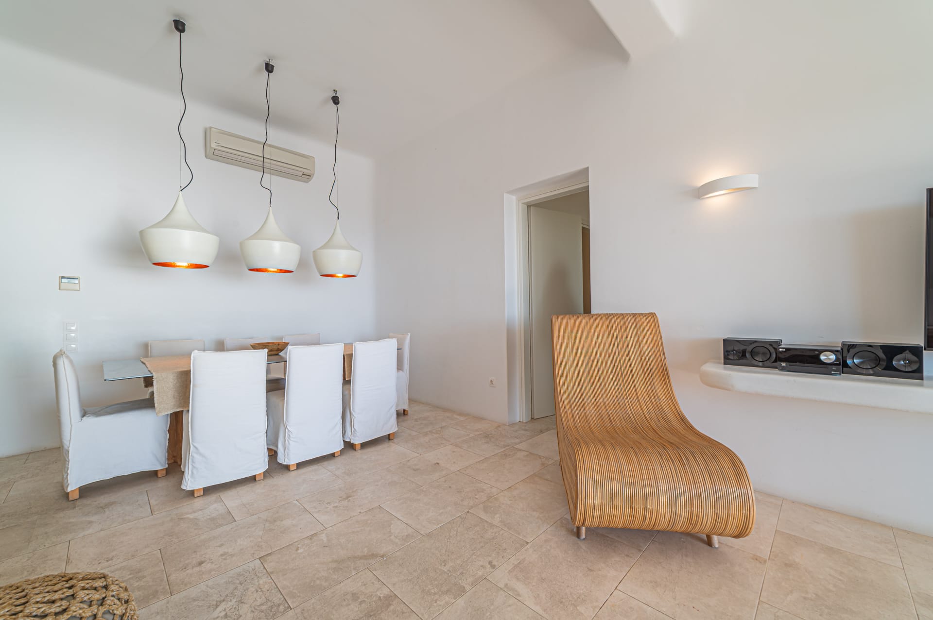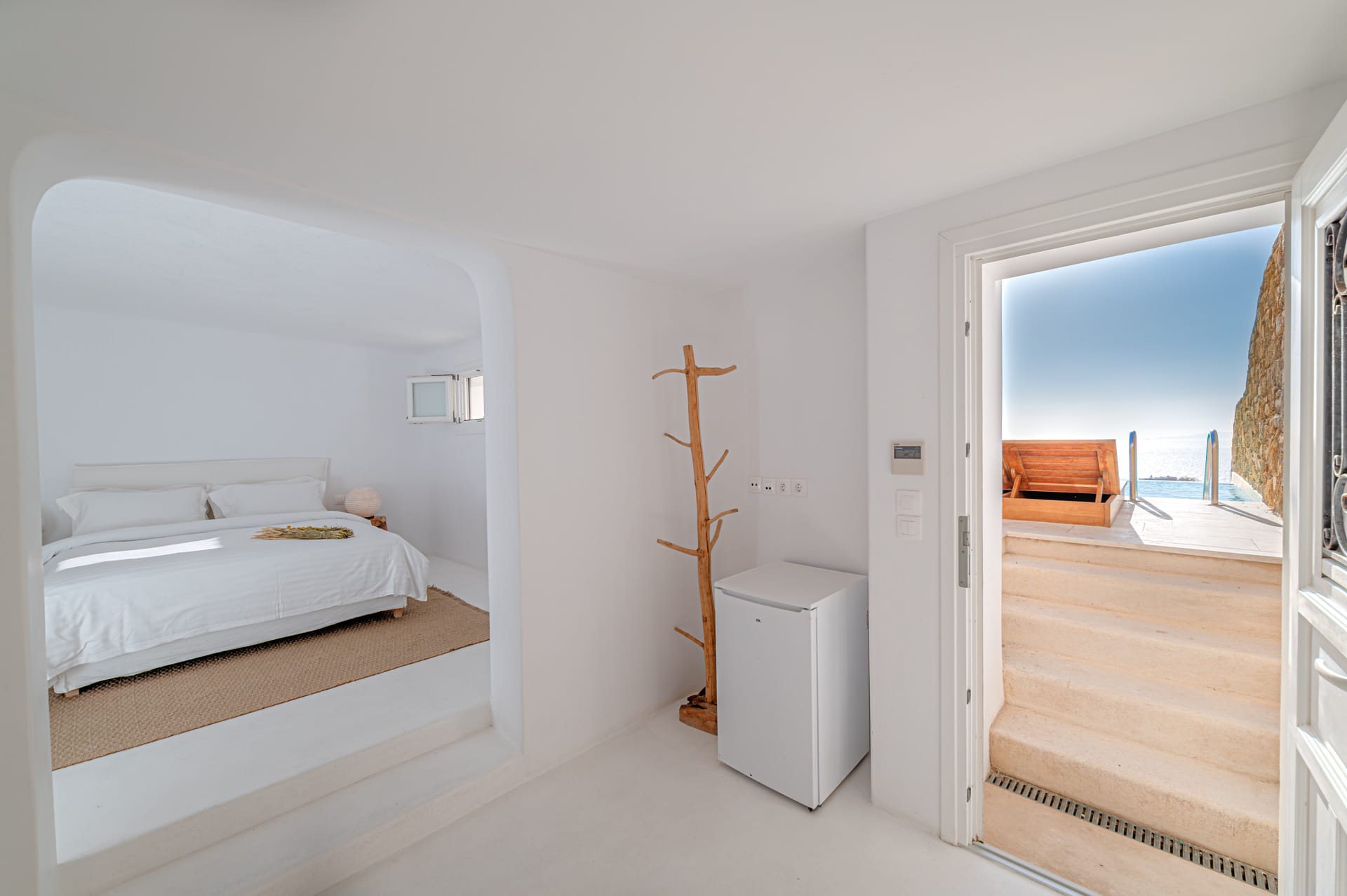 The Cycladic Mykonian architecture of this beautiful villa, in combination with the modern furniture, creates an elegant result as well as an impressive atmosphere.