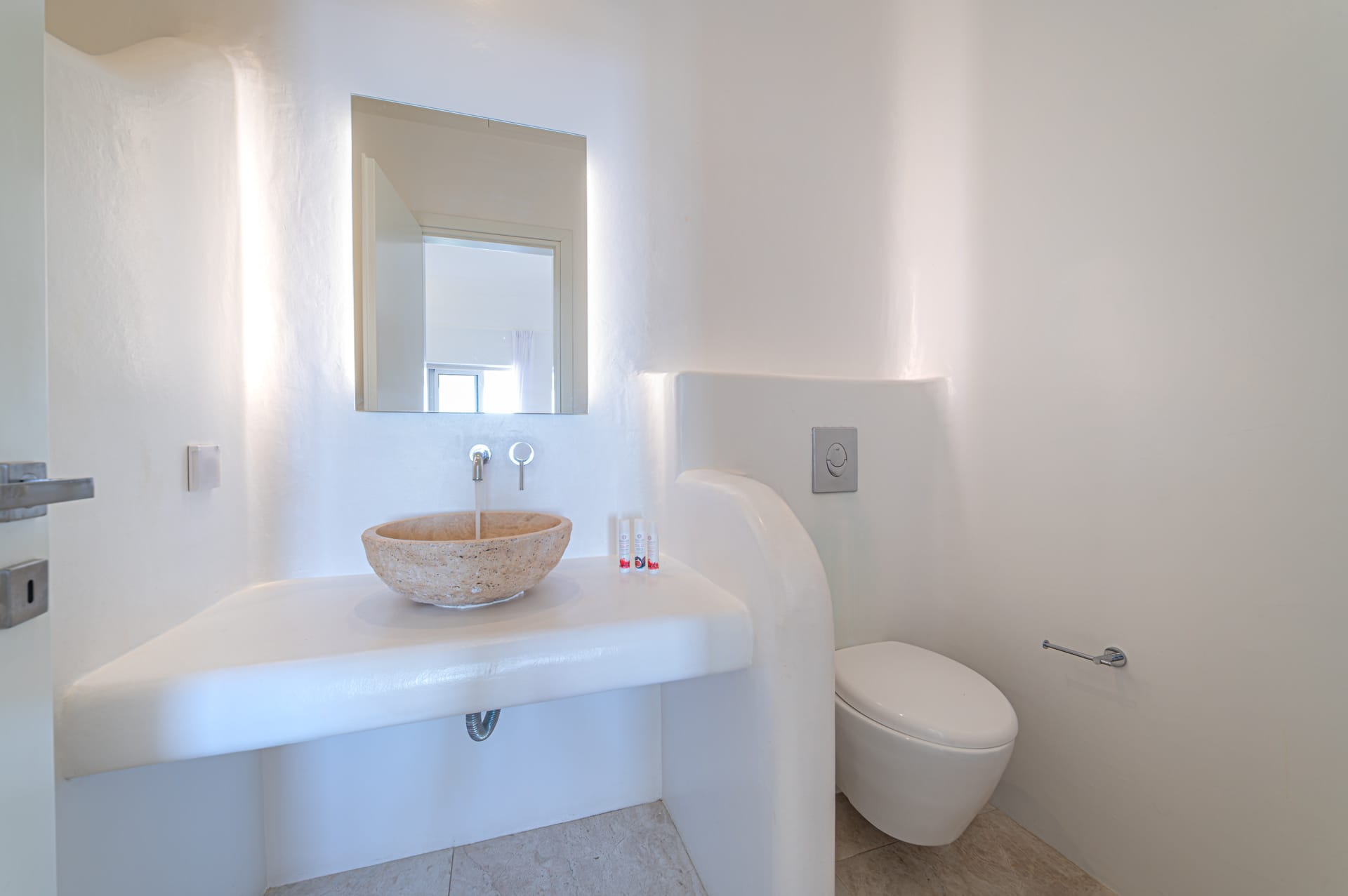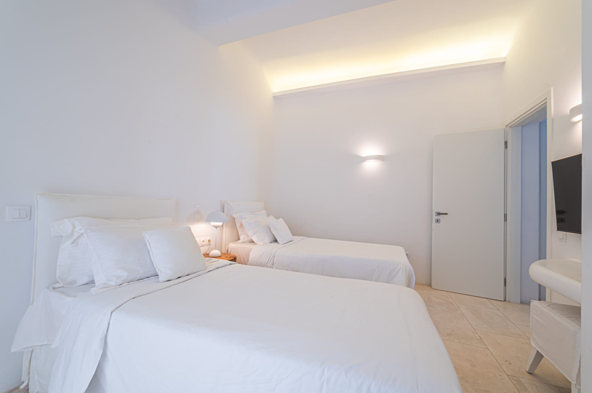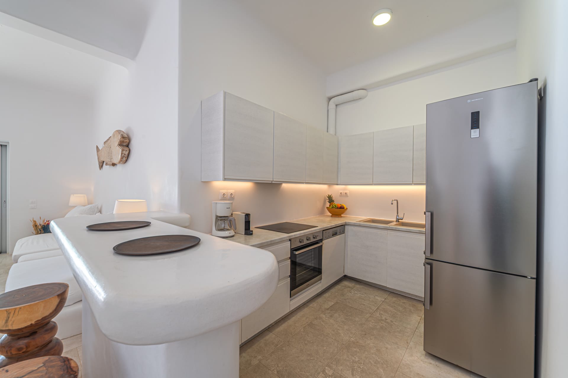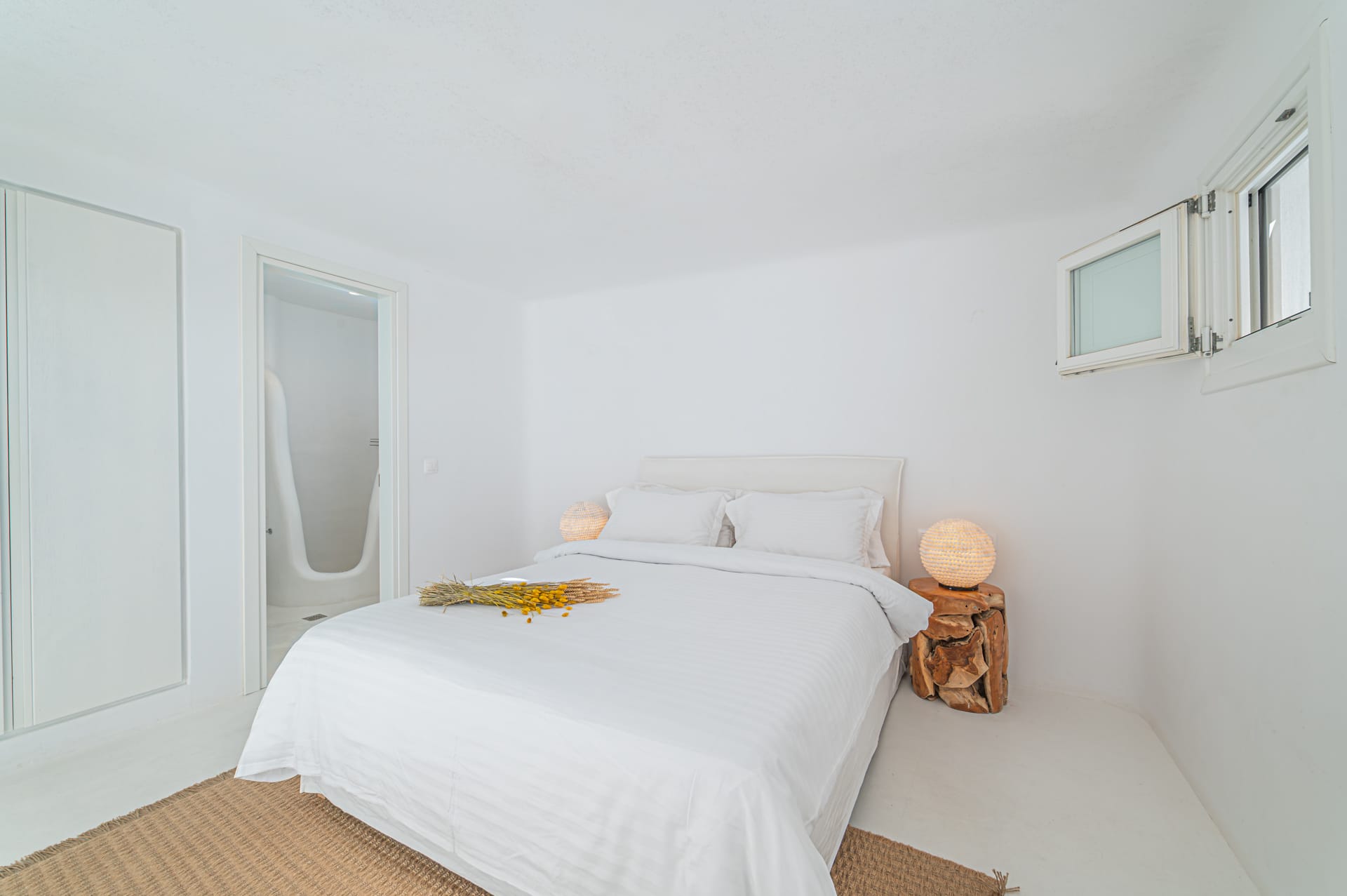 The Cycladic Mykonian architecture of this beautiful villa, in combination with the modern furniture, creates an elegant result as well as an impressive atmosphere.