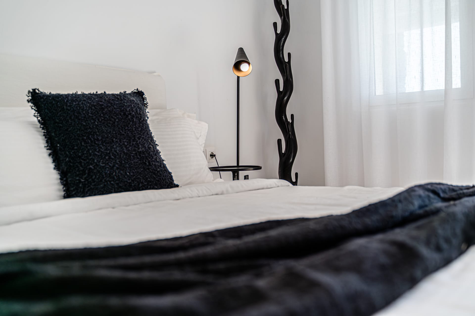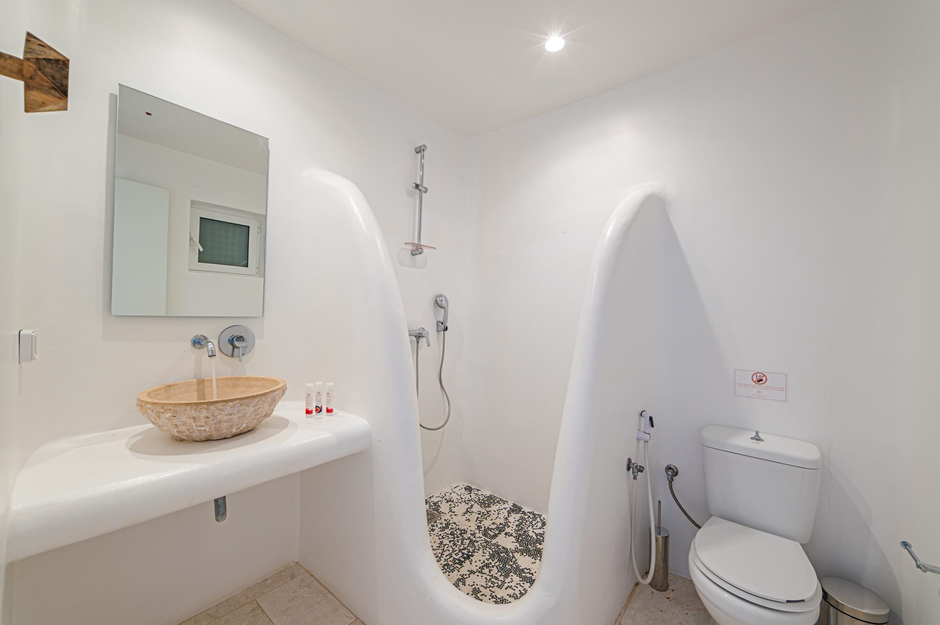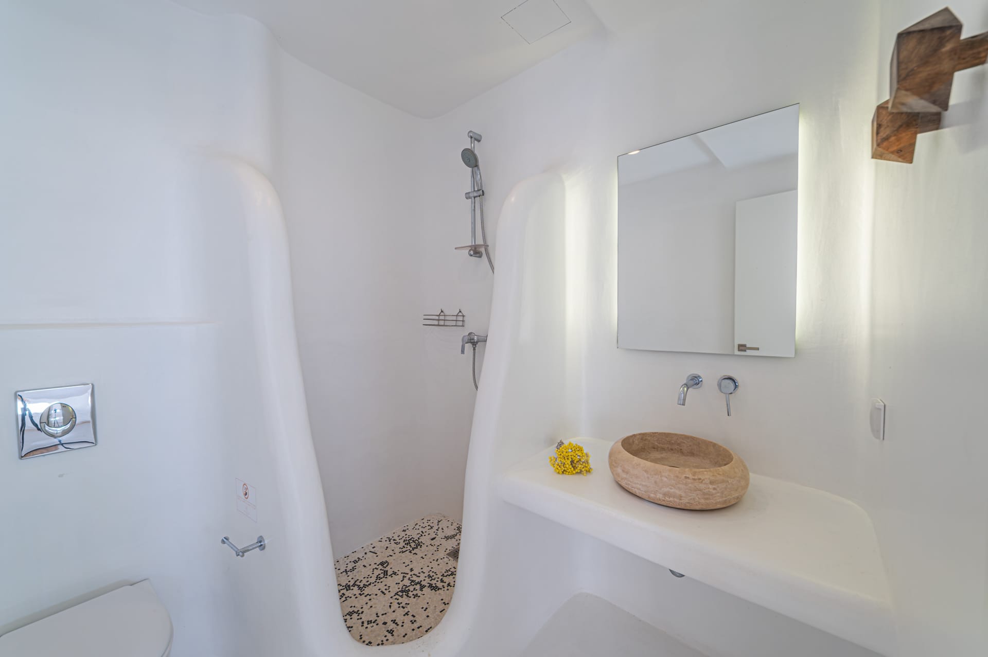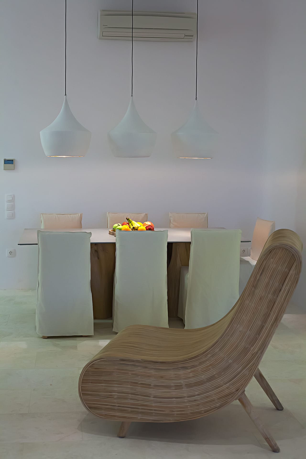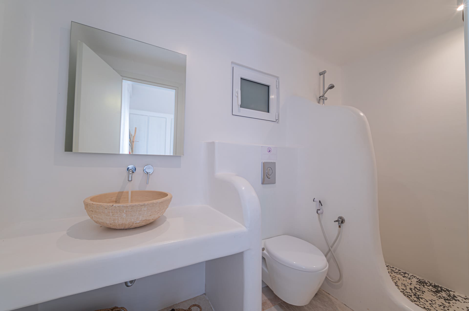 The Cycladic Mykonian architecture of this beautiful villa, in combination with the modern furniture, creates an elegant result as well as an impressive atmosphere.