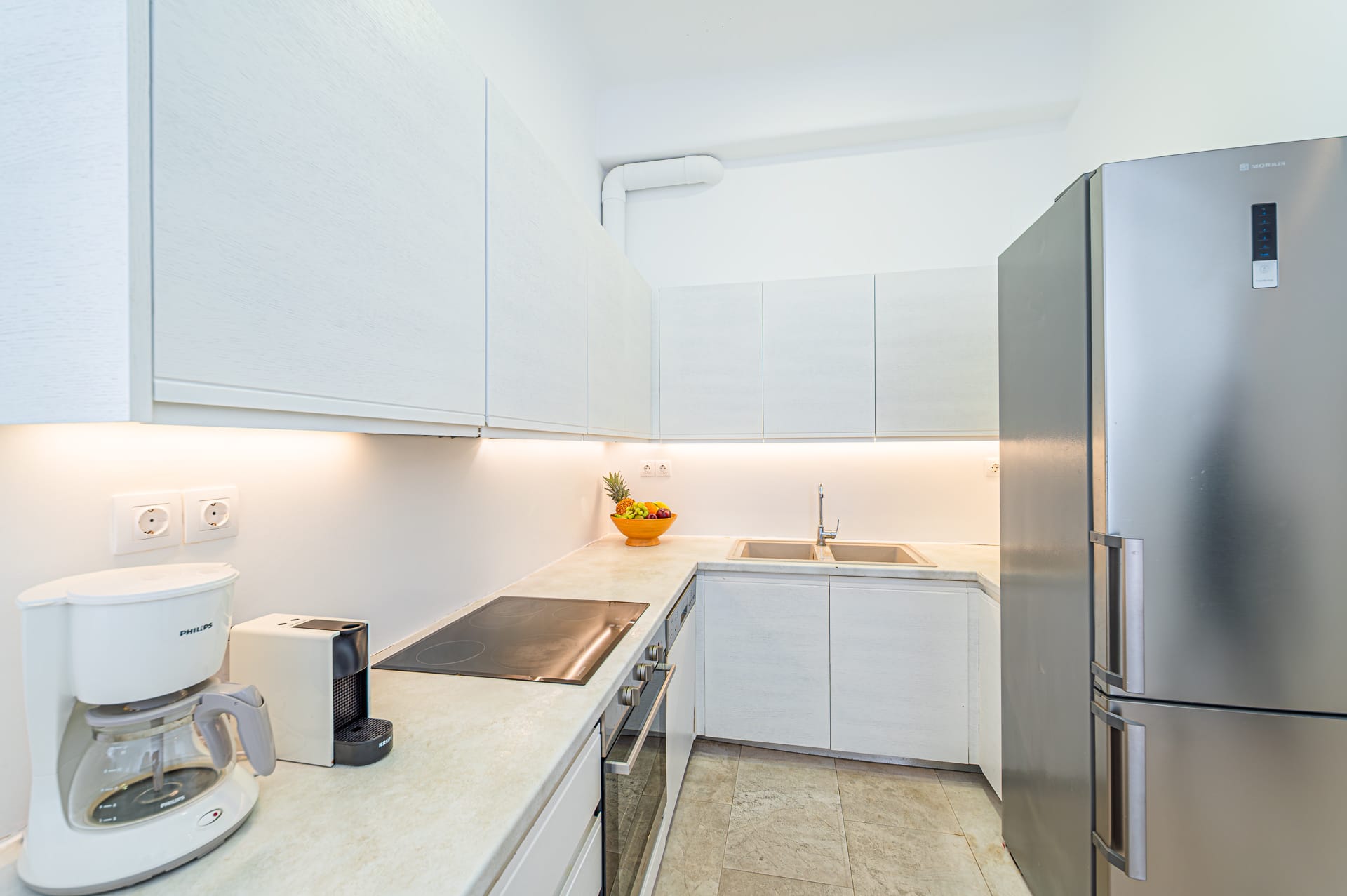 🍽️ Open-plan fully equipped kitchen with state-of-the-art appliances: oven, hotplates, fridge, Nespresso machine, filter coffee maker, toaster and easy access to the terrace.