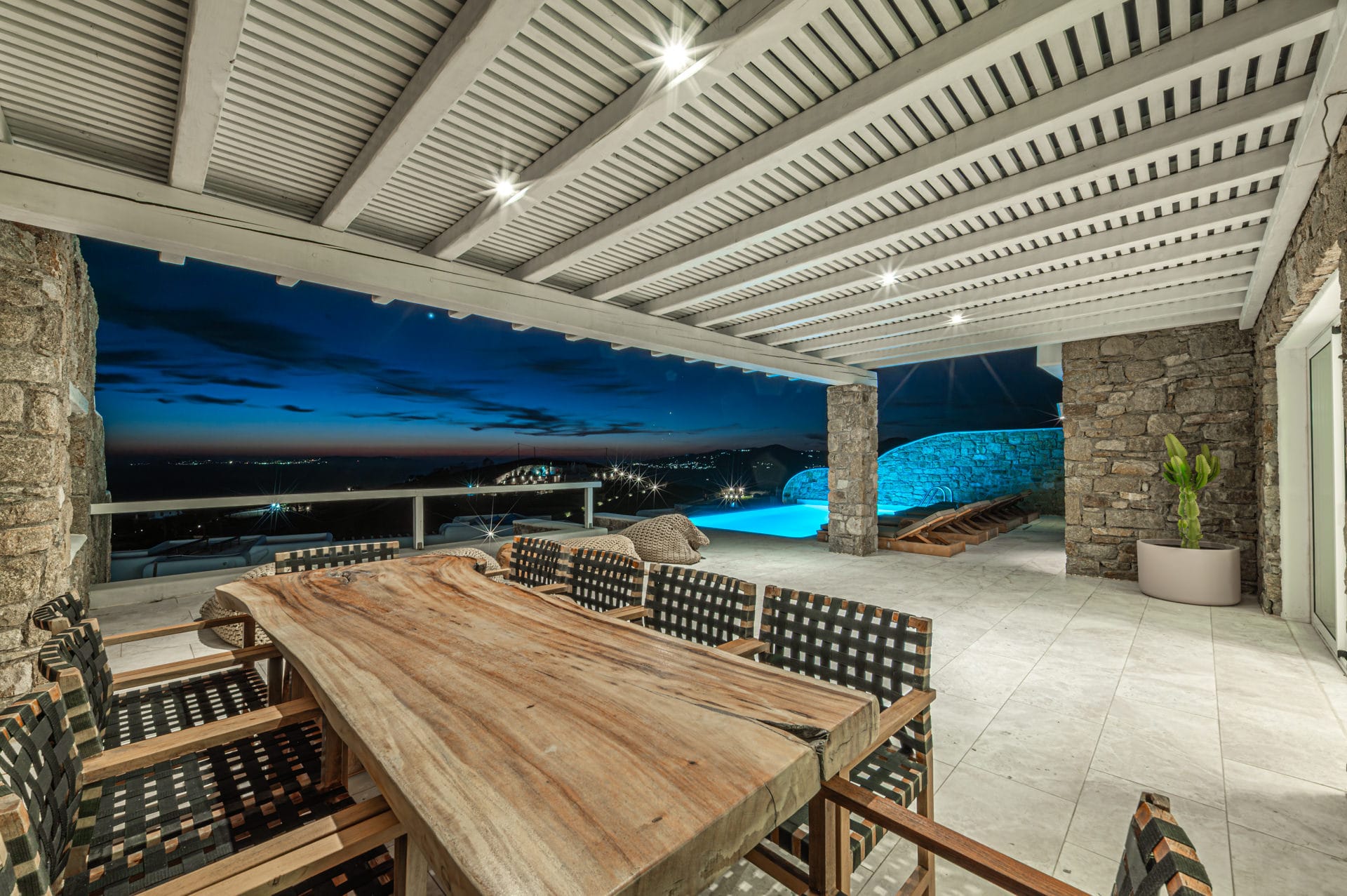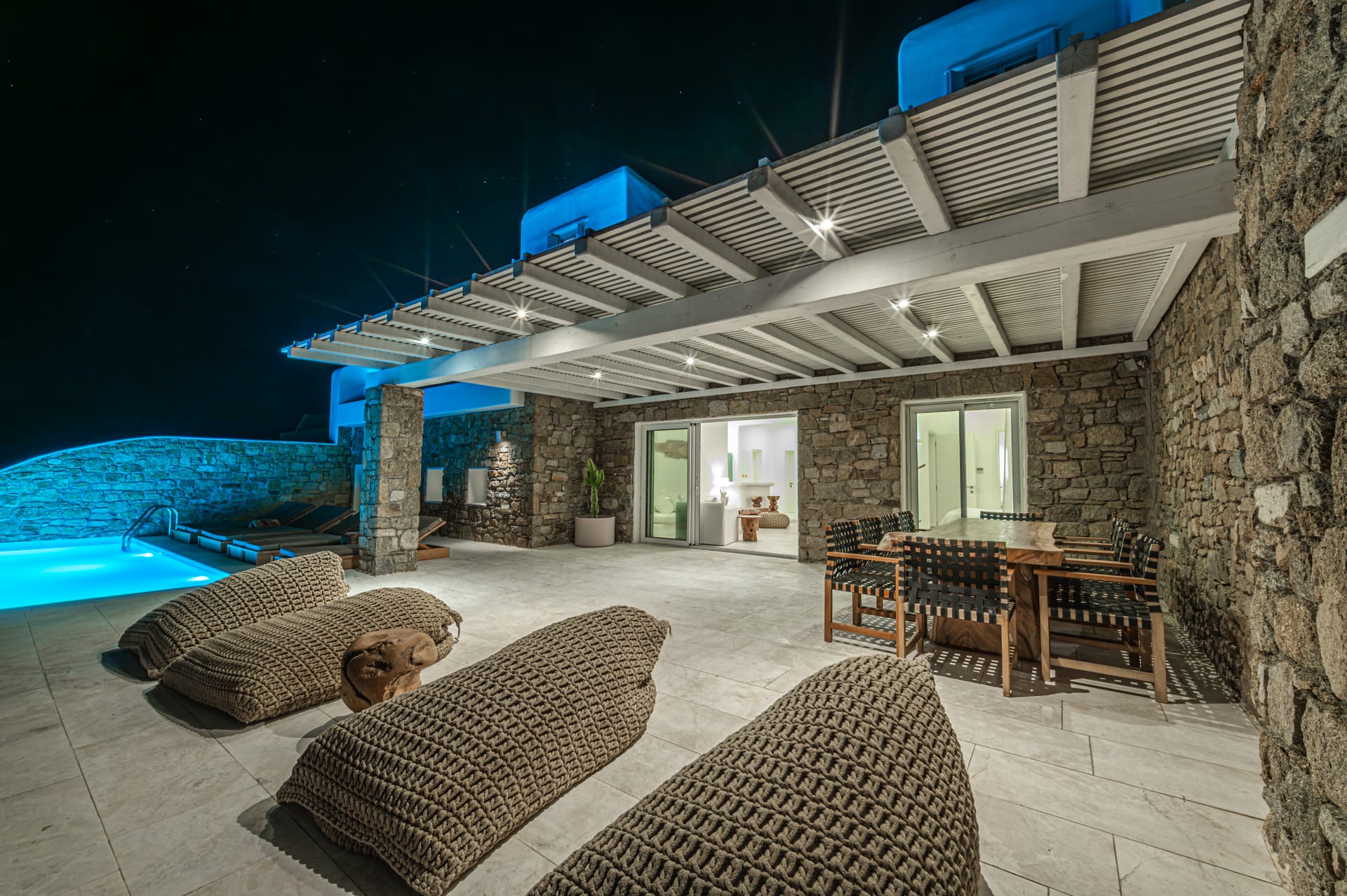 The 30 sq. meter infinity pool, offering breathtaking sunset views of the Aegean Sea, is the centerpiece of the villa's grounds. Complementing the pool is a spacious dining area, along with multiple shaded lounge spaces beneath beautiful pergolas. These areas are perfect for relaxation during the day or hosting romantic dinners and cocktail events in the evening. Surrounded by natural rocky landscapes, the villa's outdoor design creates a serene and luxurious environment, blending seamlessly with nature to deliver a unique experience.