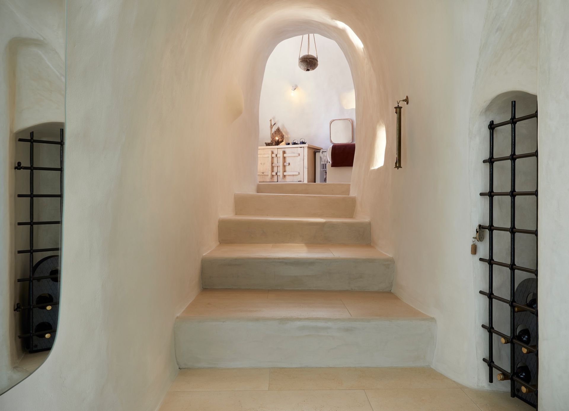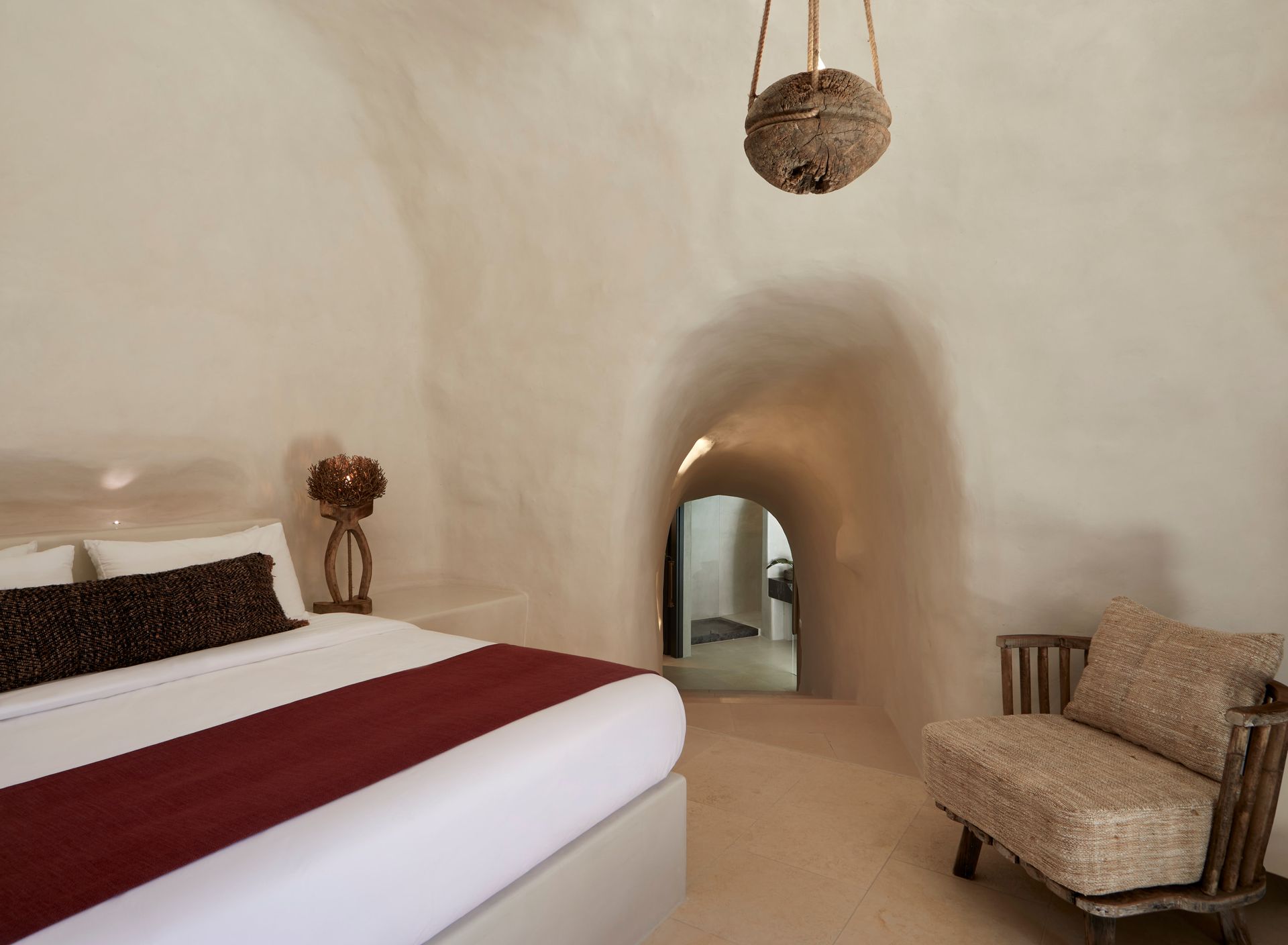 Inspired by Santorini's signature grape variety, known for drawing character from the volcanic soil, this 40/50-square-meter cave suite captures the island's mysterious allure. The primitive cave layout, enhanced by modern design, creates a unique atmosphere where curved walls and vaulted ceilings tell stories of traditional Cycladic architecture. The outdoor space features a stunning 20m² heated pool with therapeutic jacuzzi jets, complemented by luxurious sunbeds. The thoughtfully designed interior showcases charming cave cavities, a sumptuous built-in king-size bed, and a welcoming living area with distinctive furniture pieces. A private wine cellar invites exploration of fine labels, perfect for evening tastings. Modern comforts include autonomous climate control, complimentary Wi-Fi, a mini-fridge, and an espresso maker. The elegant bathroom offers rainfall shower, premium toiletries, plush towels, and slippers. Mere steps away, the estate's infinity pool and Above Bistro await, promising culinary delights against the backdrop of Santorini's legendary sunset.