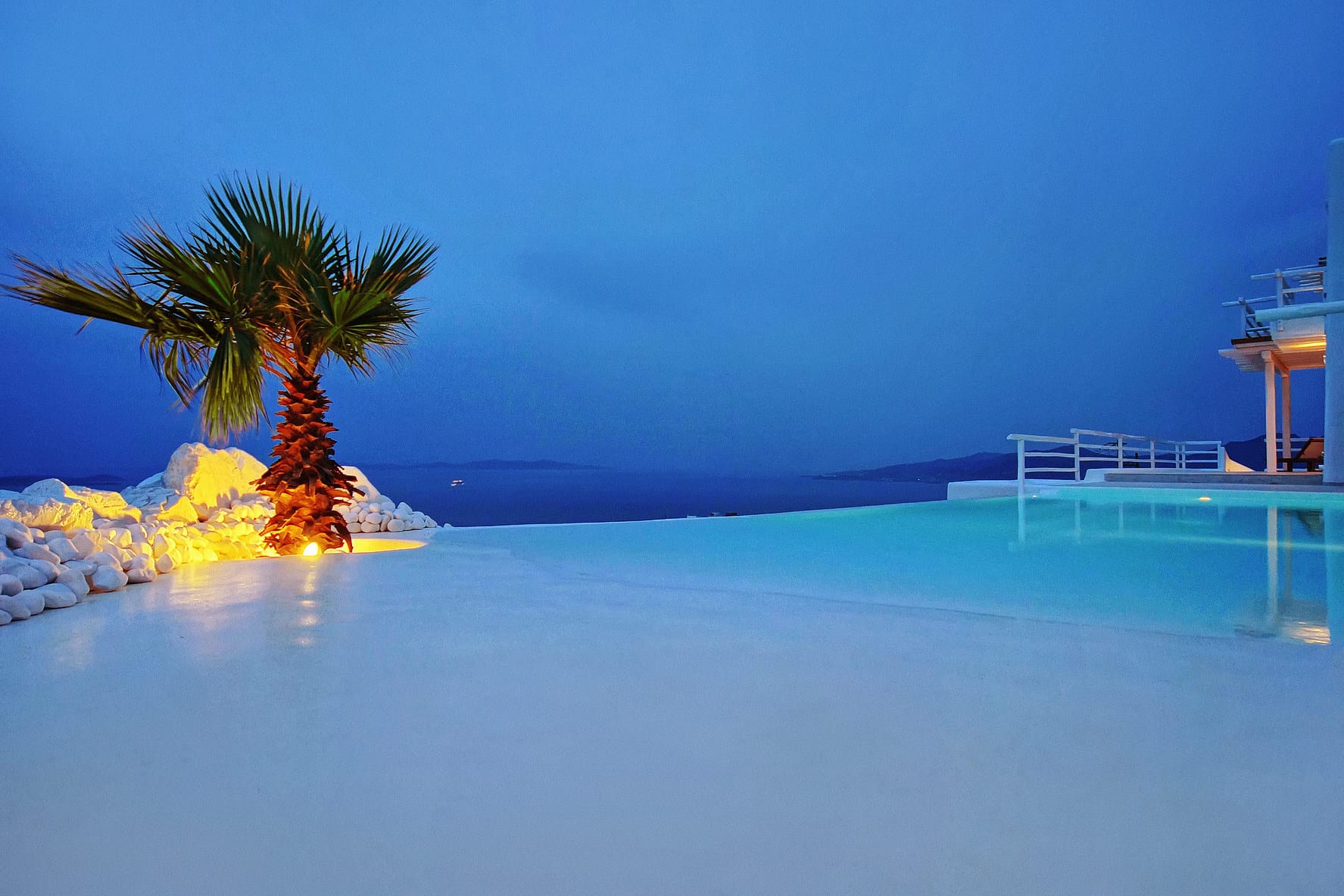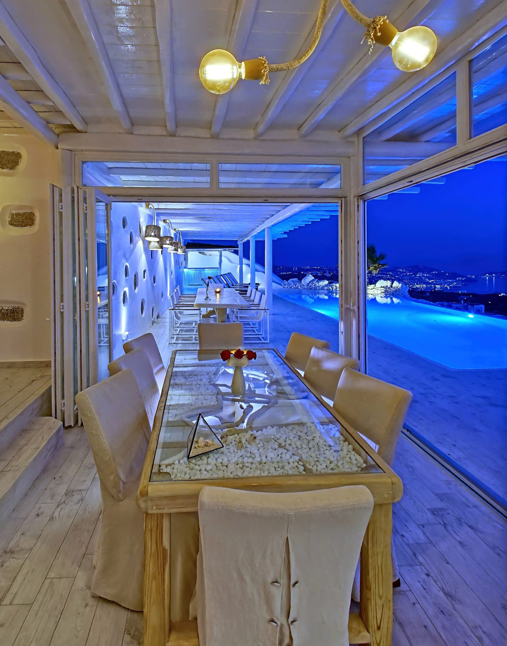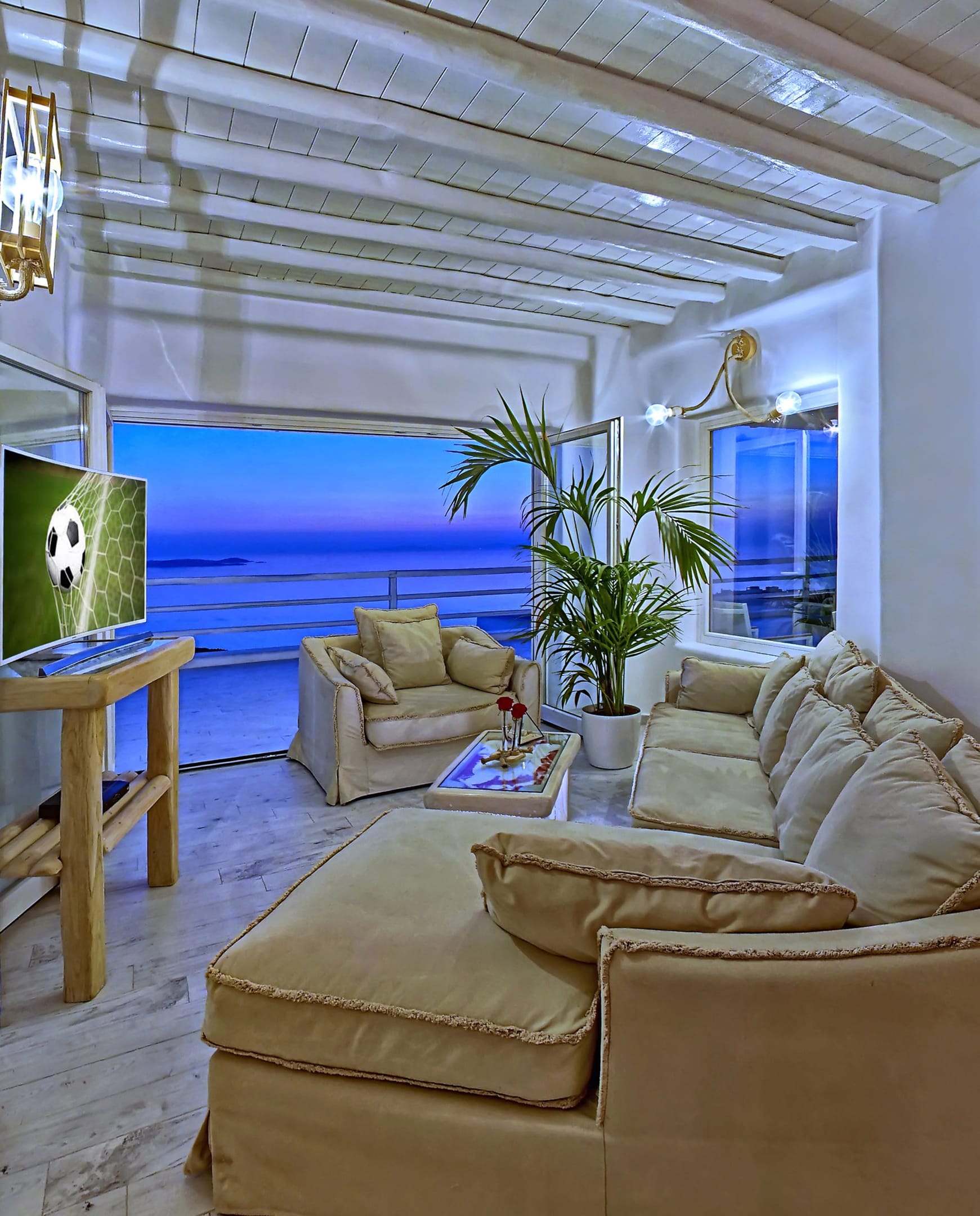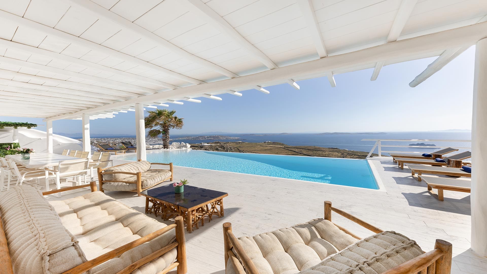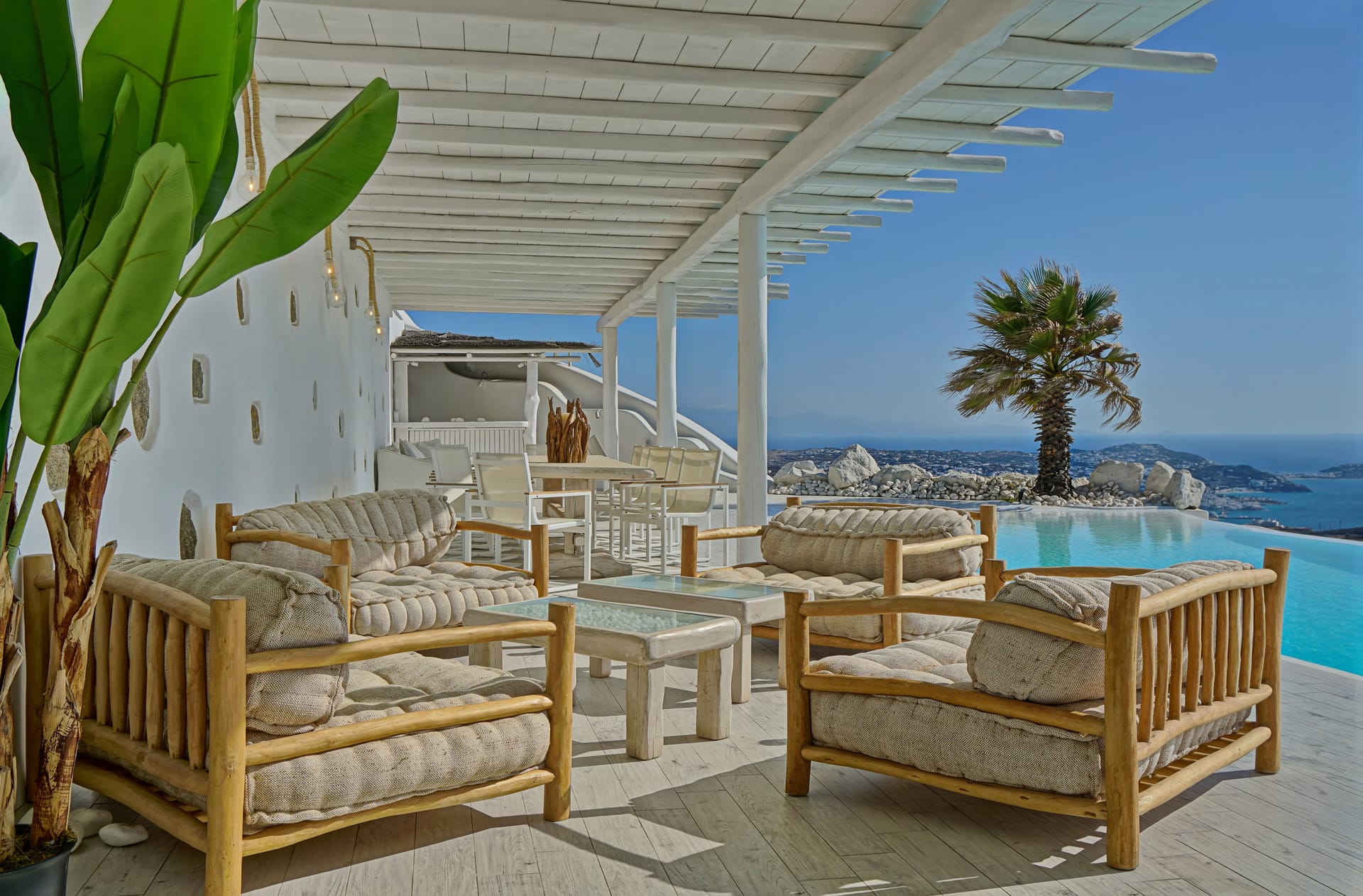 Facilities like a wooden jungle bar in the pool area, offer the guests the ability of sharing amazing moments just in front of the big blue, enjoying parties, gatherings and unforgettable wedding experiences. The Villa is totally covered from the wind-which is extremely important for an island like Mykonos and it offers you an amazing View not only during the day, but during the night as well, as you can relax just in front of the city lights in a totally romantic and peaceful atmosphere.