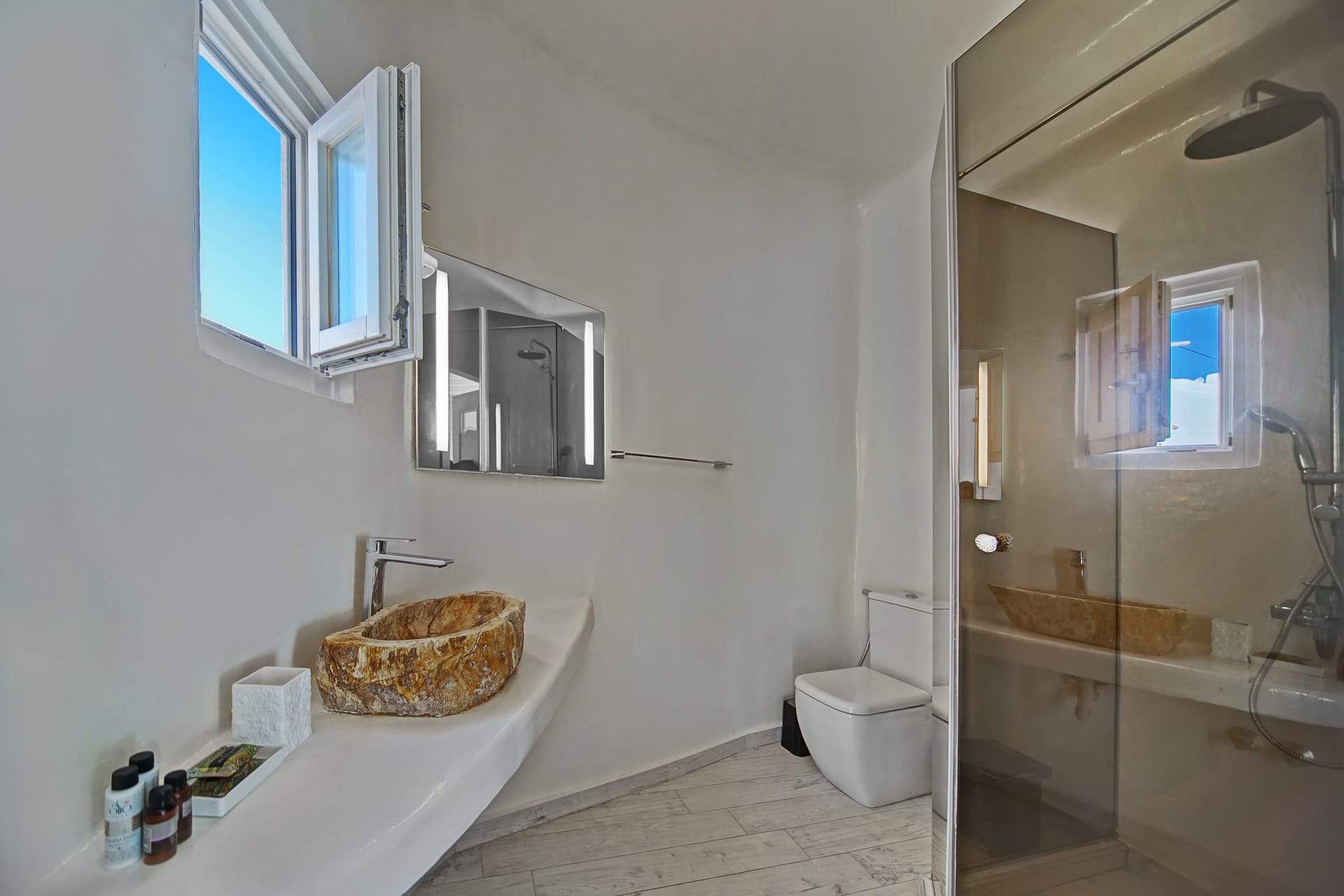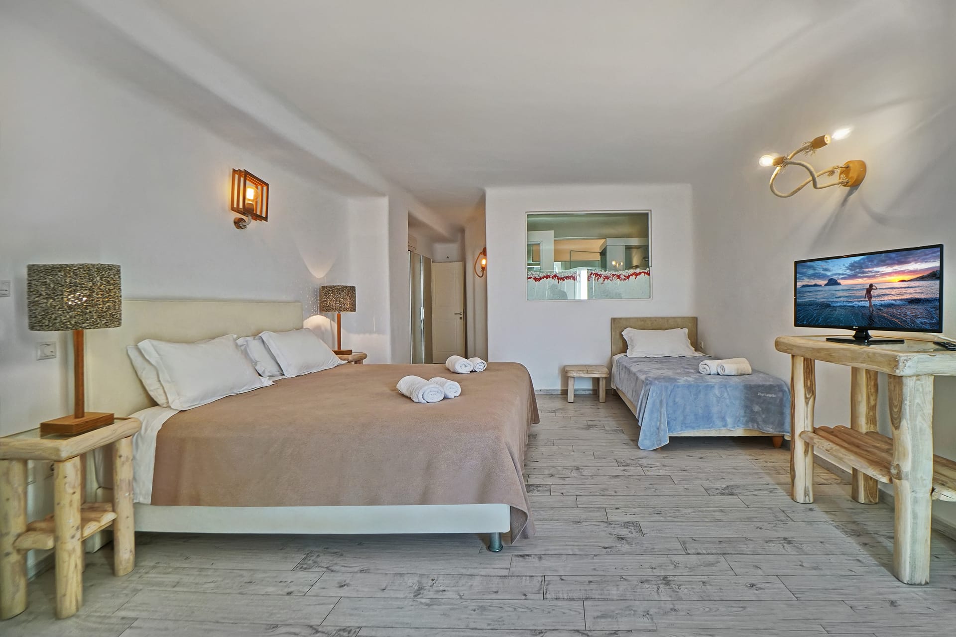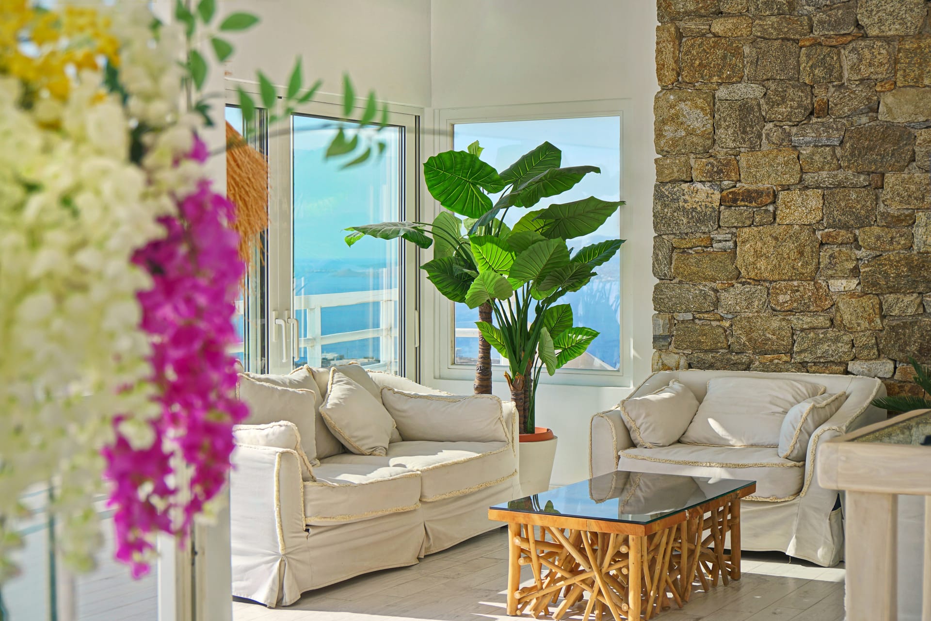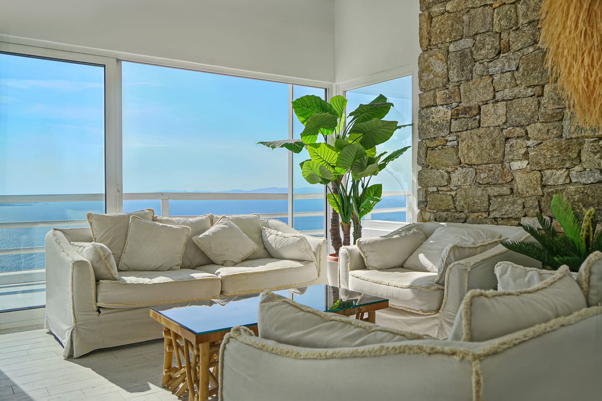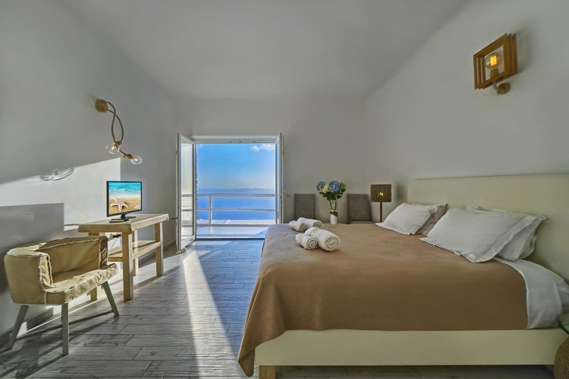 Facilities like a wooden jungle bar in the pool area, offer the guests the ability of sharing amazing moments just in front of the big blue, enjoying parties, gatherings and unforgettable wedding experiences. The Villa is totally covered from the wind-which is extremely important for an island like Mykonos and it offers you an amazing View not only during the day, but during the night as well, as you can relax just in front of the city lights in a totally romantic and peaceful atmosphere.