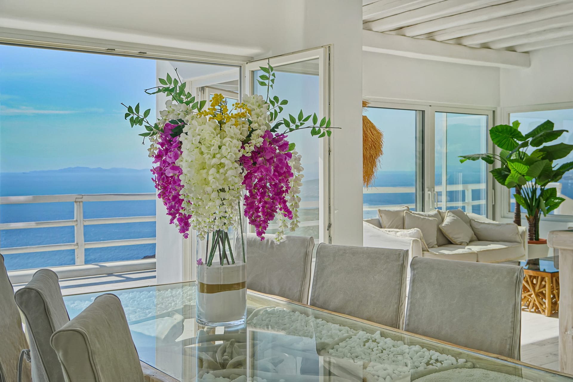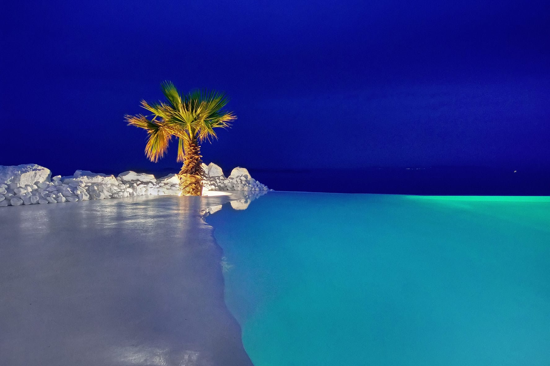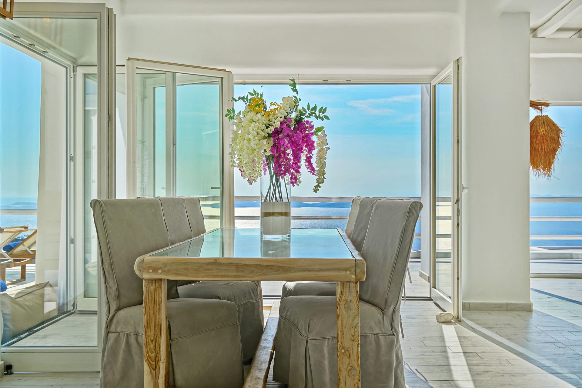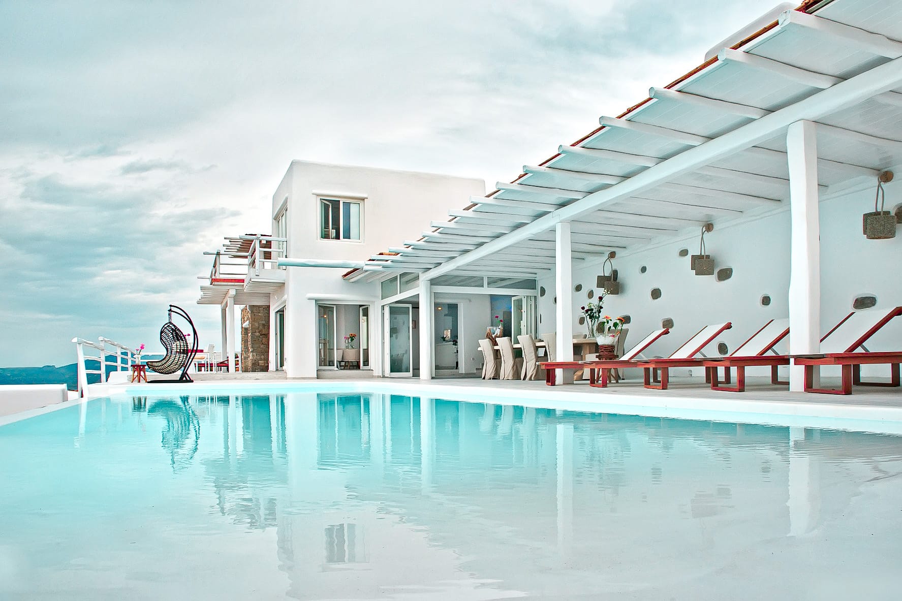 The infinity pool is located on the main level, offering a beach - like shape giving the extraordinary feelling of a tropical retreat in the most cosmopolitan island of Greece, just infrond of the holy spiritual island of Delos.